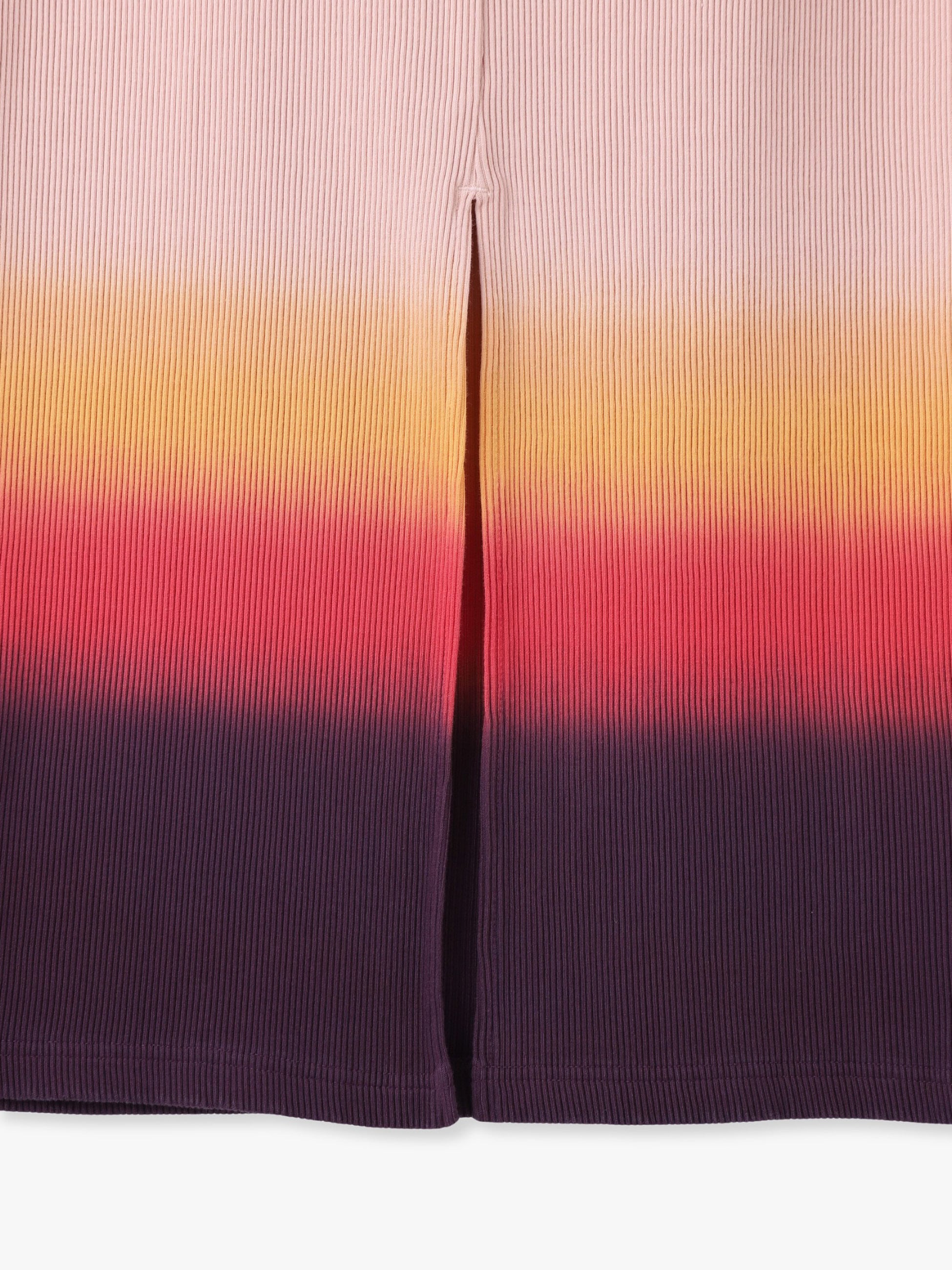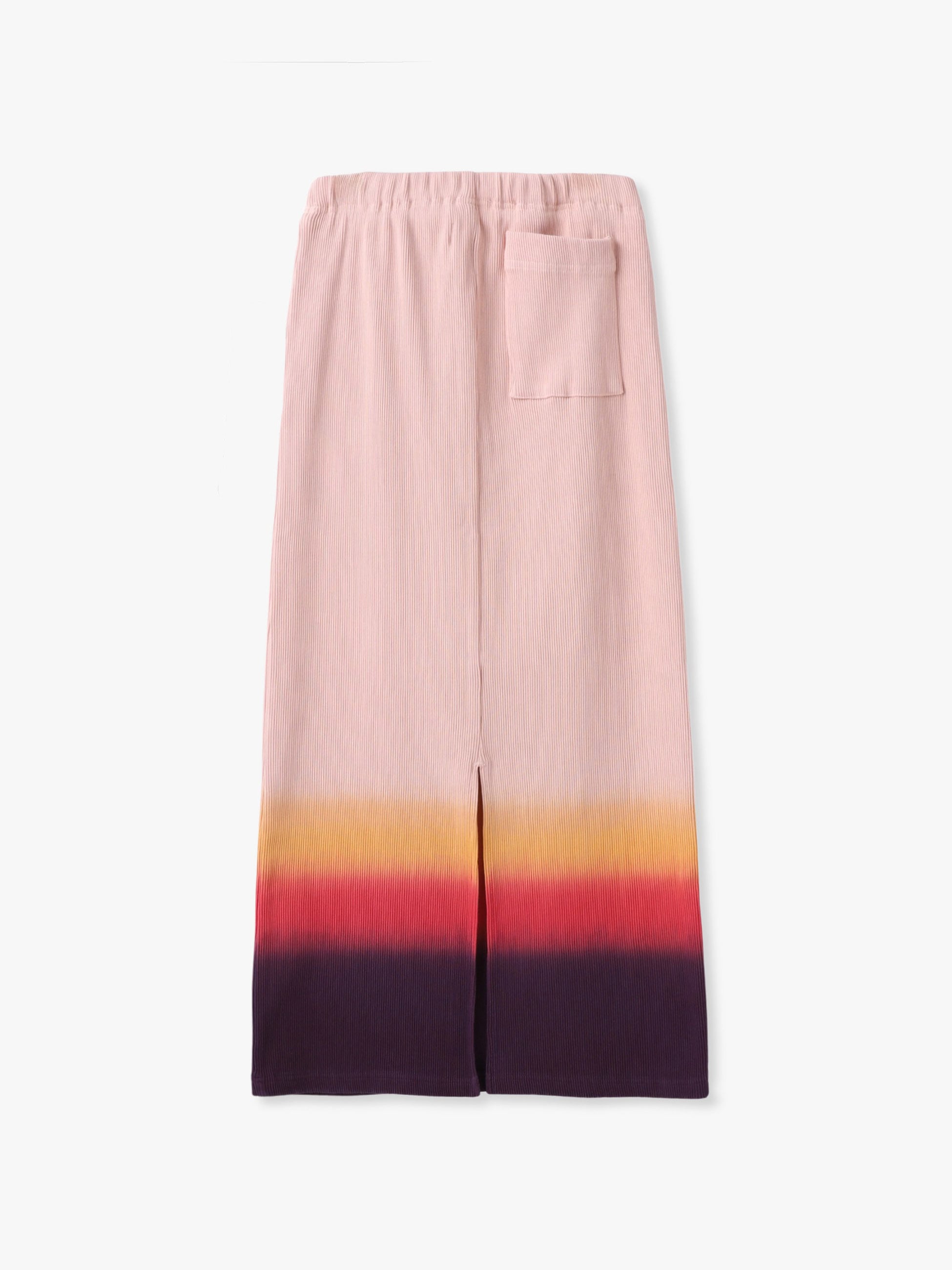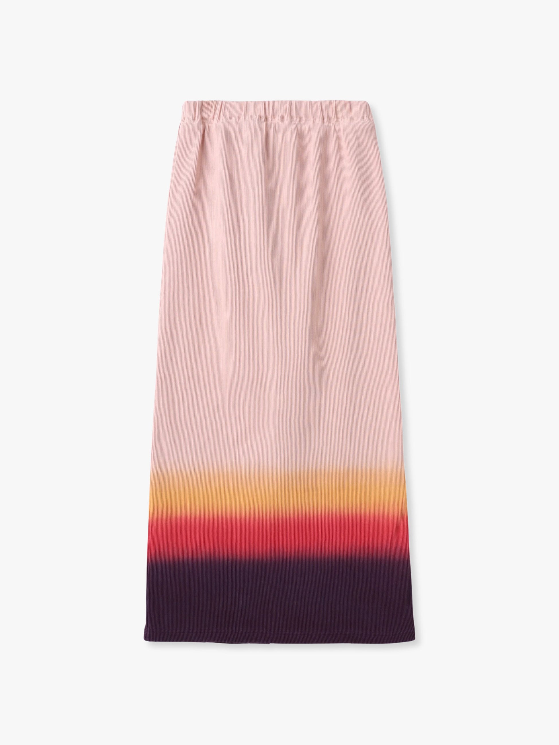厚みのあるリブ生地でデザインしたロングスカートは、淡いピンクをベースに、裾にあしらったグラデーション染めが特徴です。スリットが足捌きを良くし、コットン生地で長いシーズンで活躍します。同シリーズのリブトップスもございます。