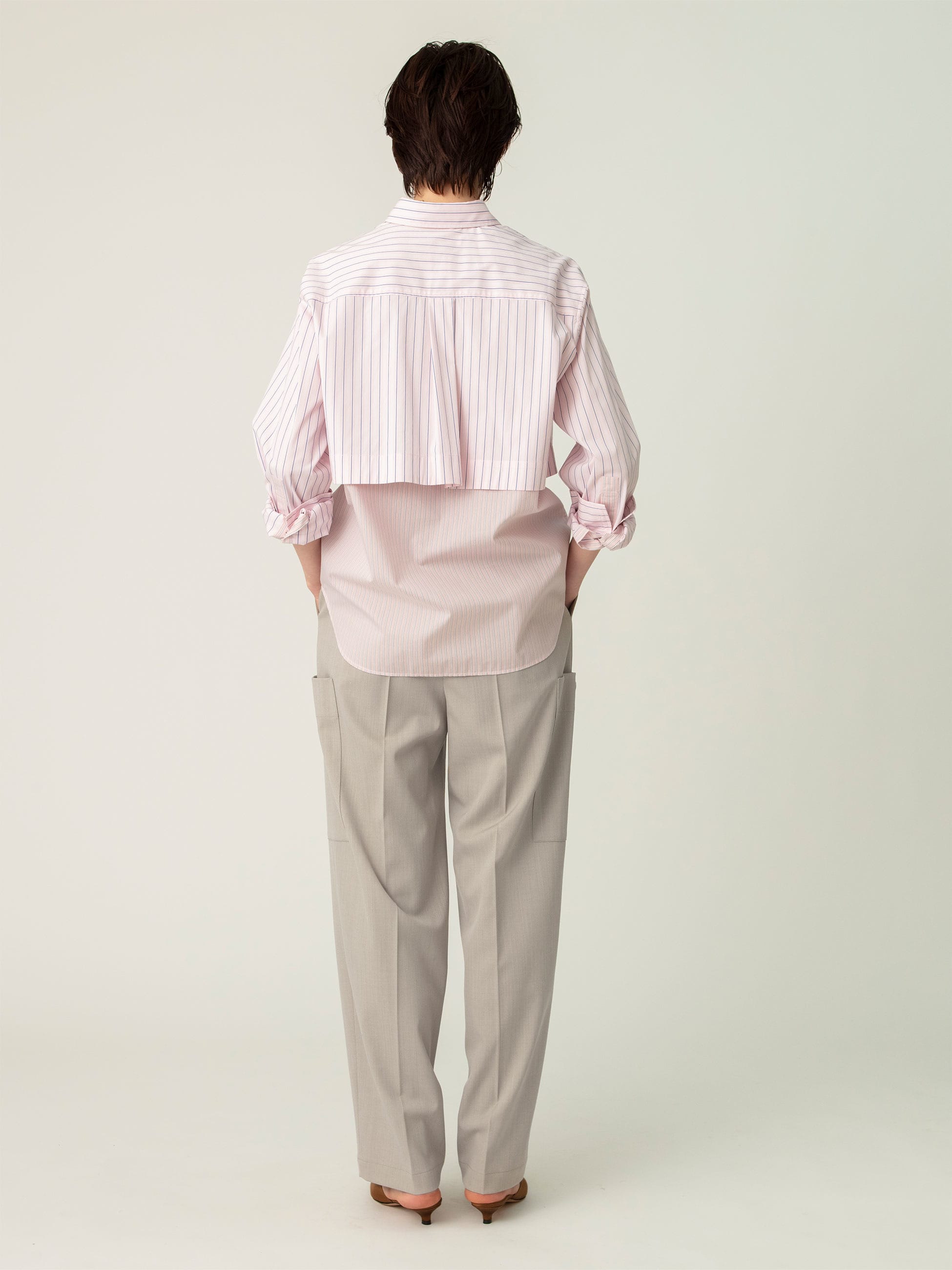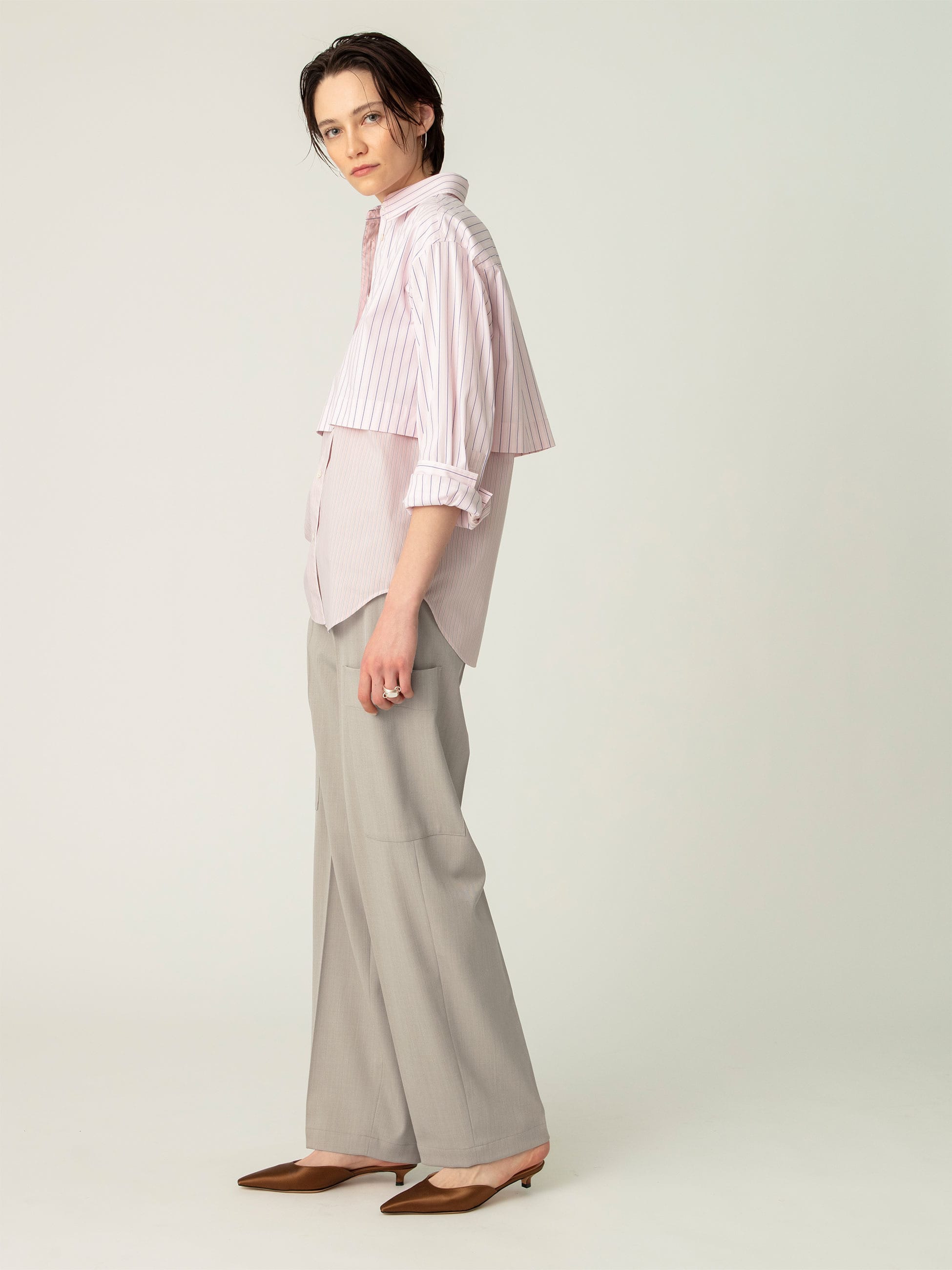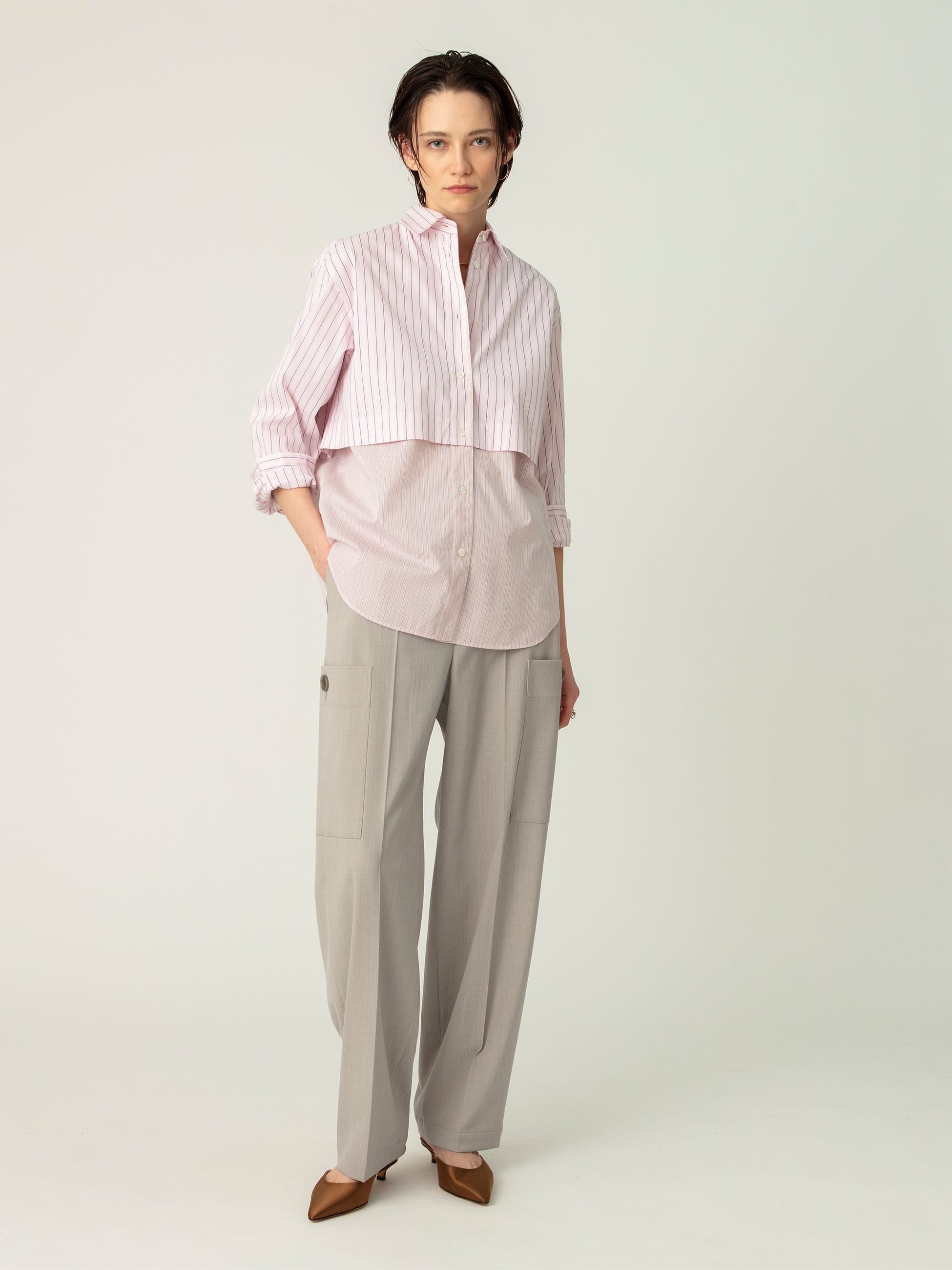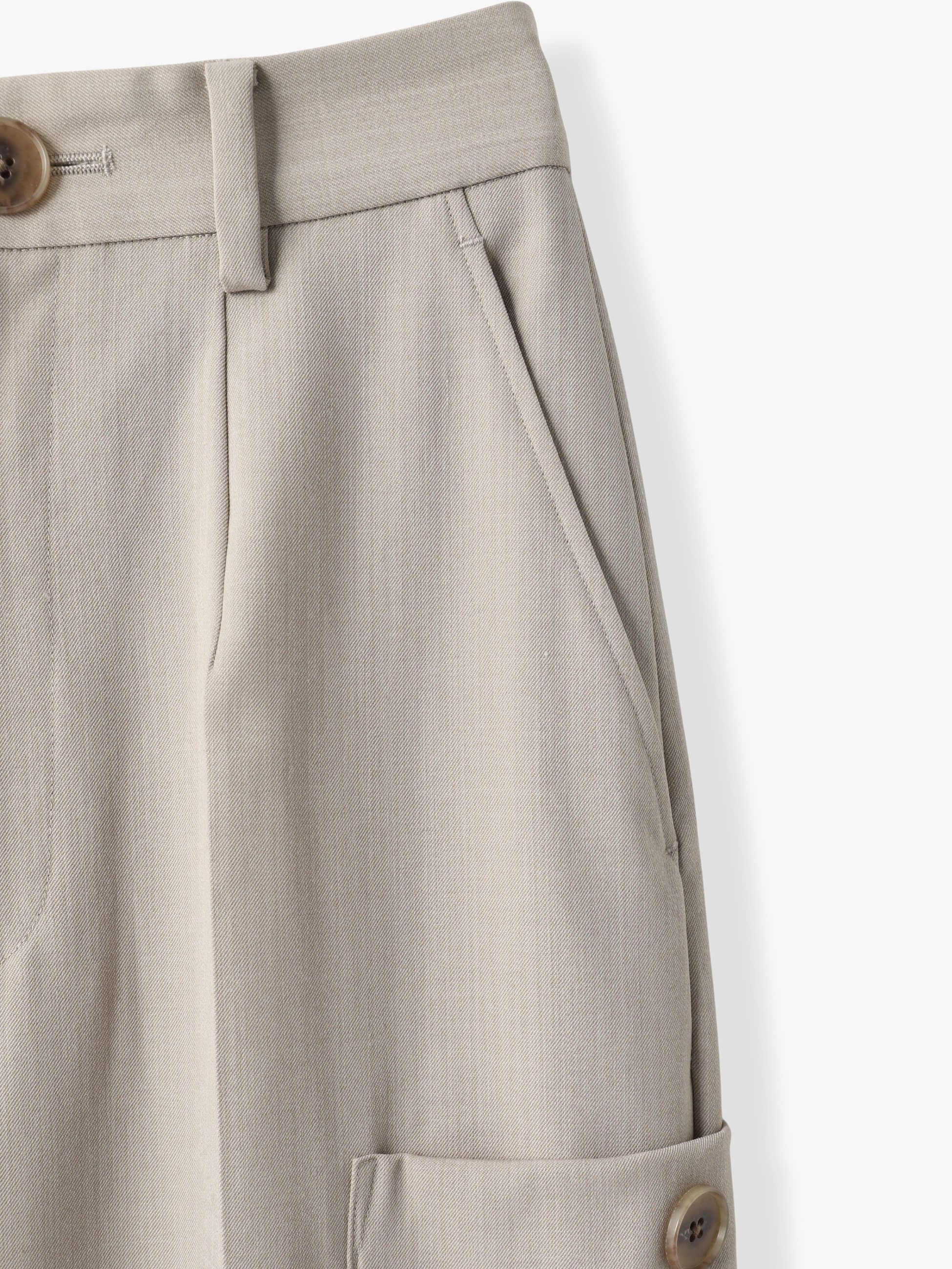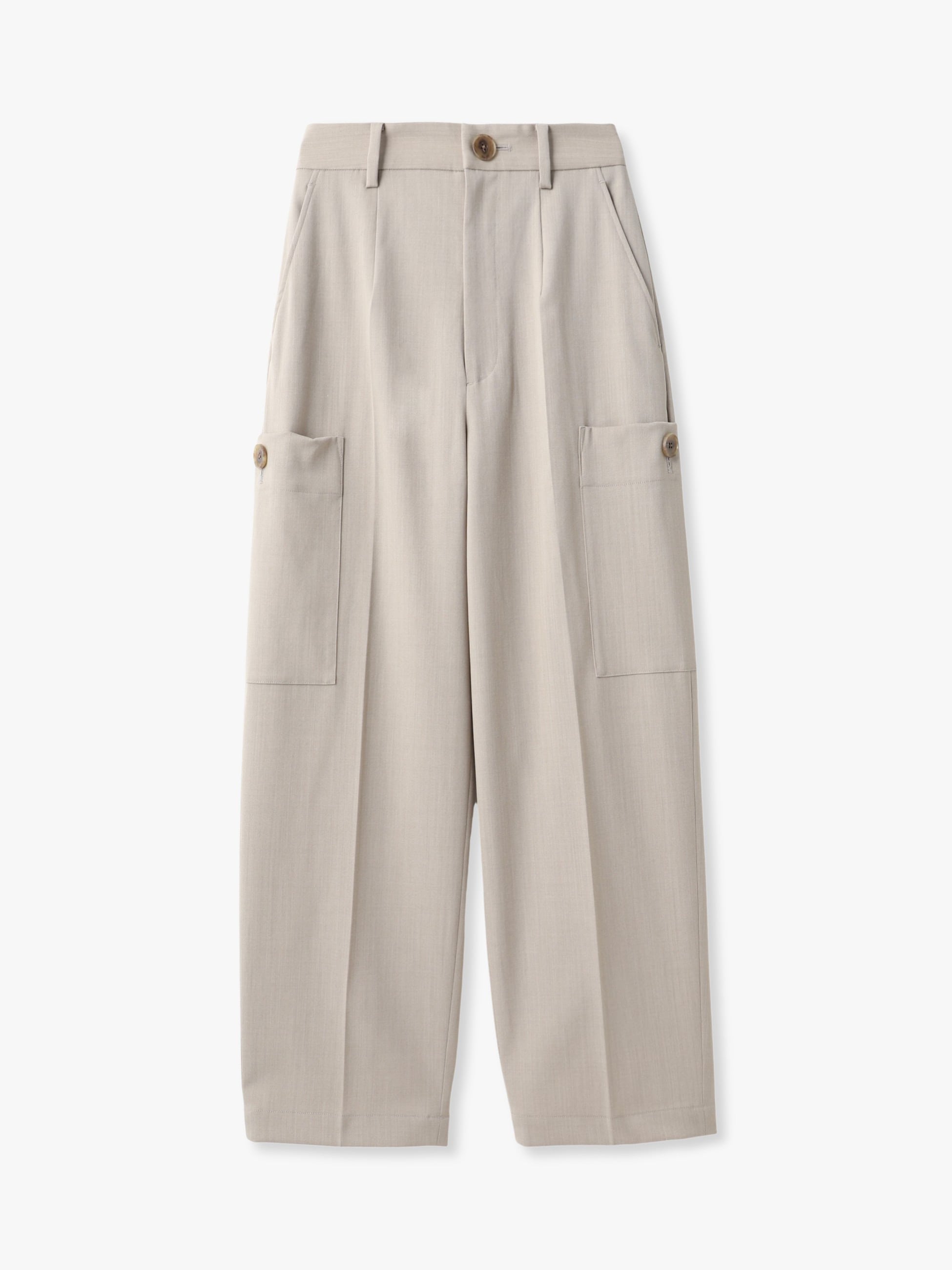 センタープレスを入れたウール混紡のカーゴパンツは、綺麗めなシルエットとルーズな雰囲気が好バランスな1着です。カジュアルなカーゴパンツながら、滑らかでハリのある素材は上品な印象を演出します。ベーシックな2色展開は汎用性が高く、トップスの選択肢も広がります。