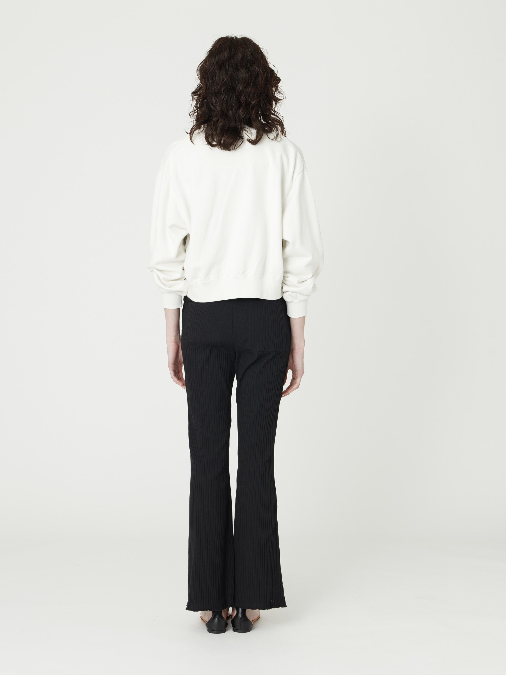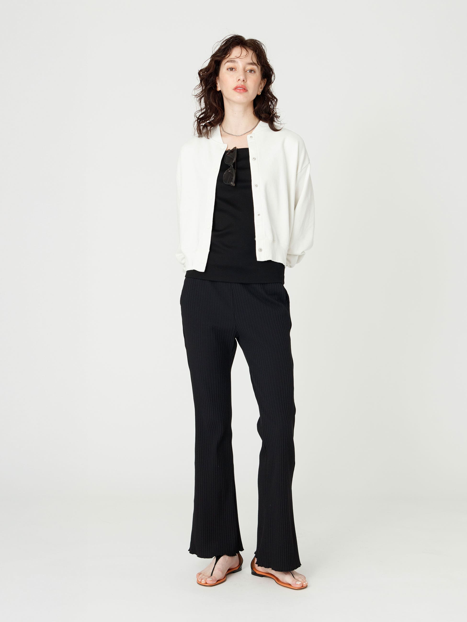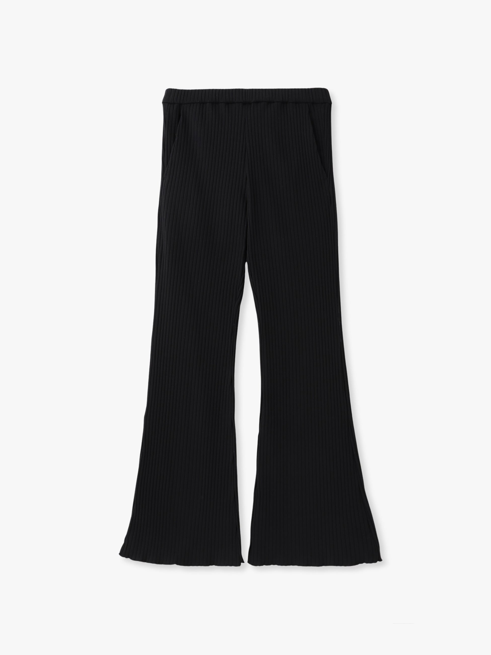 - 心地良いフィット感のリブフレアパンツは、表の綿は強撚でシャリ感を加え、裏のポリエステルは軽さと防シワ性を持たせています。脚のラインをすっきりと長く見せてくれるシルエットで汎用性が高く、デニムやチノパンツとはまた違った雰囲気をお楽しみいただけます。同シリーズのカーディガンとのセットアップもおすすめです。