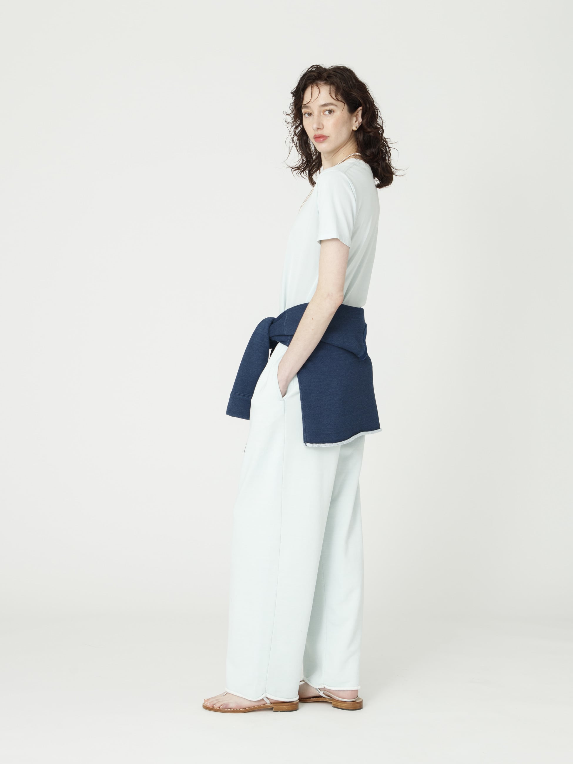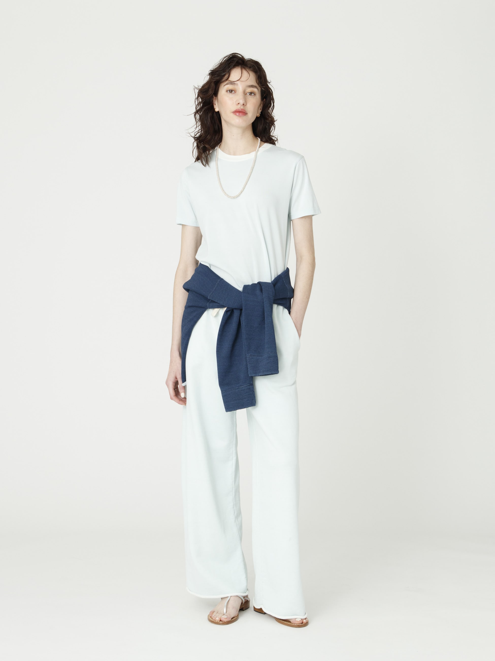 - インディゴの美しさを、リラックスしたムードで着用いただけるカットソーシリーズが登場です。細番手のオーガニックコットン糸に、シルケット加工、枷染めを施すことで生まれる上品な風合いを引き立てました。裏毛素材のスウェットパンツは、ゆったりとしたシルエットに、カットオフのディティールが、女性らしい抜け感を演出します。その他のインディゴ染めシリーズとセットアップで着用したり、色の濃淡を楽しむスタイリングも素敵です。