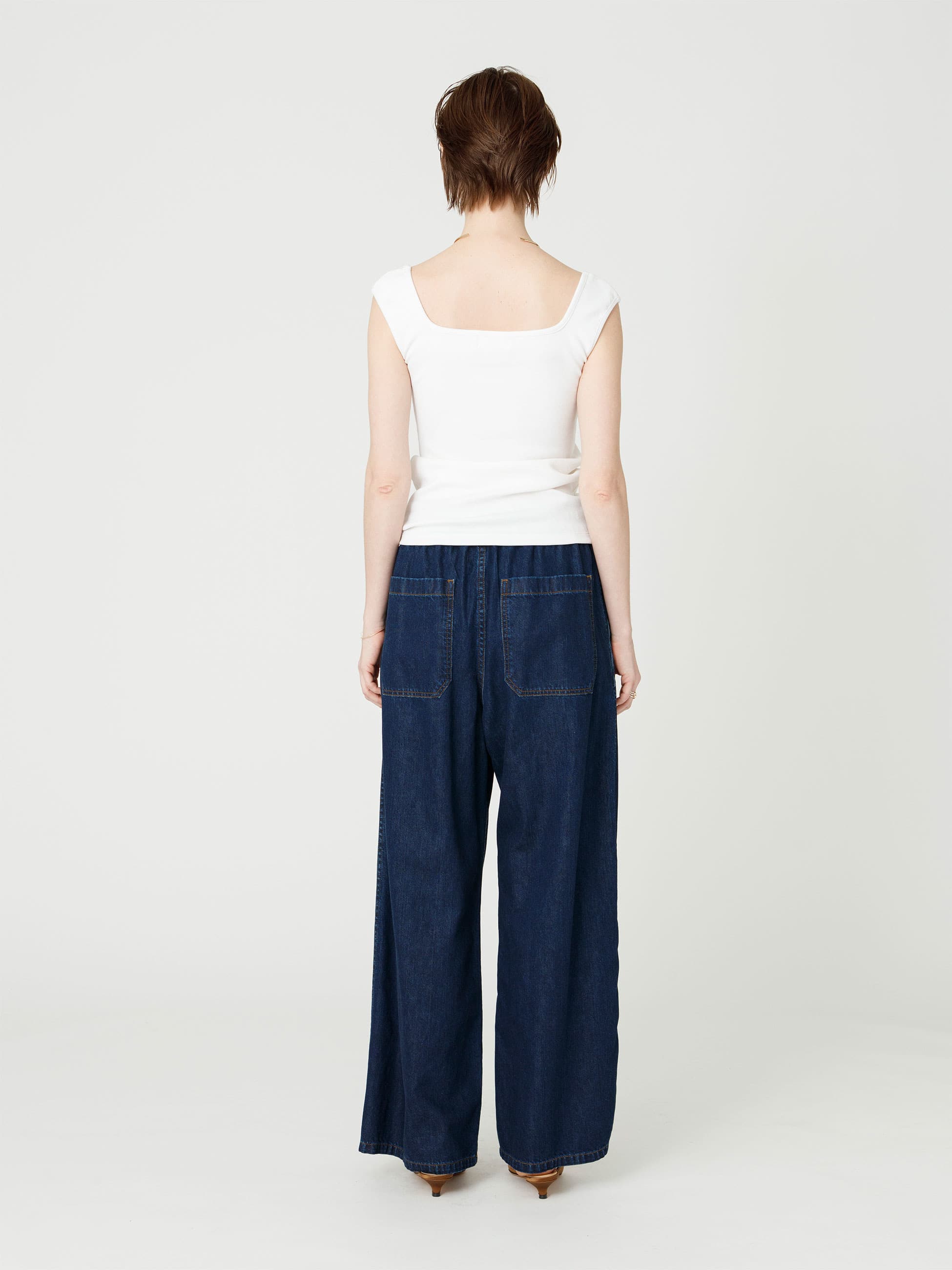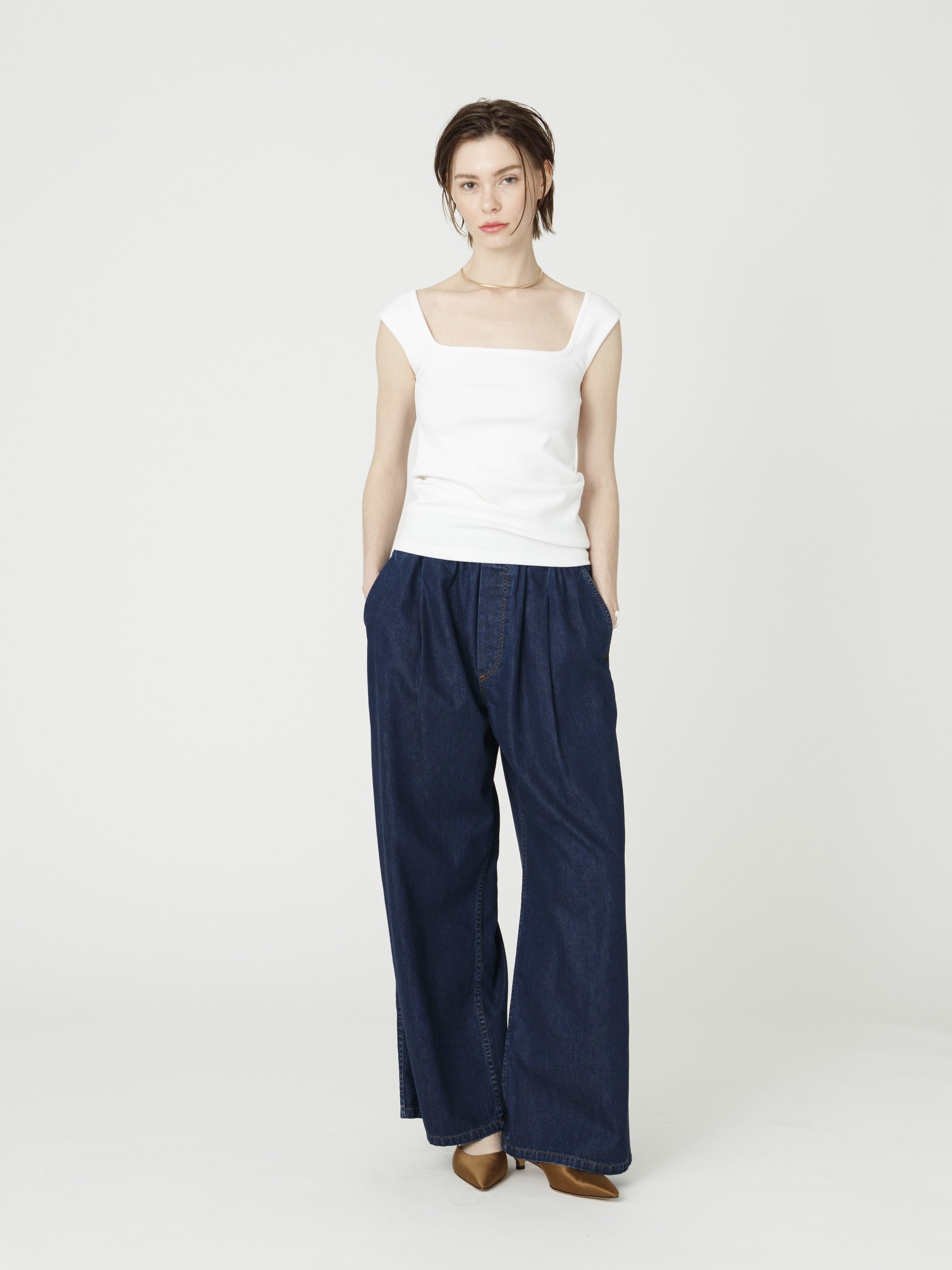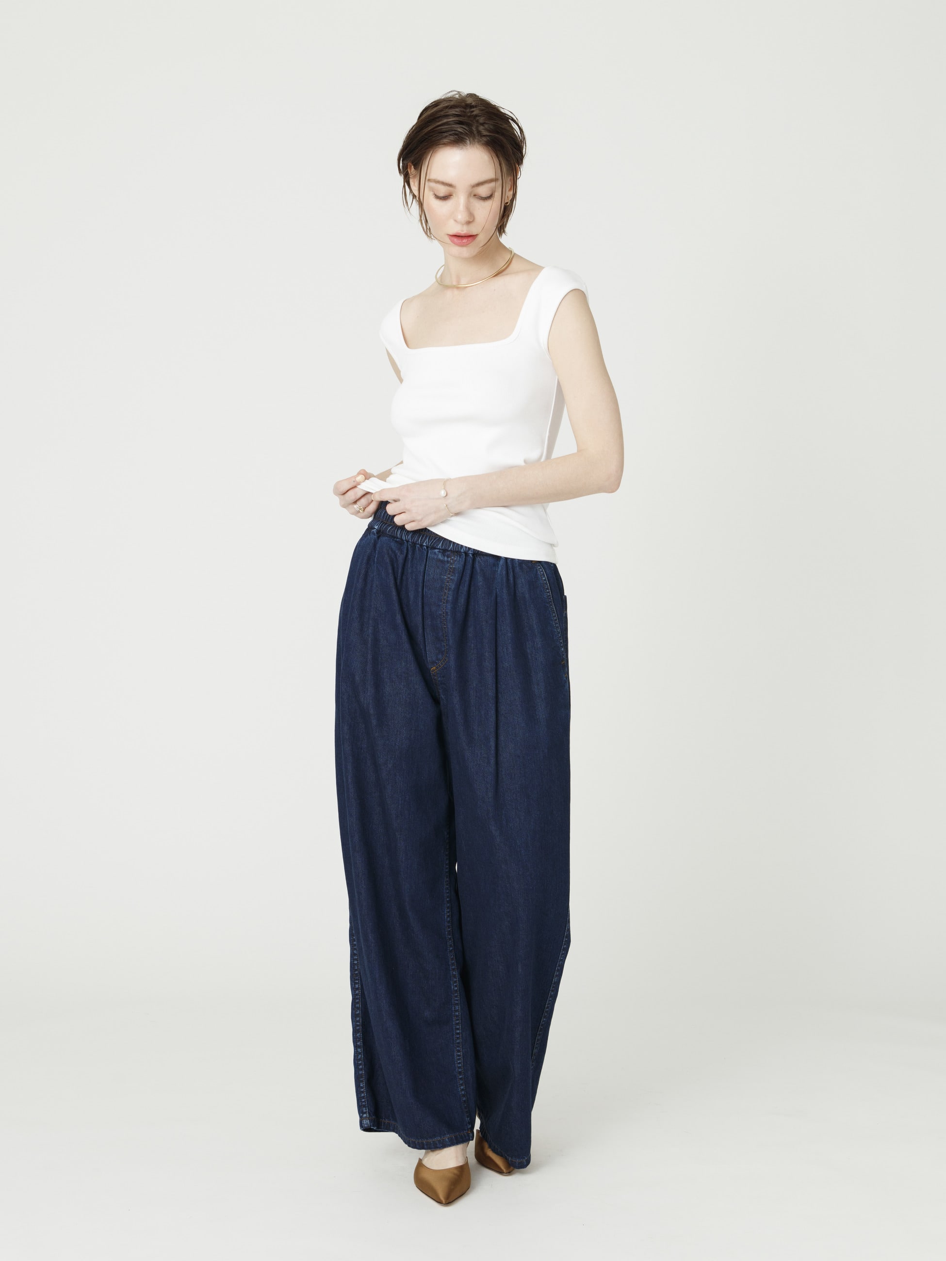 ゆったりとしたワイドシルエットのデニムパンツです。9.5ozの薄手のコットンテンセルデニムを使用し、程よい落ち感と柔らかい風合いを兼ね備えています。さらっとした肌触りなので、暑い時期にも快適な穿き心地です。ほのかに光沢感があるため、カジュアルながらも上品な印象の1枚です。