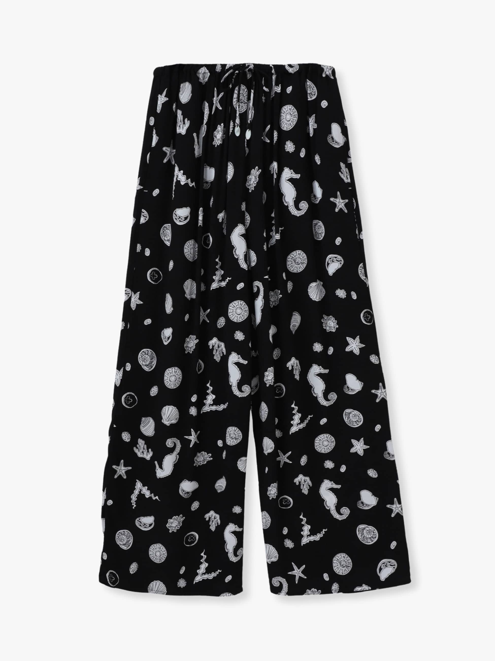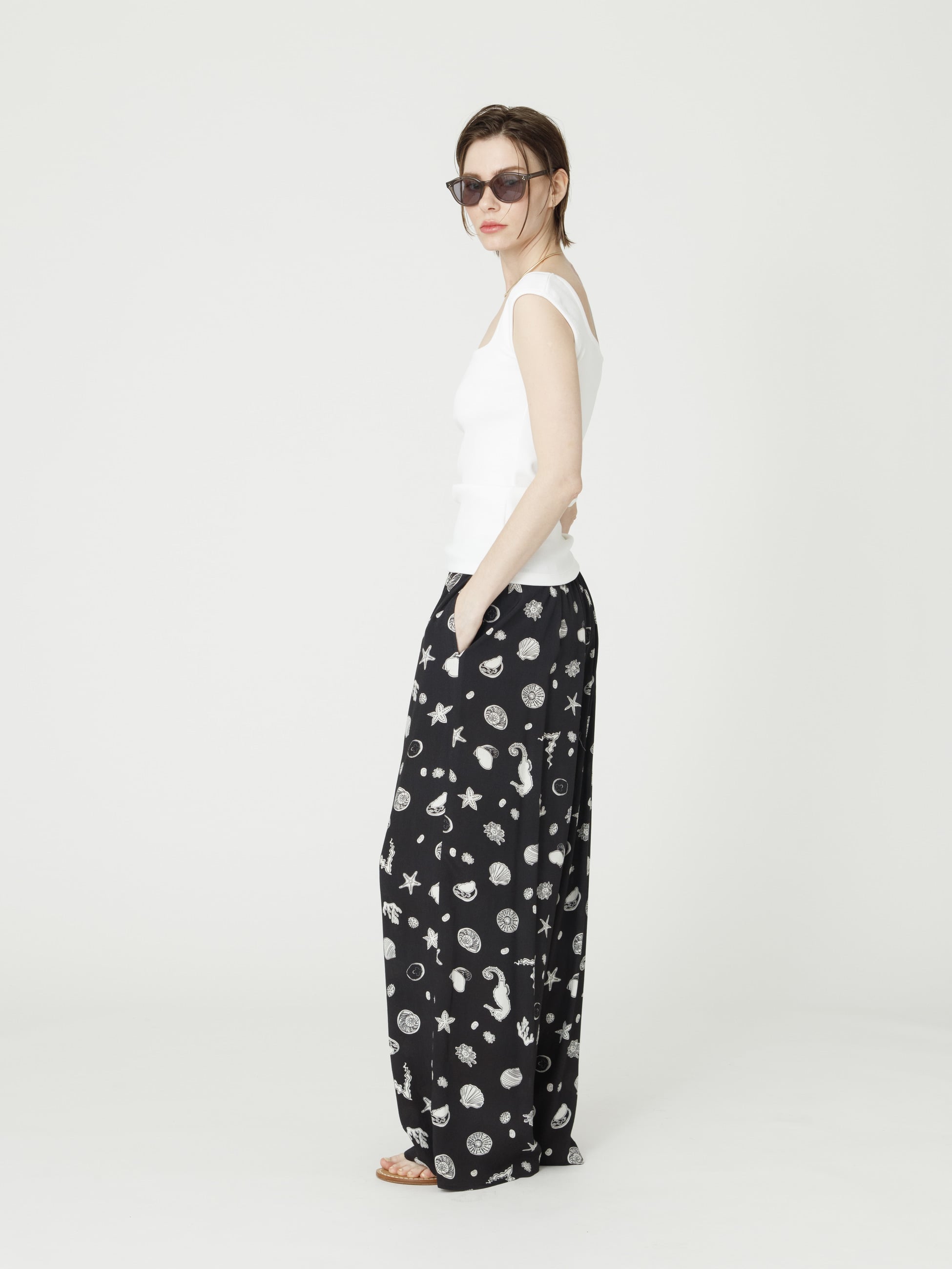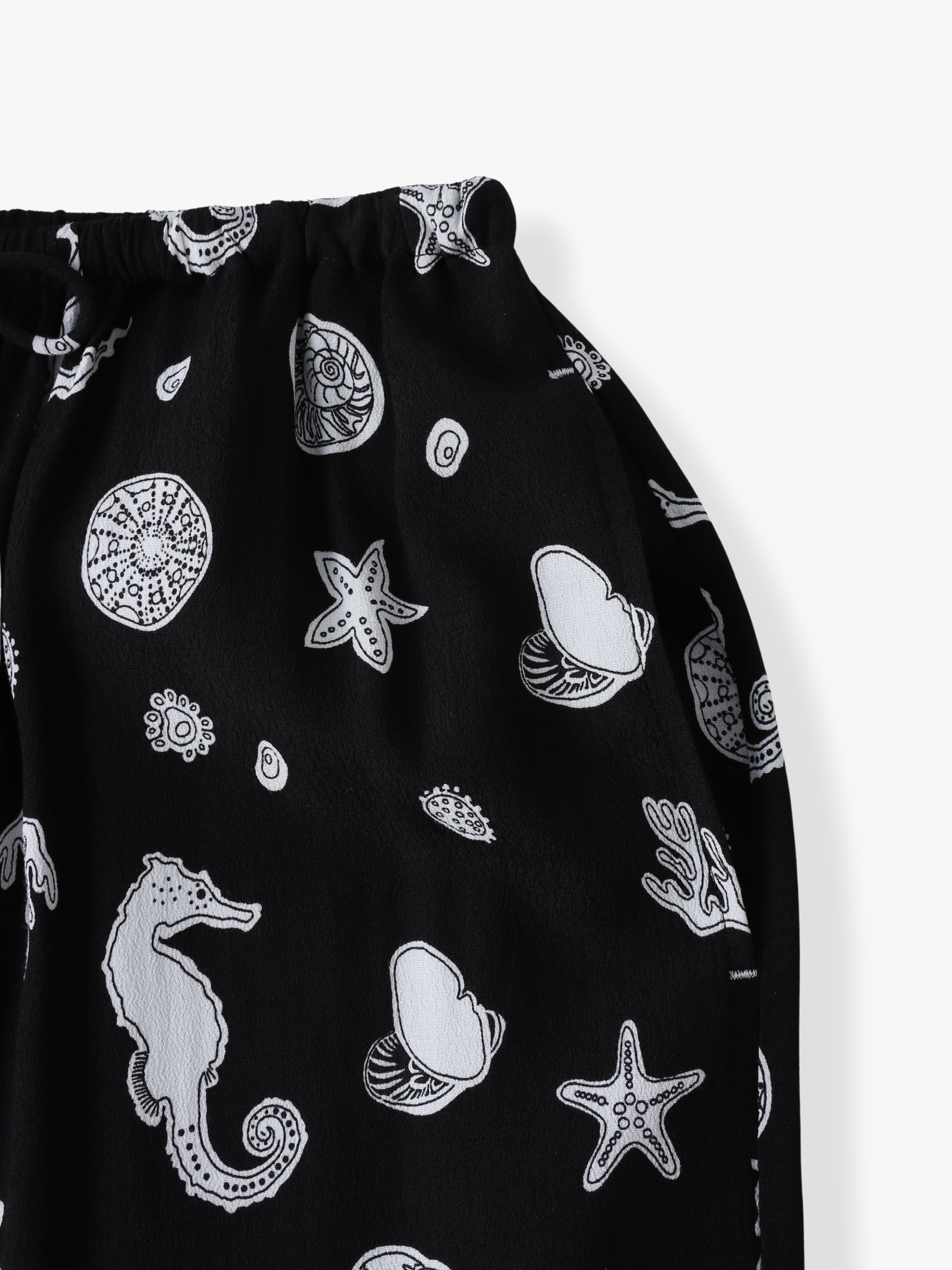 26SSシーズンテーマ「LUCA」を、深海に息づく生物たちの世界観で表現したシリーズです。たっぷりとギャザーをとったイージーパンツは、ウエストがゴム仕様のリラクシーな穿き心地で、ウエストのドローコードのシェルパーツがさりげないポイントに。シックなブラックをベースに、タツノオトシゴやイソギンチャク、オウムガイ、ヒトデ、サンゴ、クラゲなど、海の生き物たちを愛らしく描いたプリントを施し、遊び心と大人っぽさを兼ね備えた一着です。同シリーズのワンピーススカートもございます。