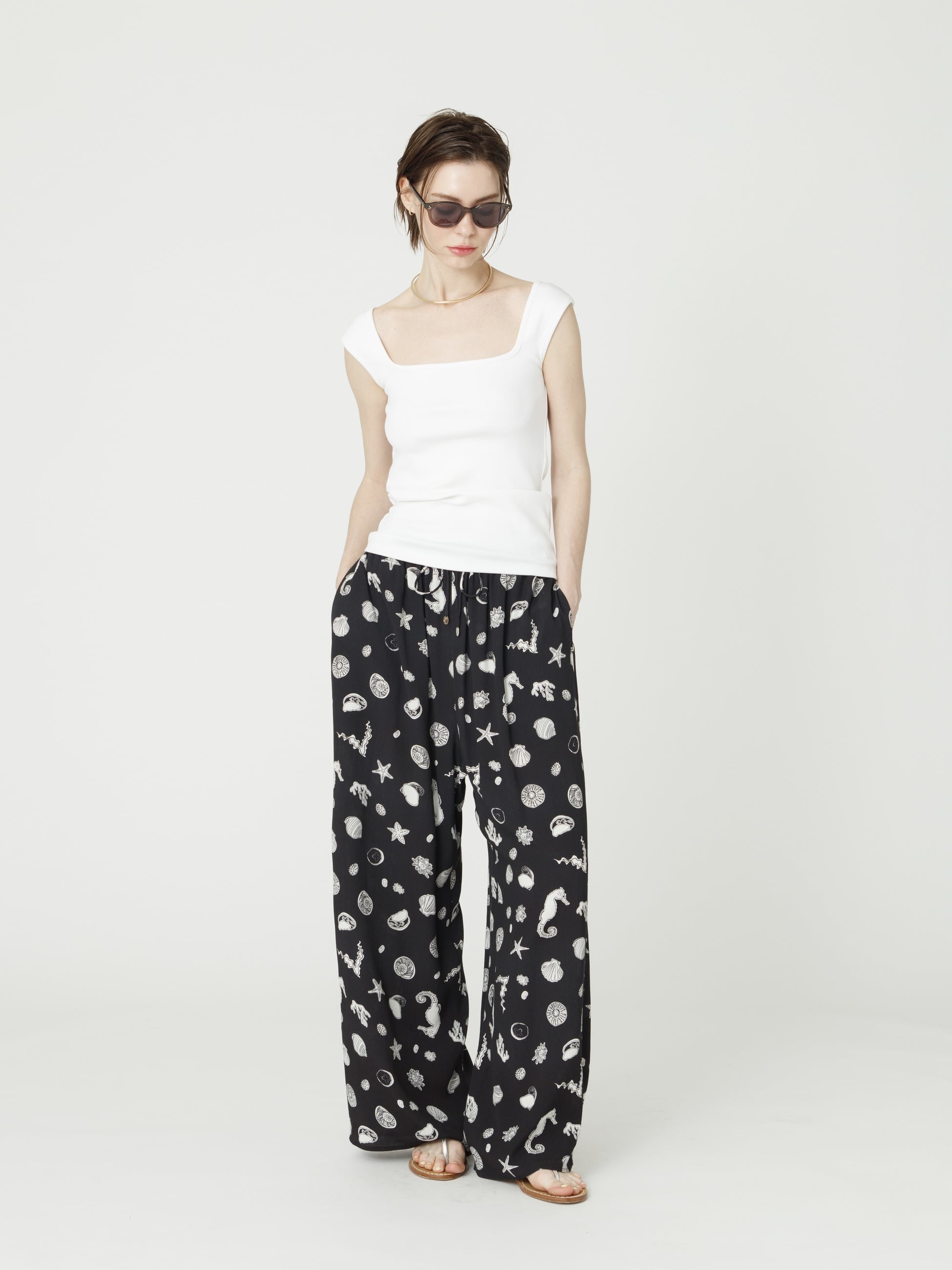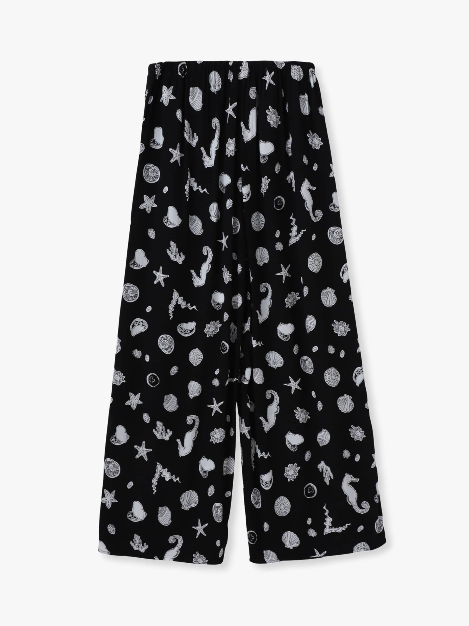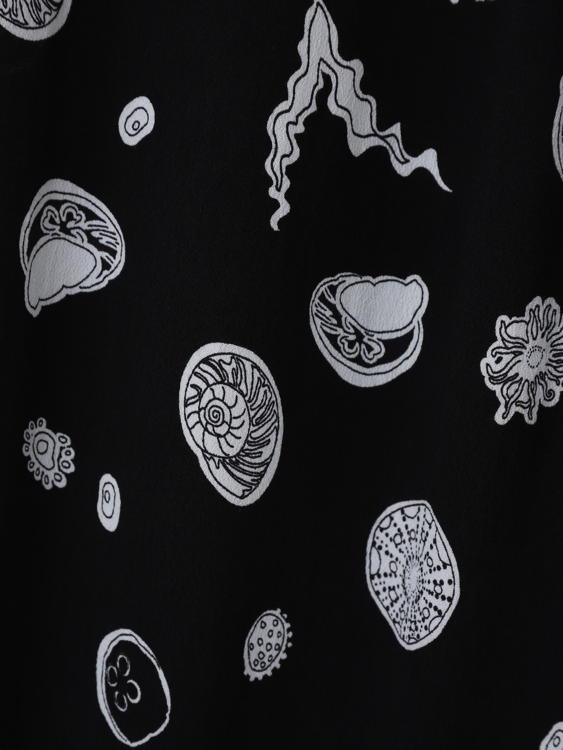 26SSシーズンテーマ「LUCA」を、深海に息づく生物たちの世界観で表現したシリーズです。たっぷりとギャザーをとったイージーパンツは、ウエストがゴム仕様のリラクシーな穿き心地で、ウエストのドローコードのシェルパーツがさりげないポイントに。シックなブラックをベースに、タツノオトシゴやイソギンチャク、オウムガイ、ヒトデ、サンゴ、クラゲなど、海の生き物たちを愛らしく描いたプリントを施し、遊び心と大人っぽさを兼ね備えた一着です。同シリーズのワンピーススカートもございます。
