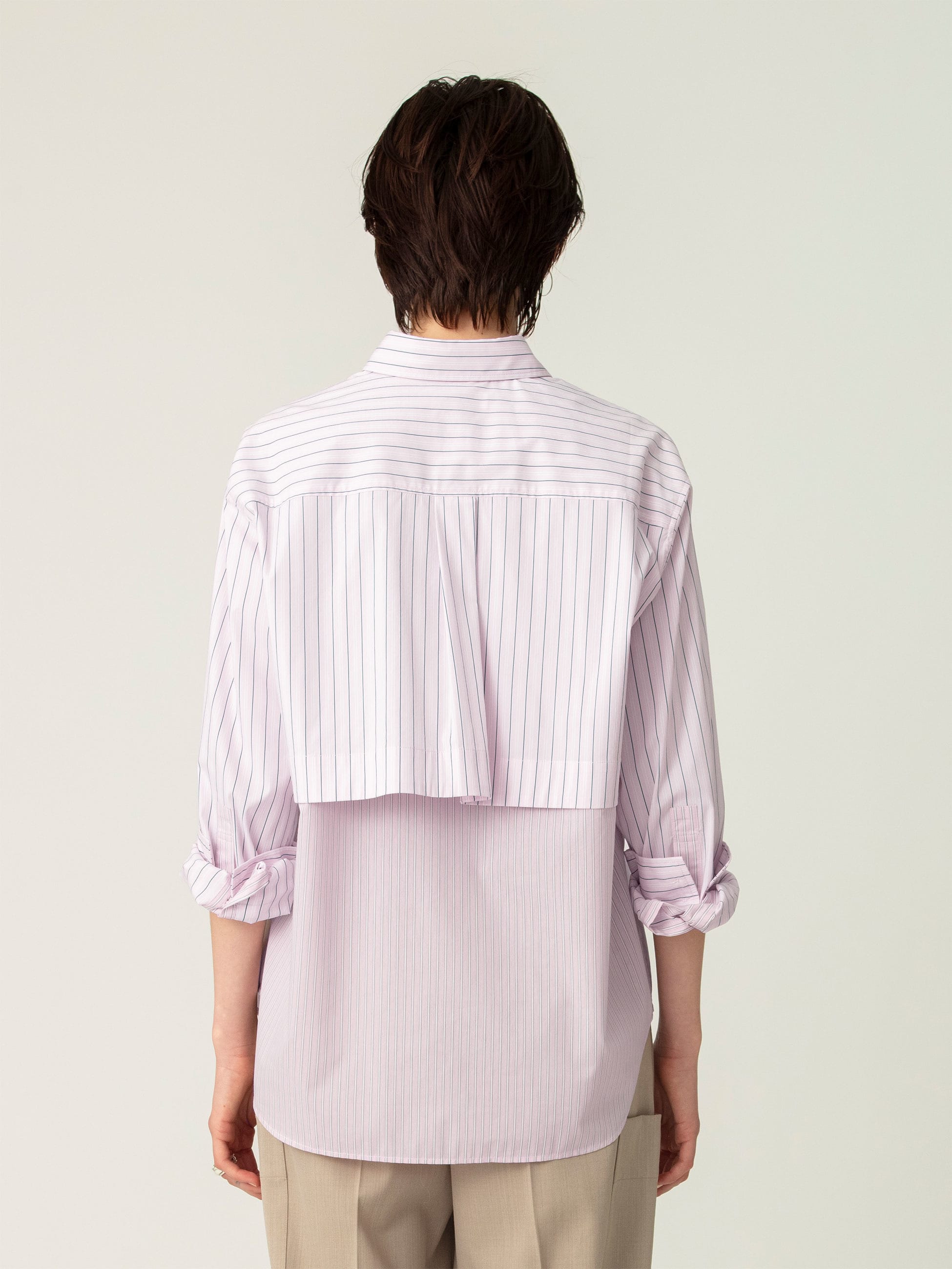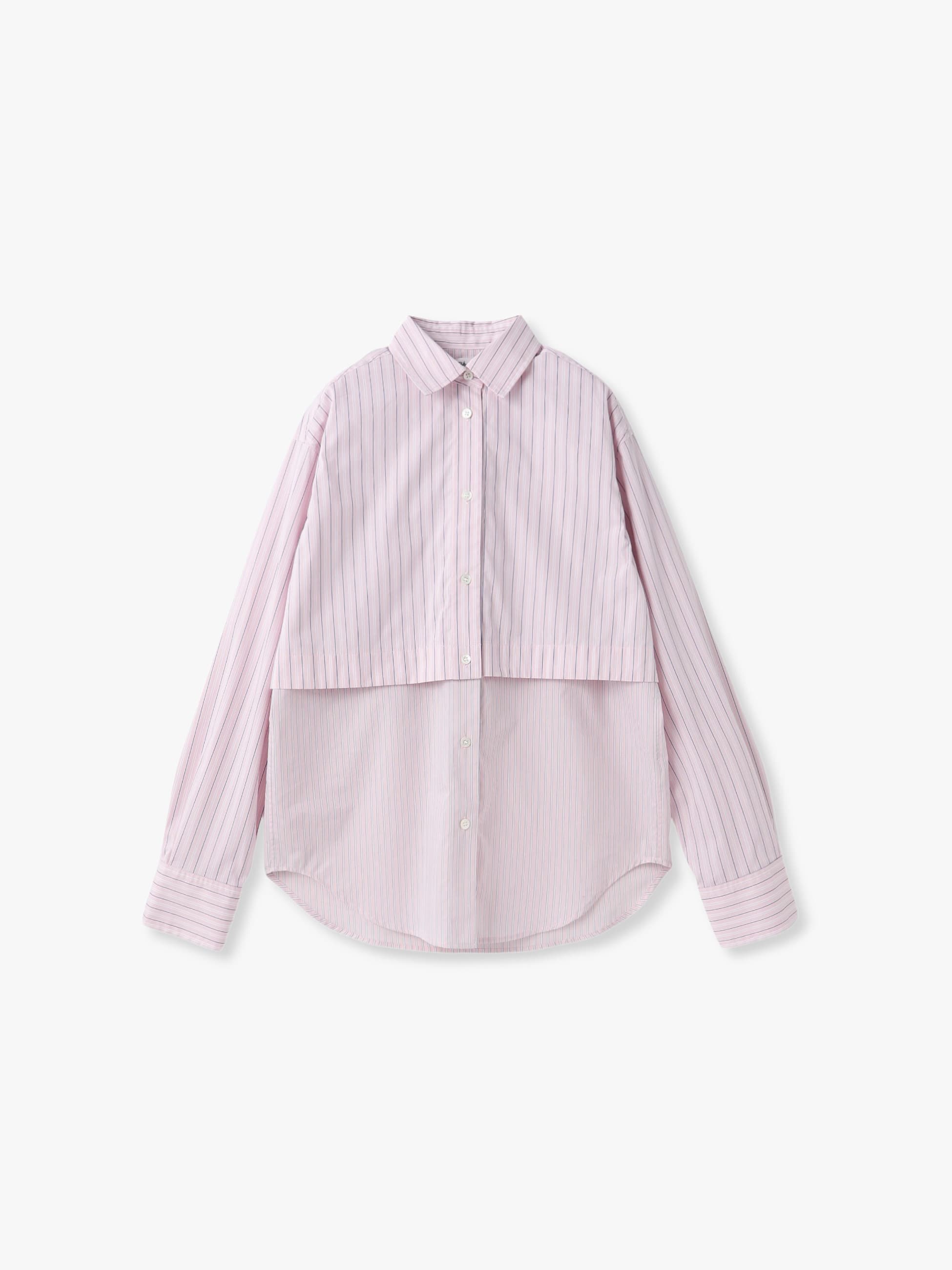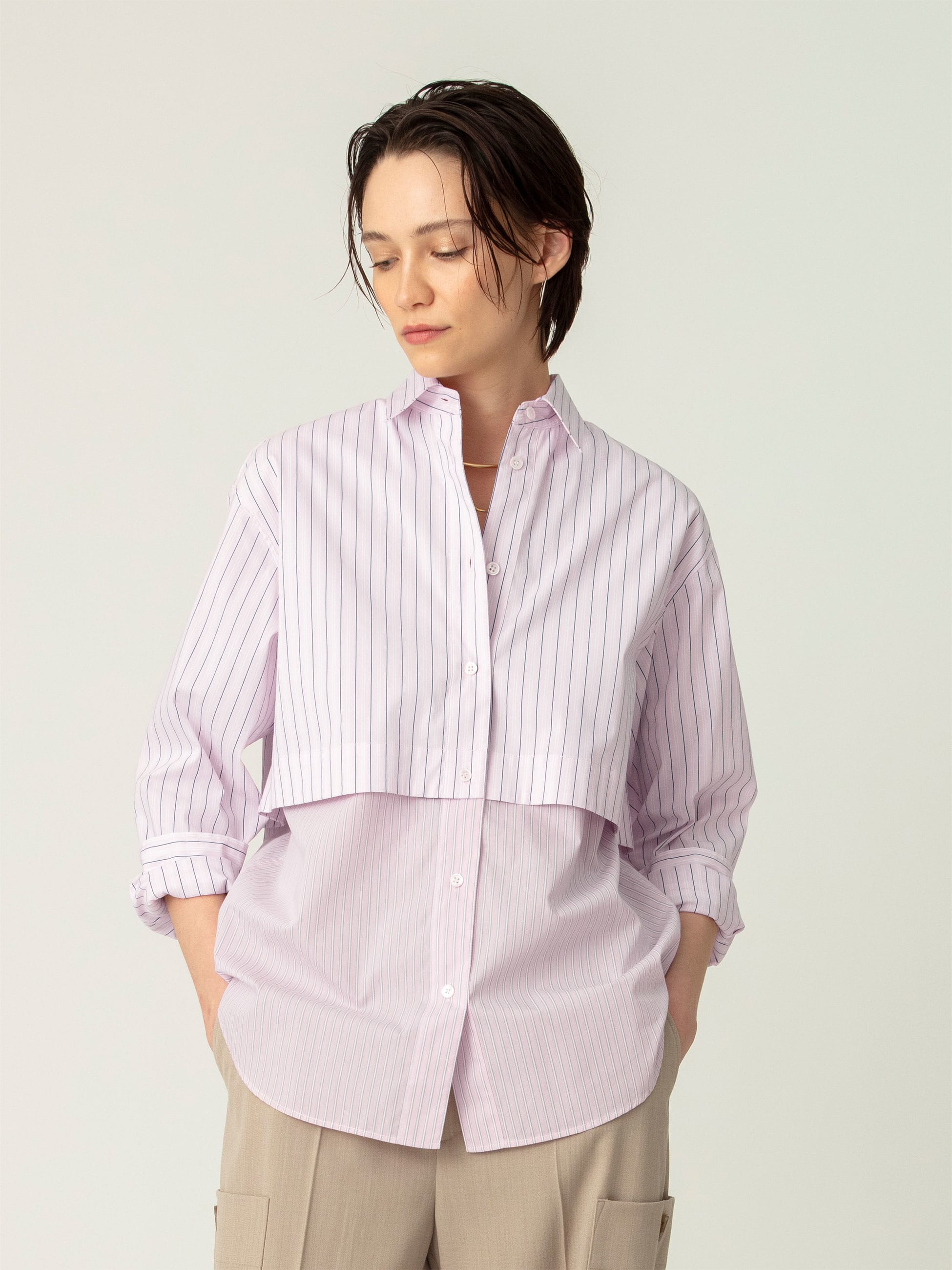 - 異なるストライプ柄のシャツをレイヤードしたようなデザインが新鮮なストライプシャツが登場です。春の装いにもぴったりなブルーとピンクの2色展開で、デニムやスウェットなど、シンプルなボトムを合わせるだけで遊び心のあるスタイリングをお楽しみいただけます。