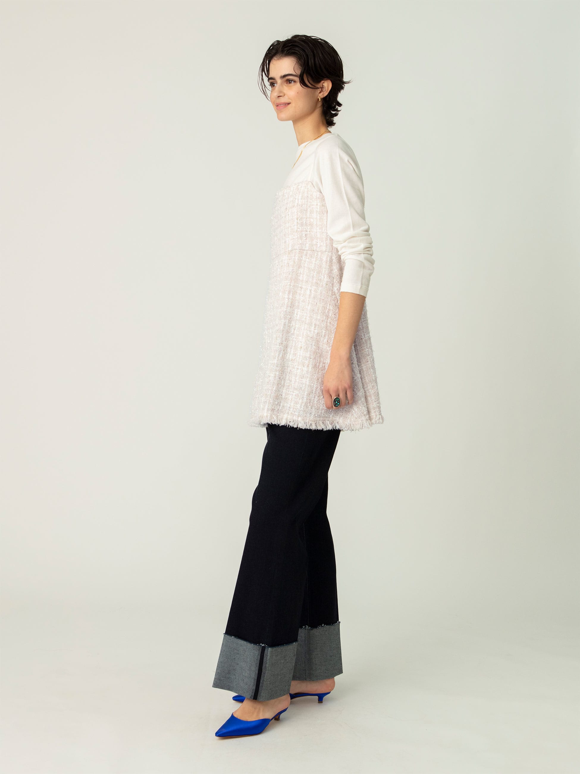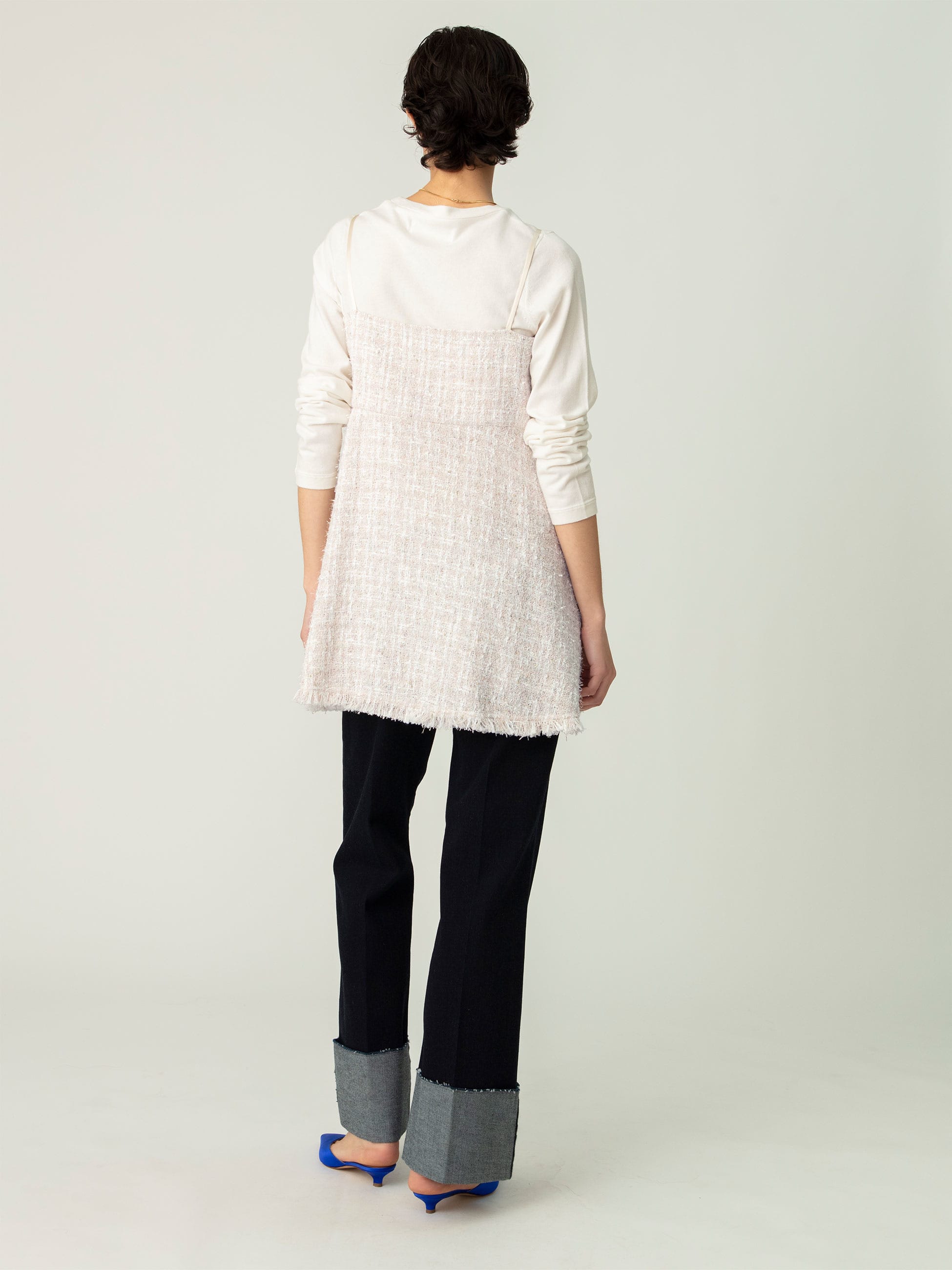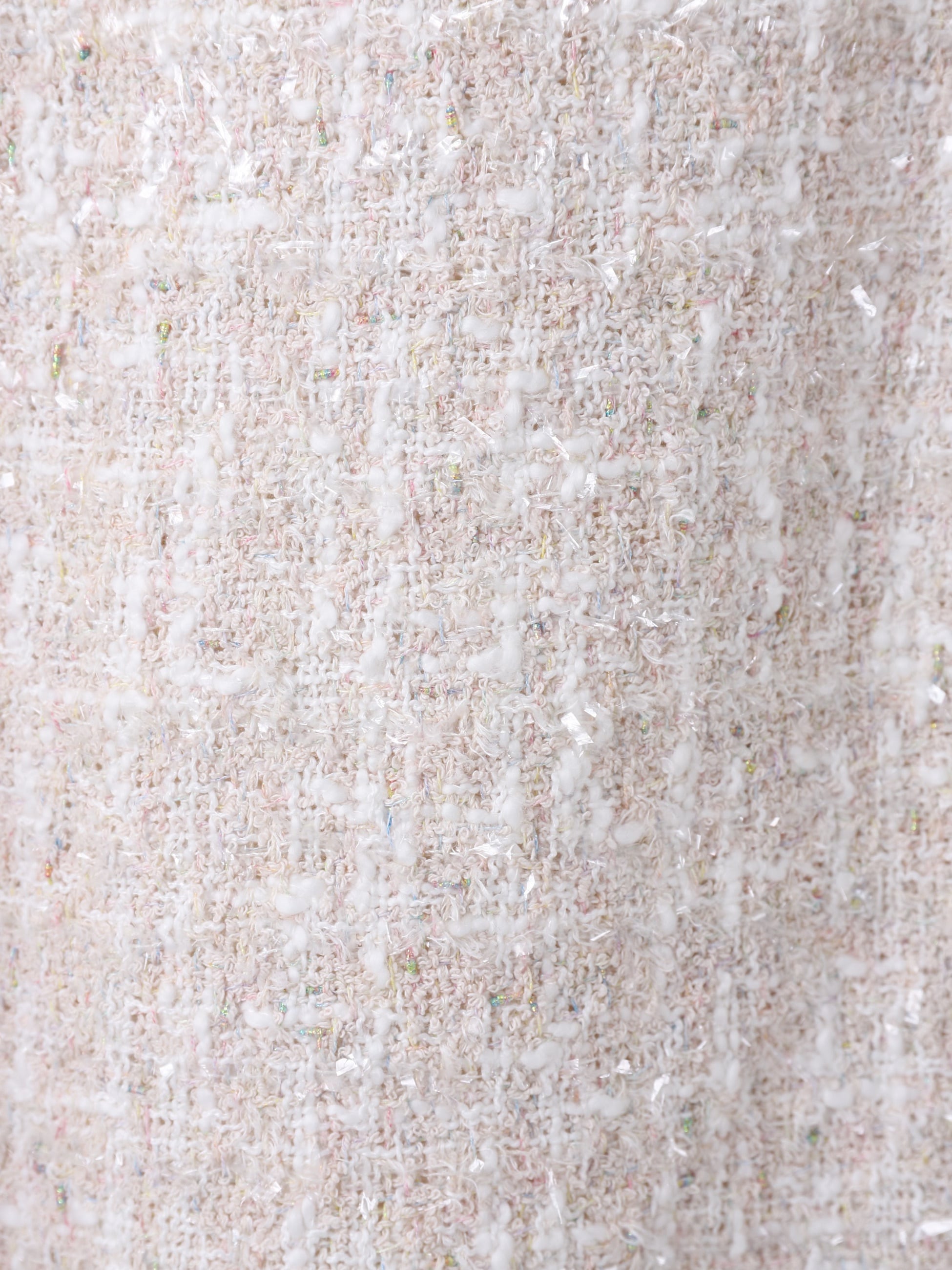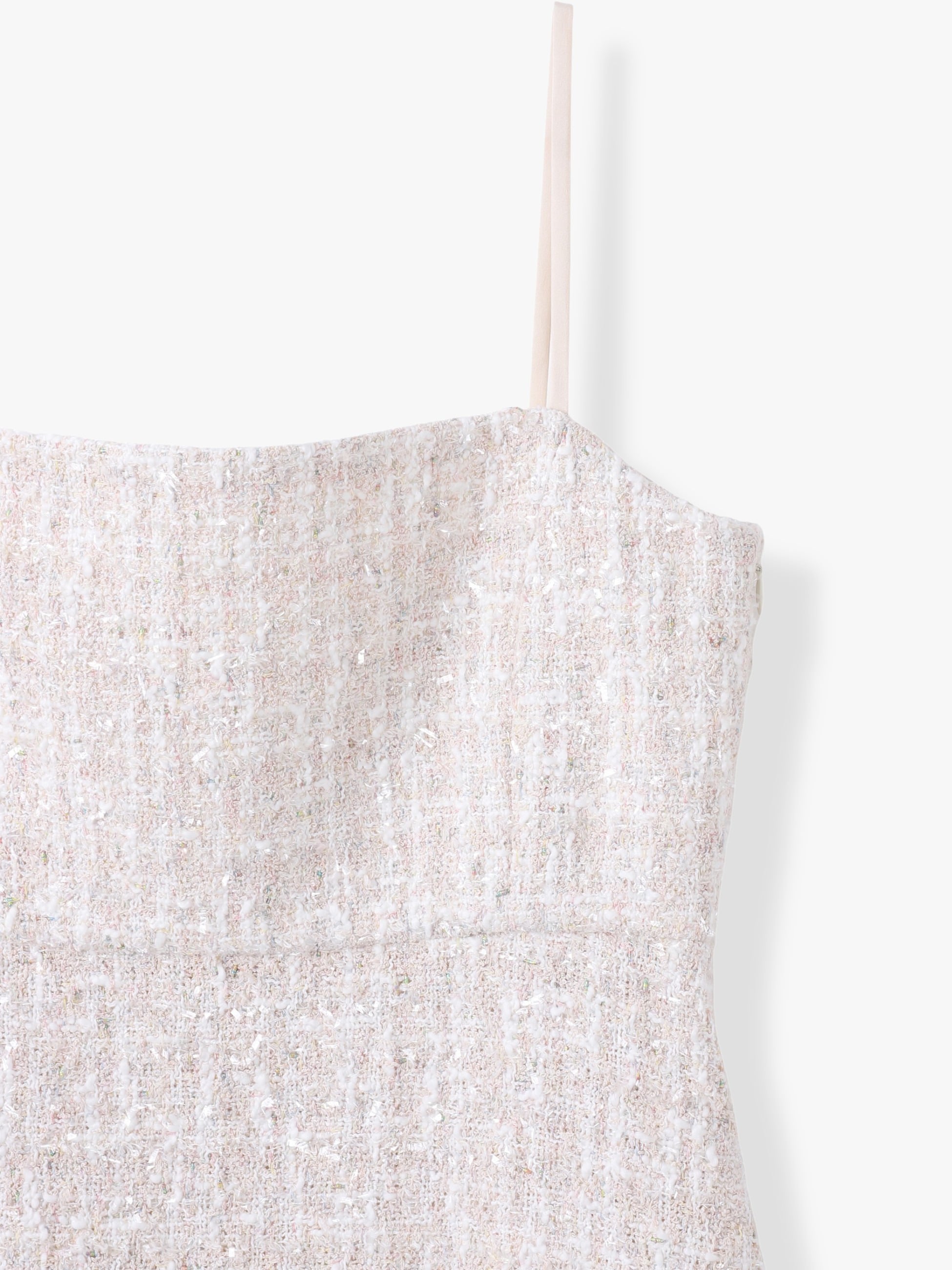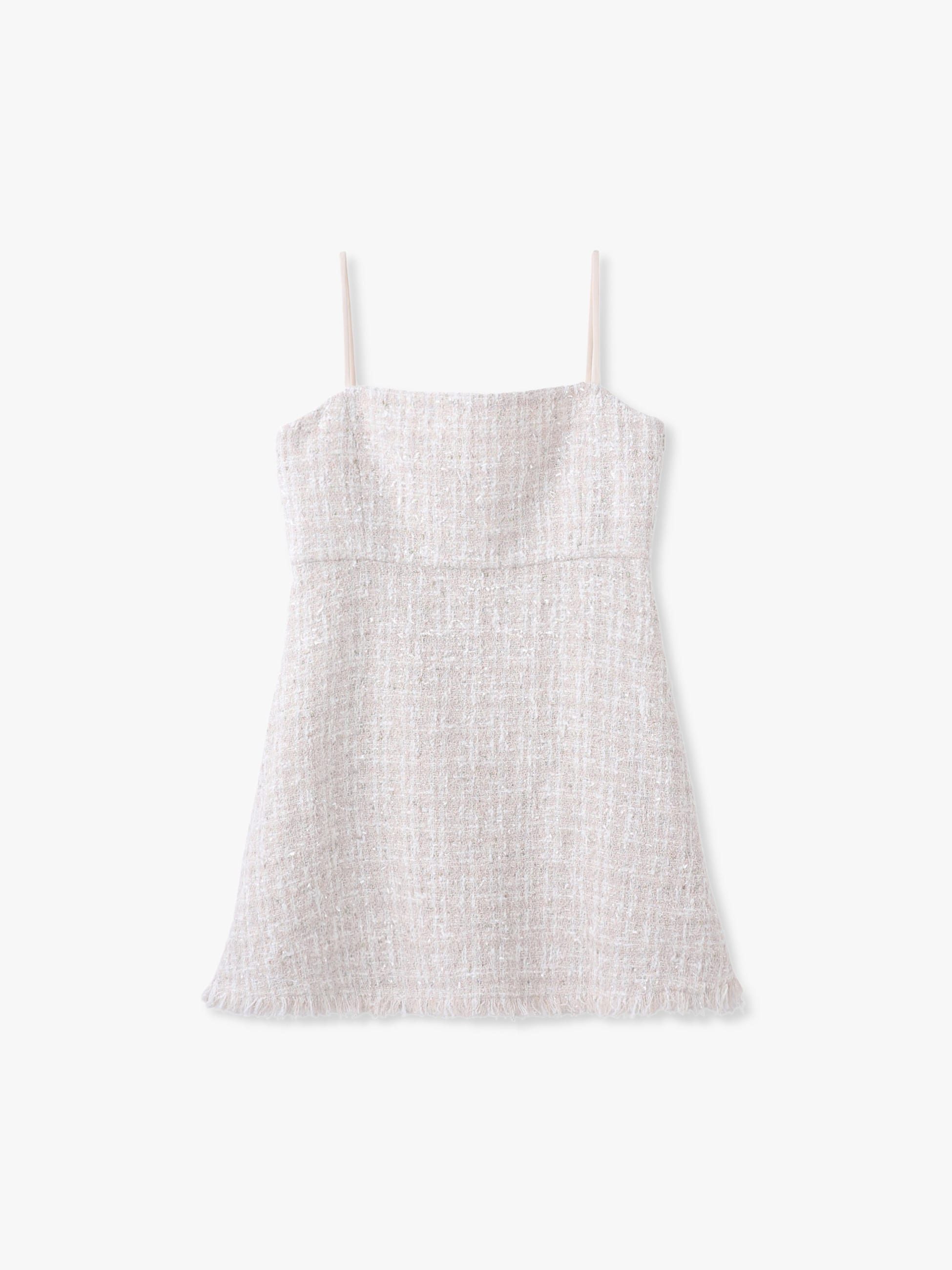 - 虹色のラメ糸が華やかな印象のツイードキャミソールトップは、レイヤードスタイルはもちろん、潔く素肌で合わせていただくのもおすすめです。ホワイトカラーのパンツと合わせた爽やかなコーディネートも様になります。同素材のスカート、ジャケットもございます。