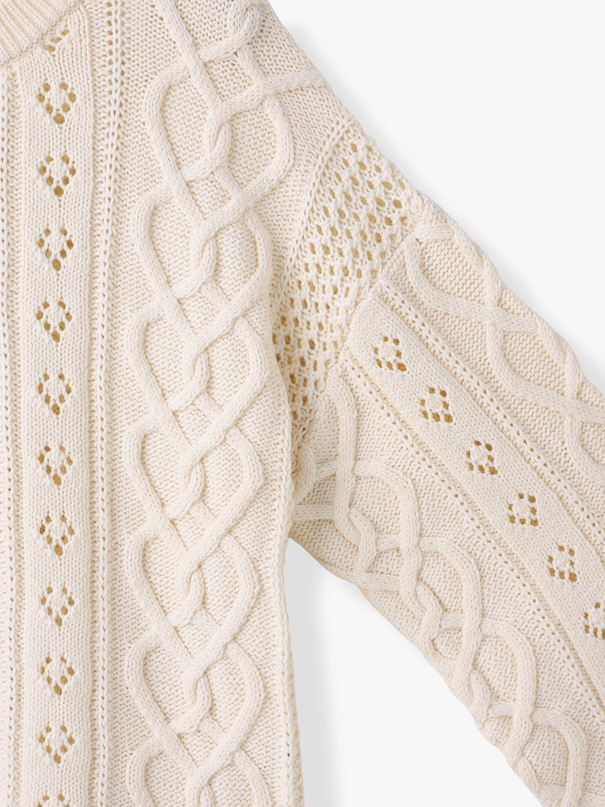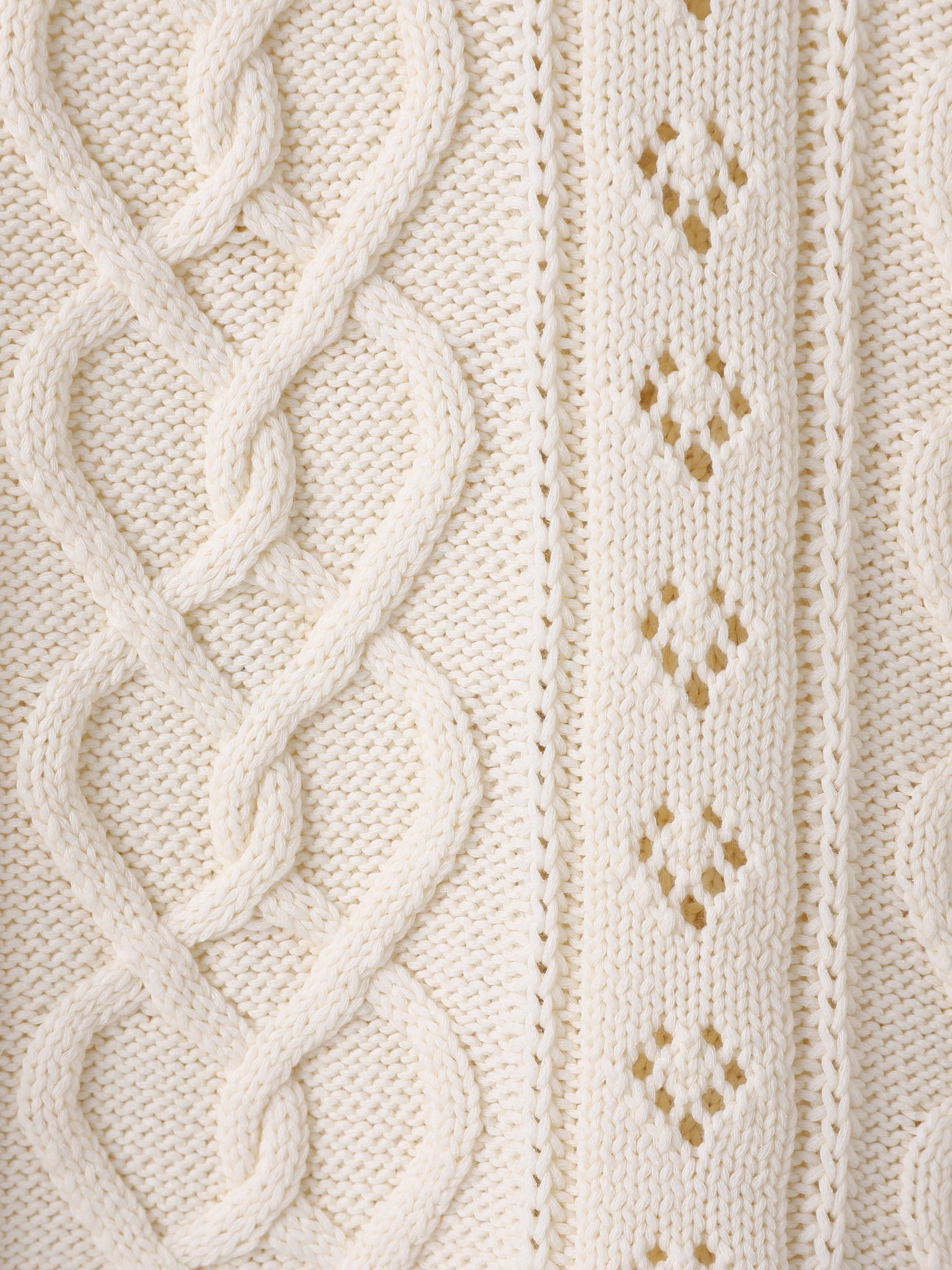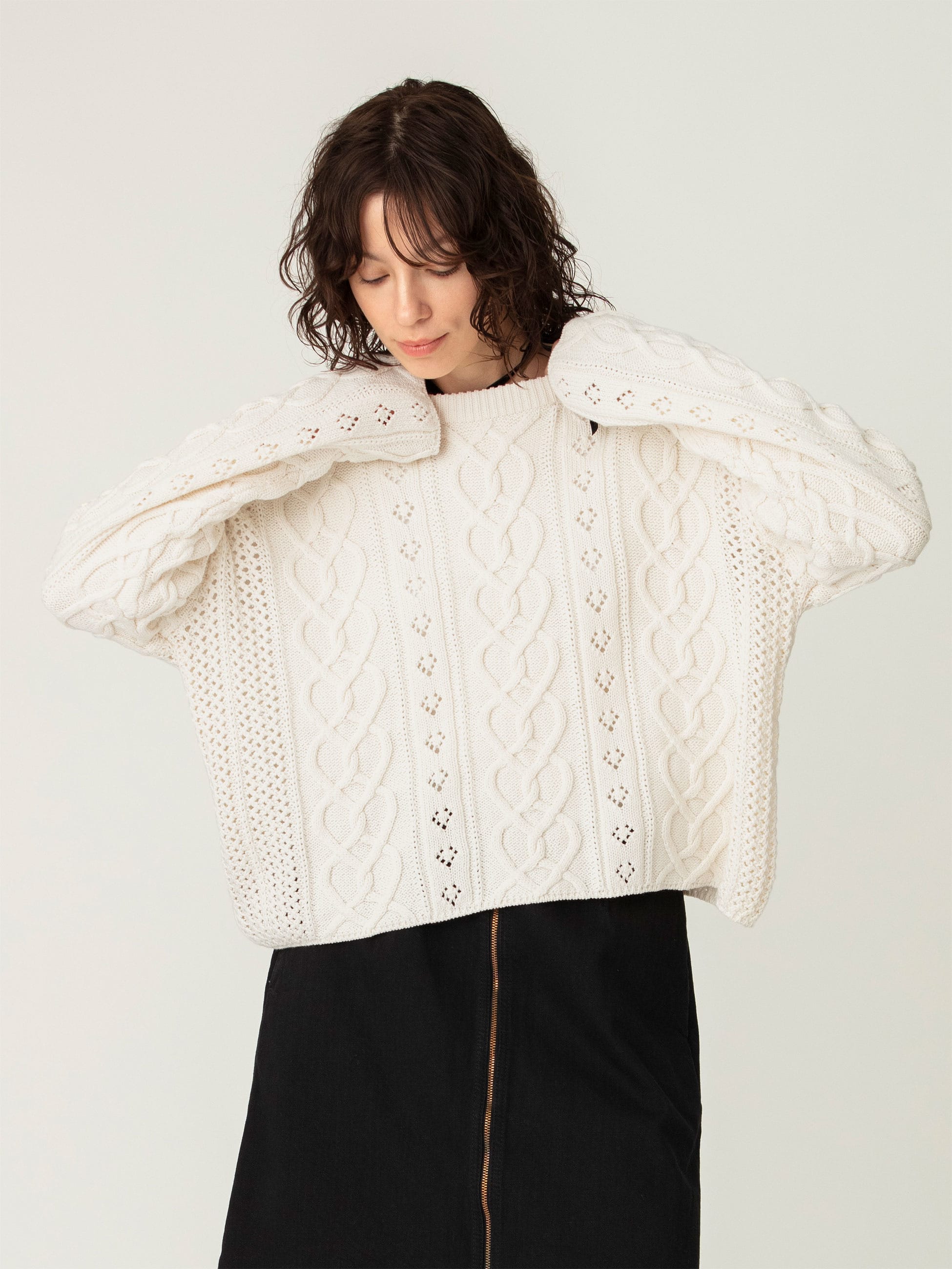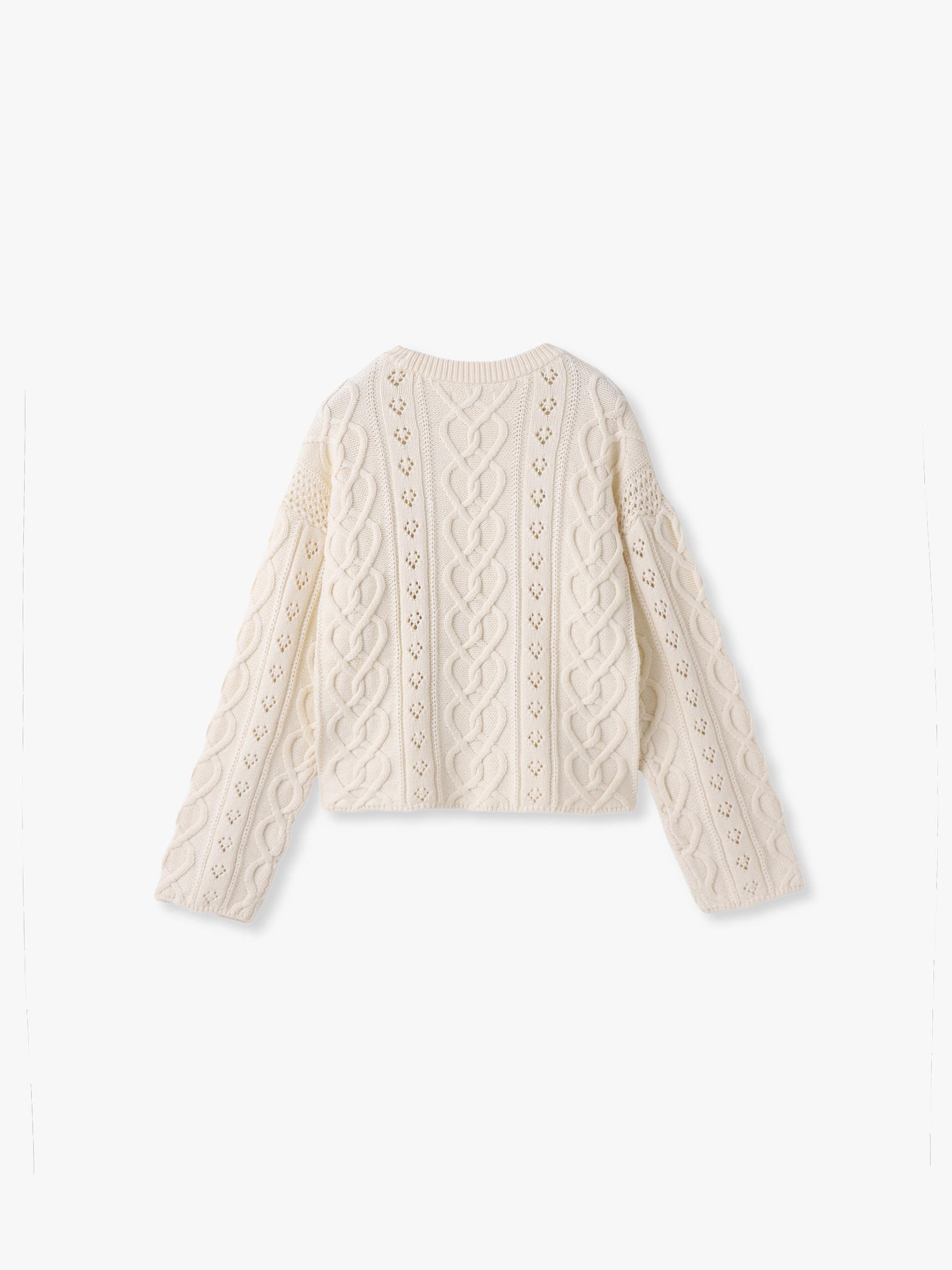 ロンハーマンオリジナルから、ハートモチーフをさりげなく忍ばせた心擽るアイテムが登場です。ケーブル編みとアイレットでハート柄を起こした可愛らしいニットトップスです。コットンナイロン素材の軽やかな着心地は、春先まで活躍するアイテムです。