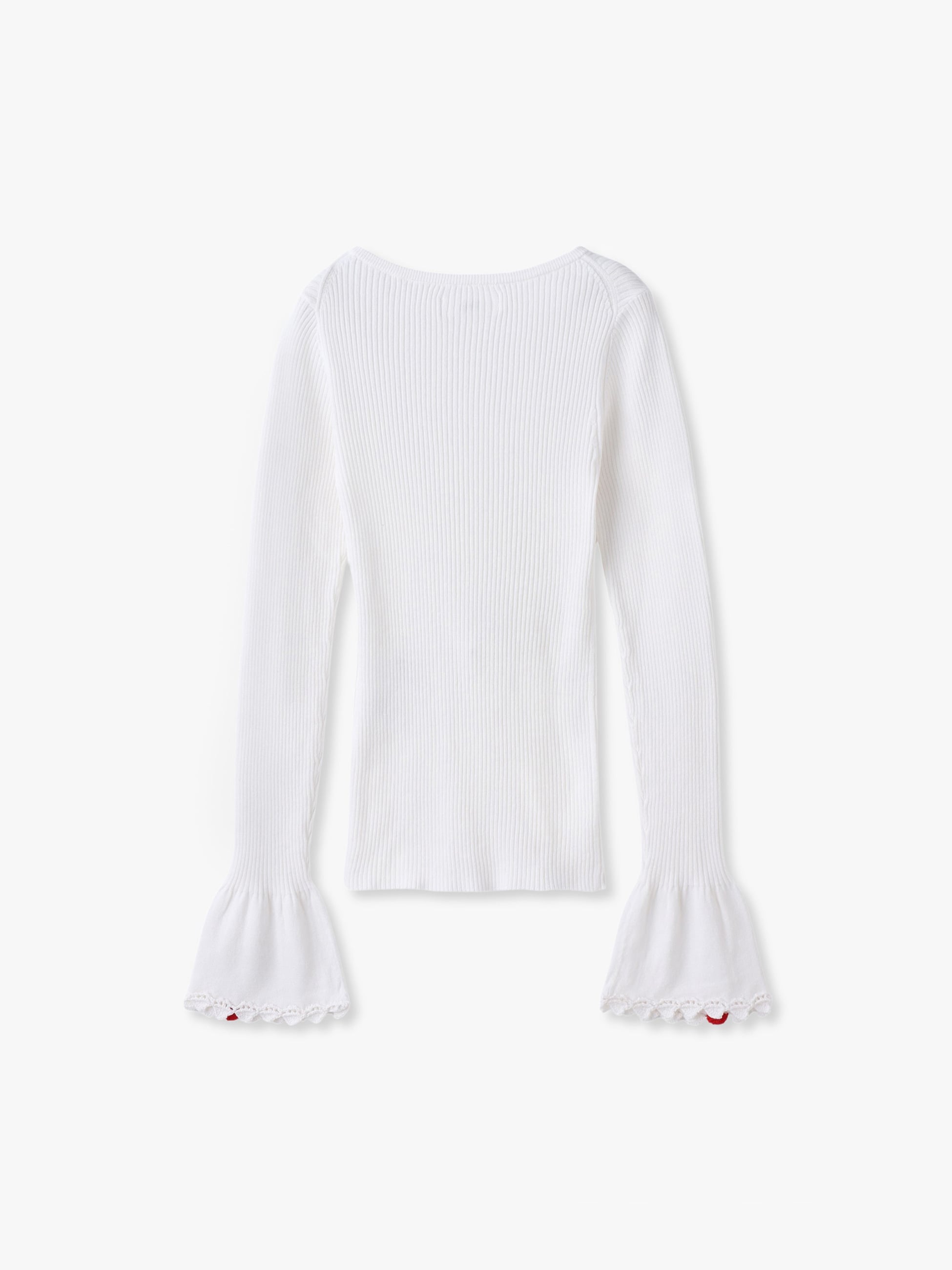 ロンハーマンオリジナルから、ハートモチーフをさりげなく忍ばせた心擽るアイテムが登場です。すっきりとしたシルエットのリブニットトップスは、フリルが可愛らしい袖口に、鍵編みでハートのスカラップをさりげなく施しました。シンプルだからこそ、可憐なジュエリーを合わせても素敵です。