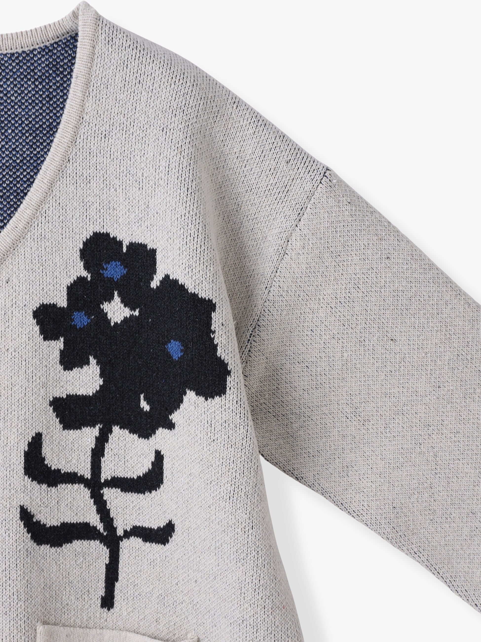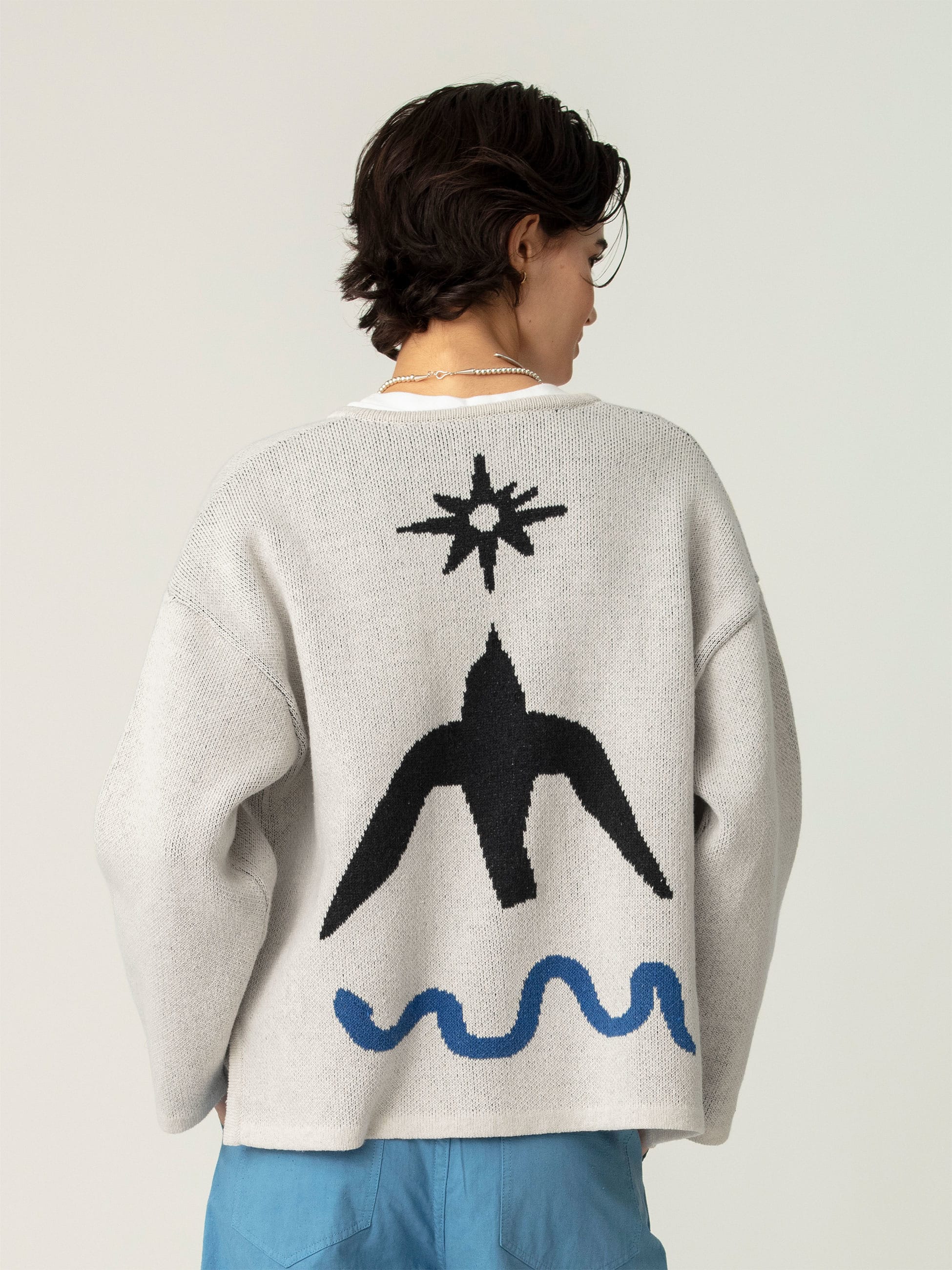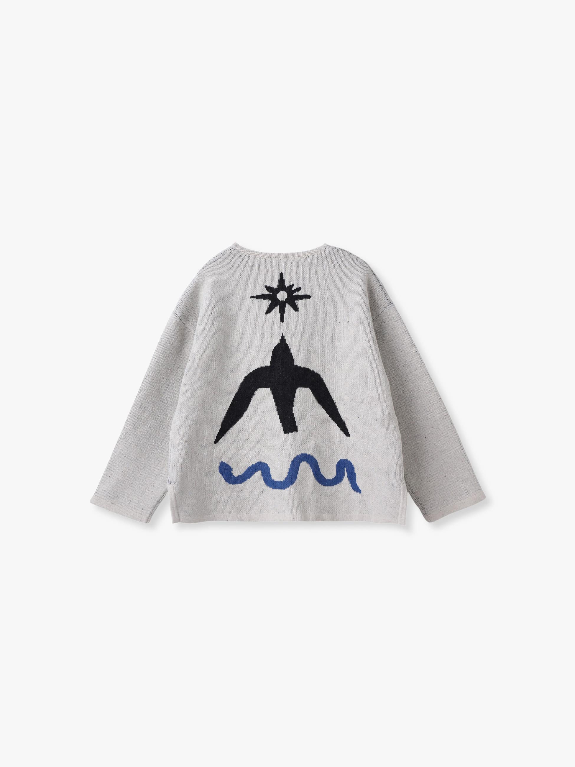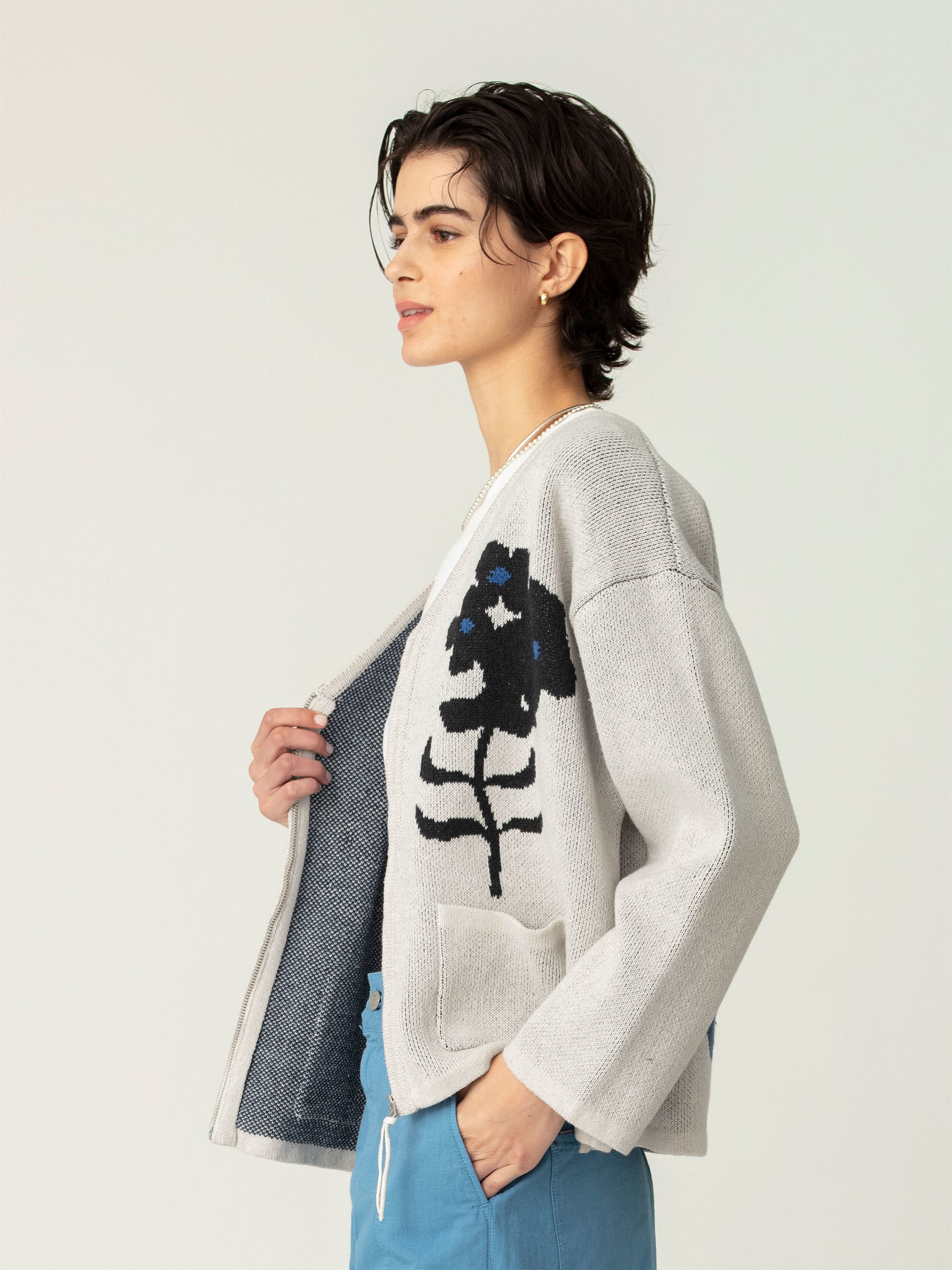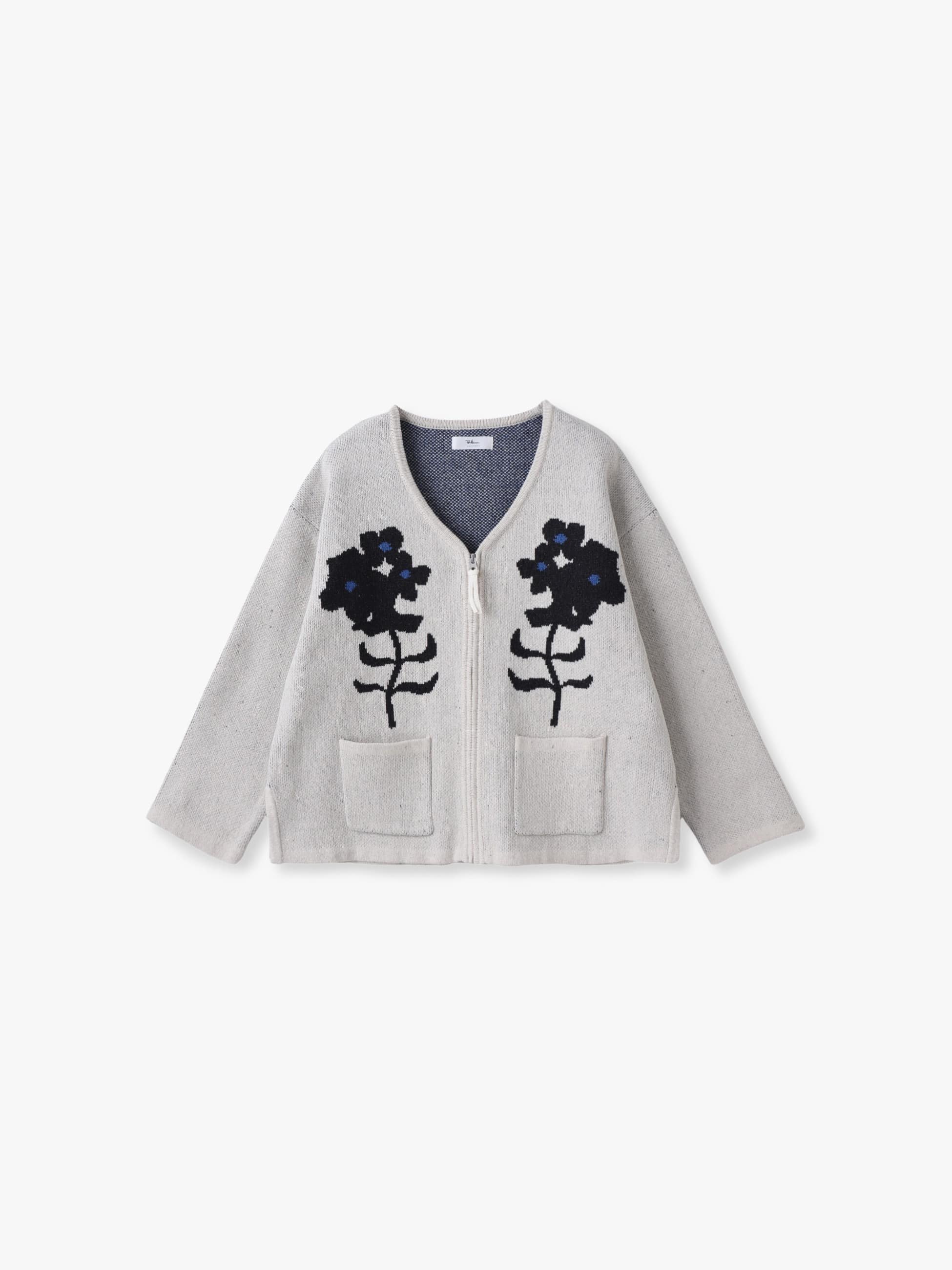 すっきりとしたVネックラインのニットカーディガンは、フロントとバックに自然を思わせるモチーフを大胆にあしらい、シンプルなボトムと合わせるだけで印象的なコーディネートをお楽しみいただけます。程よくゆとりのあるサイズ感で汎用性も備え、トップスとしても軽い羽織りとしても長く活躍します。