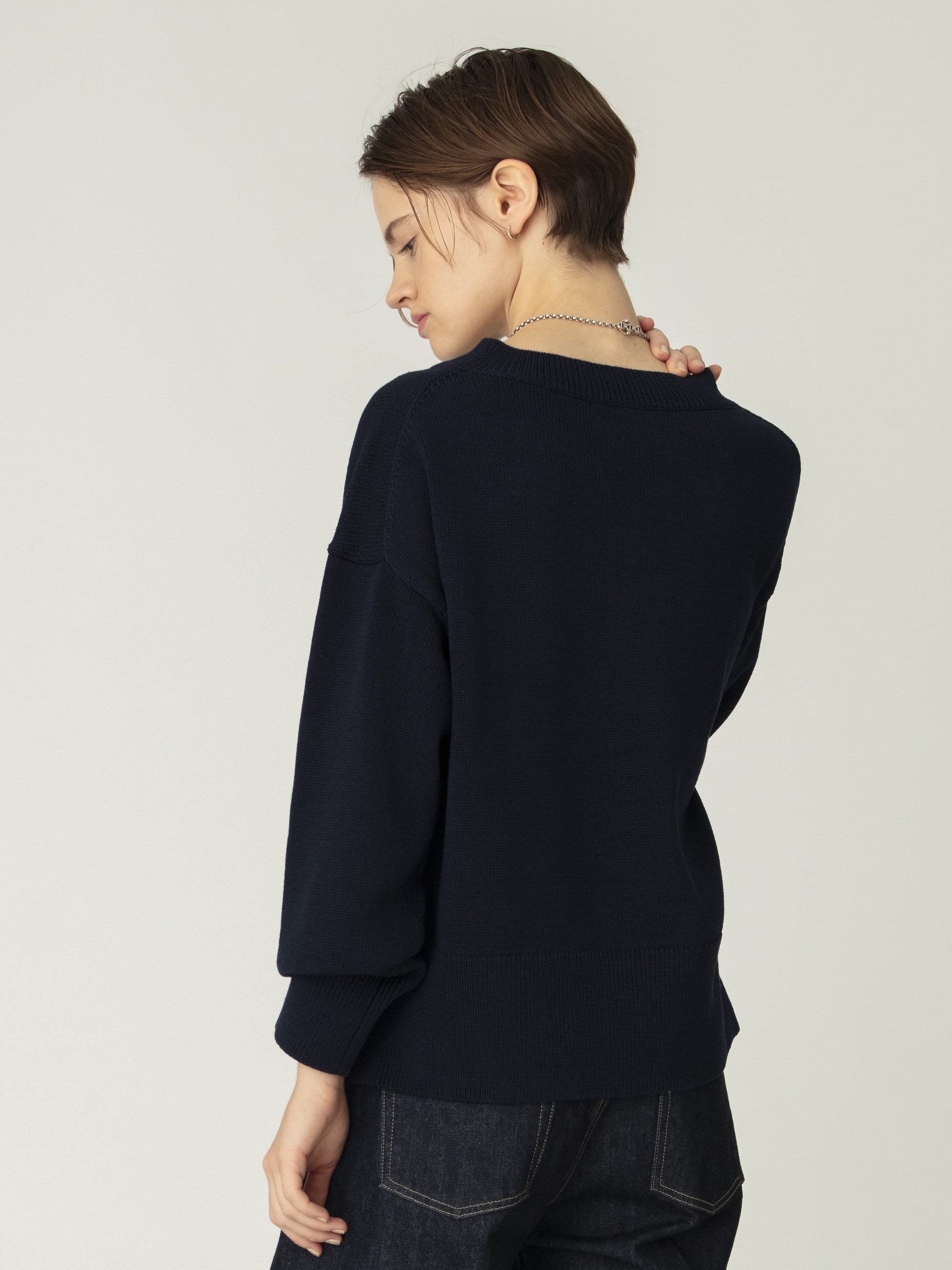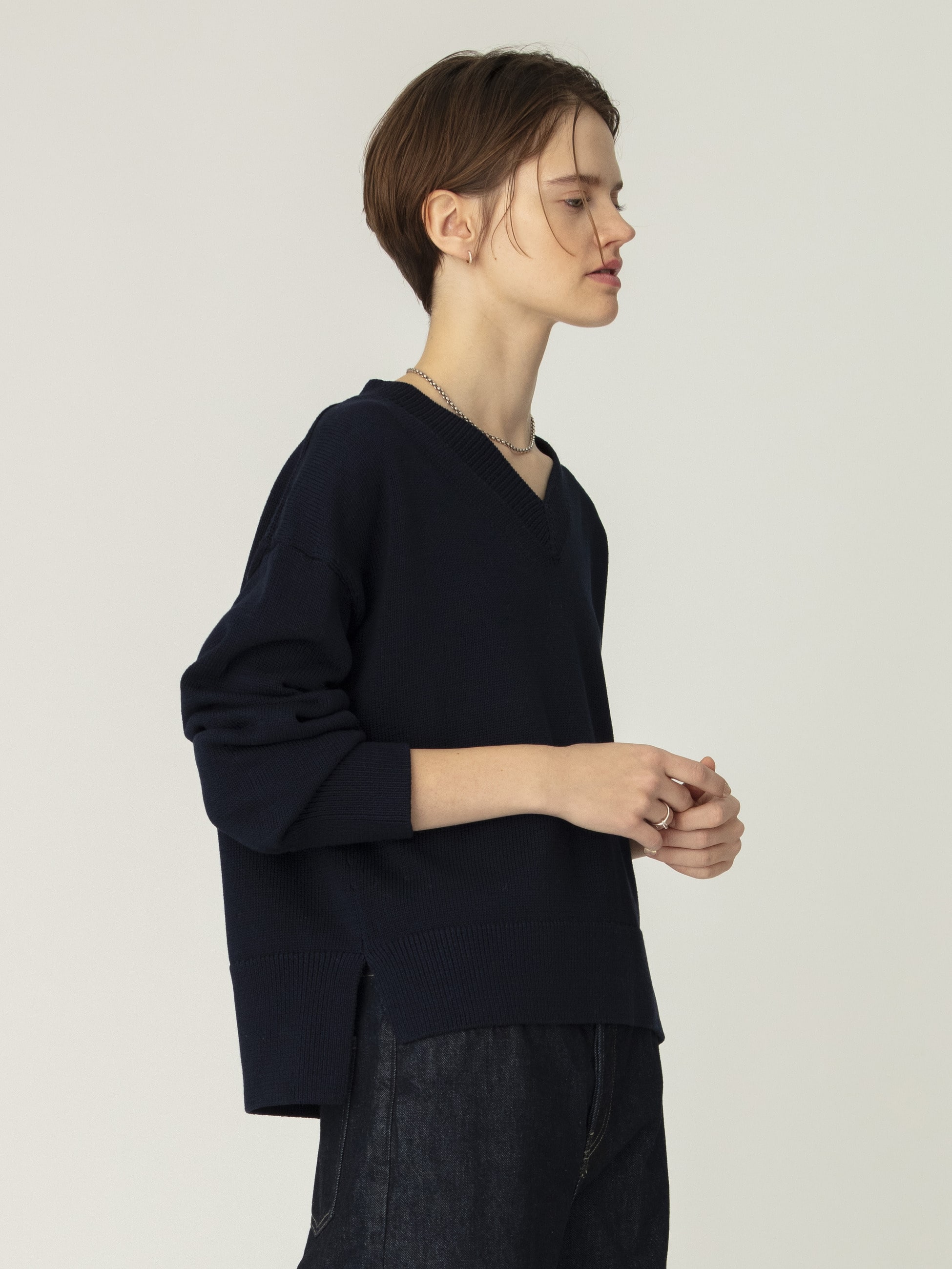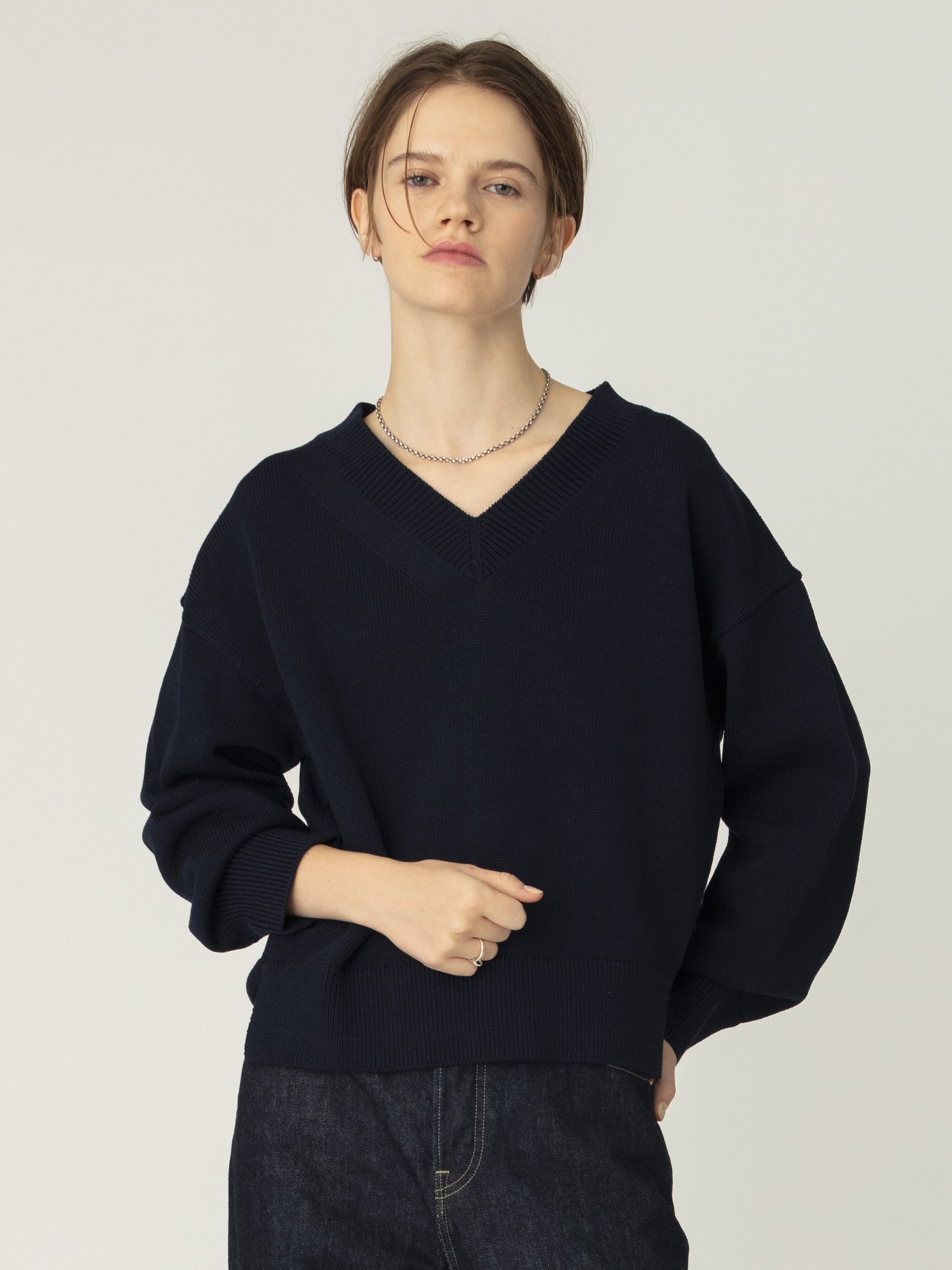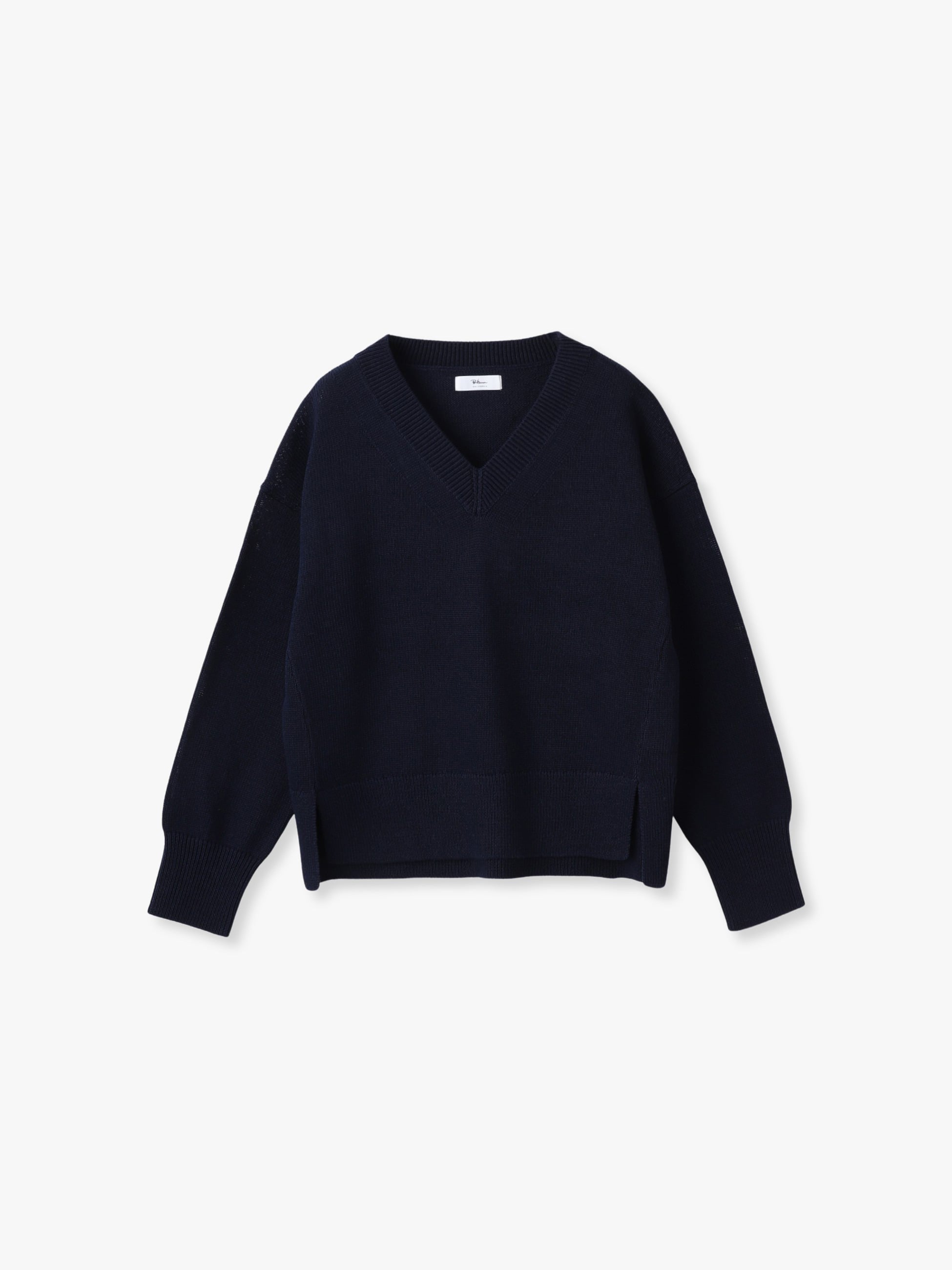 - Vネックデザインのニットプルオーバーは、さらっとしたシャリ感のあるコットン素材を使用し、初夏まで長くお楽しみいただける軽やかな着心地が特徴です。前後差をつけたヘムラインや太めのVライン、ドロップショルダーのリラクシーなシルエットなど、シンプルな中にもデザイン性を備えています。汎用性の高いアイボリーとネイビー、コーディネートのポイントになる華やかなグリーンの3色展開です。