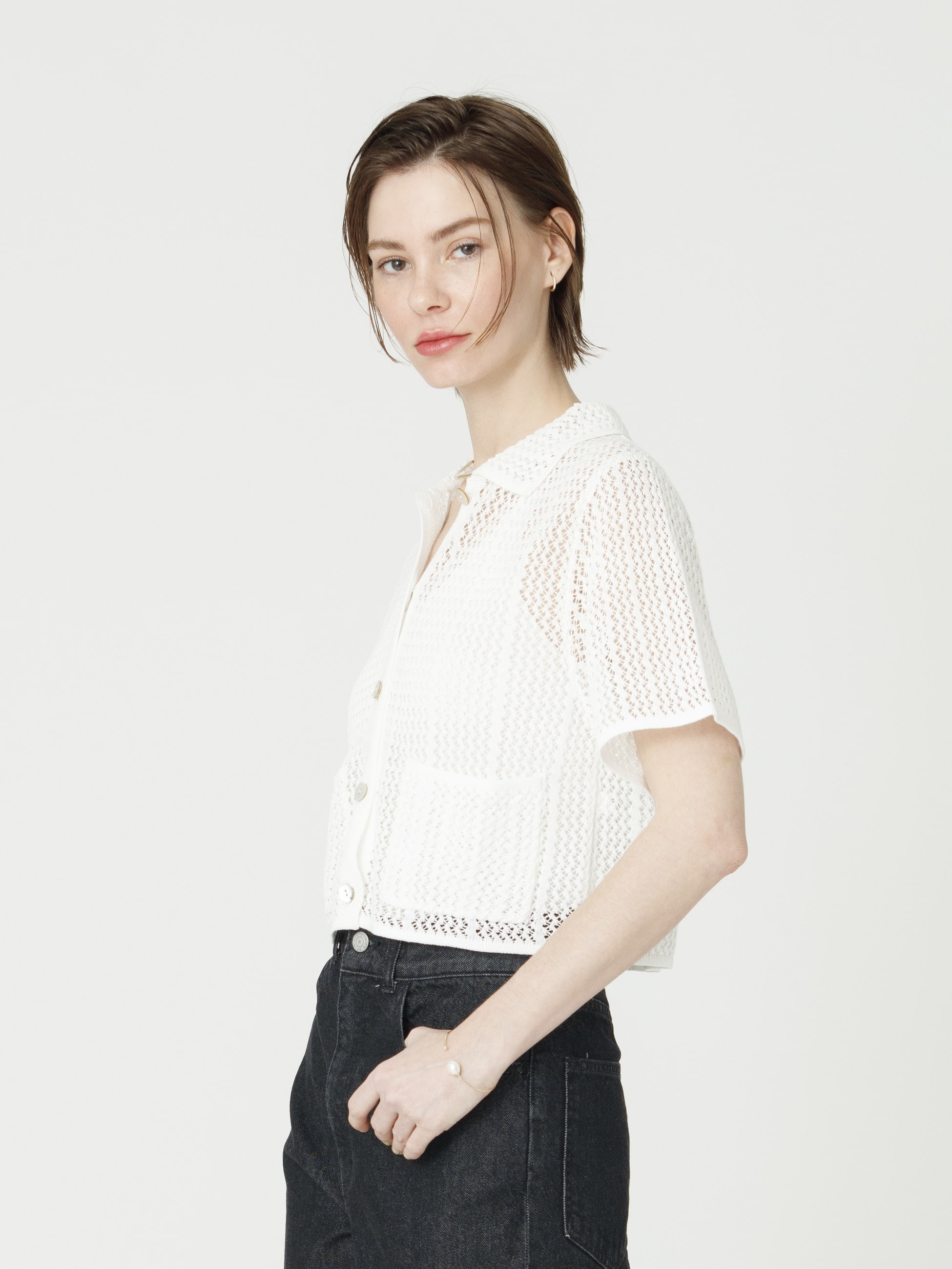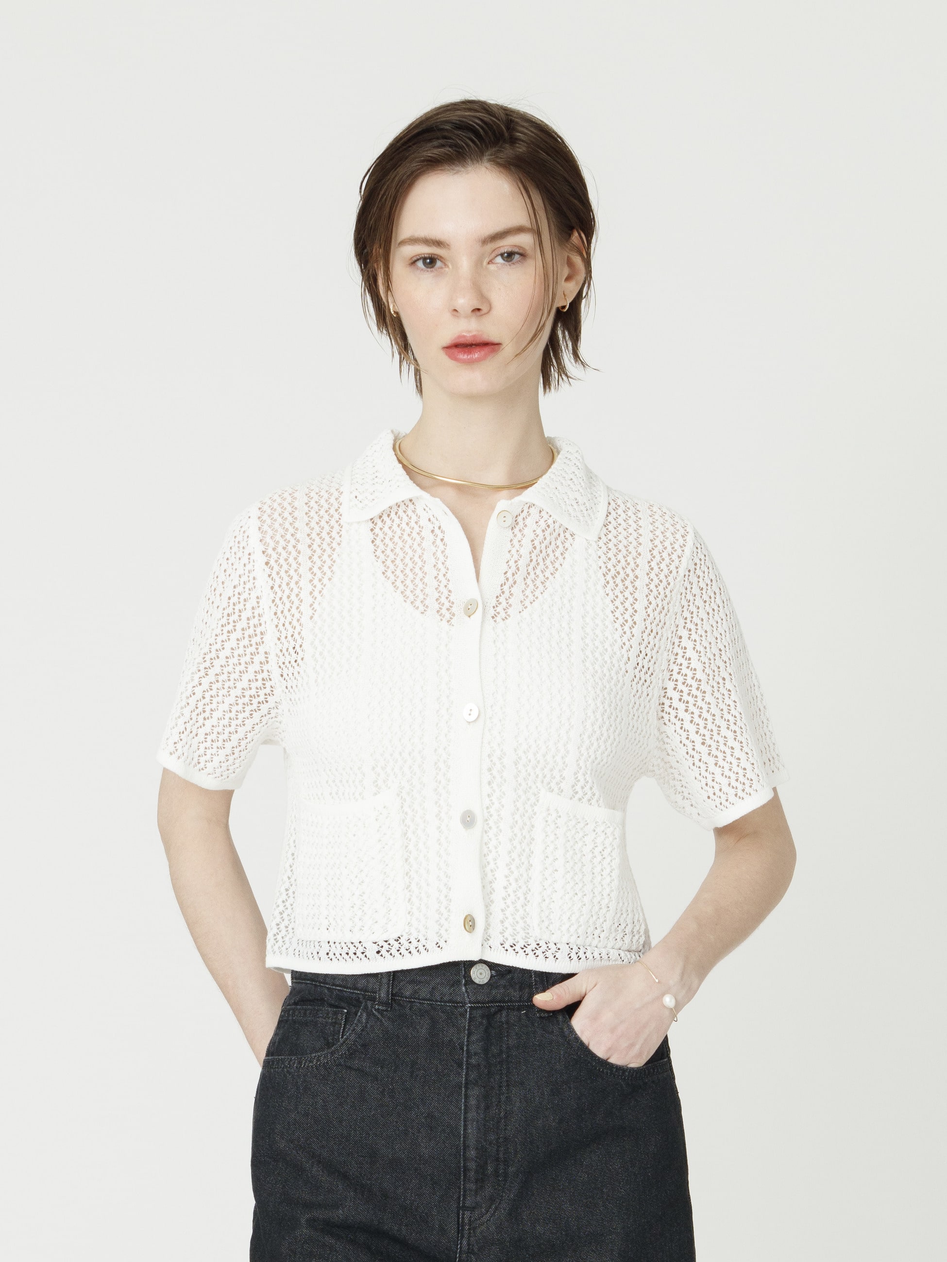 - 繊細なレースのような透かし編みのカーディガンは、ドライなタッチのコットン糸を使用し、暖かい季節でも快適な着心地です。羽織ってもボタンを留めても、女性らしい雰囲気で着用いただけるよう、シルエットにもこだわった1着で、デニムパンツやイージーパンツと合わせたラフなスタイリングも素敵です。
