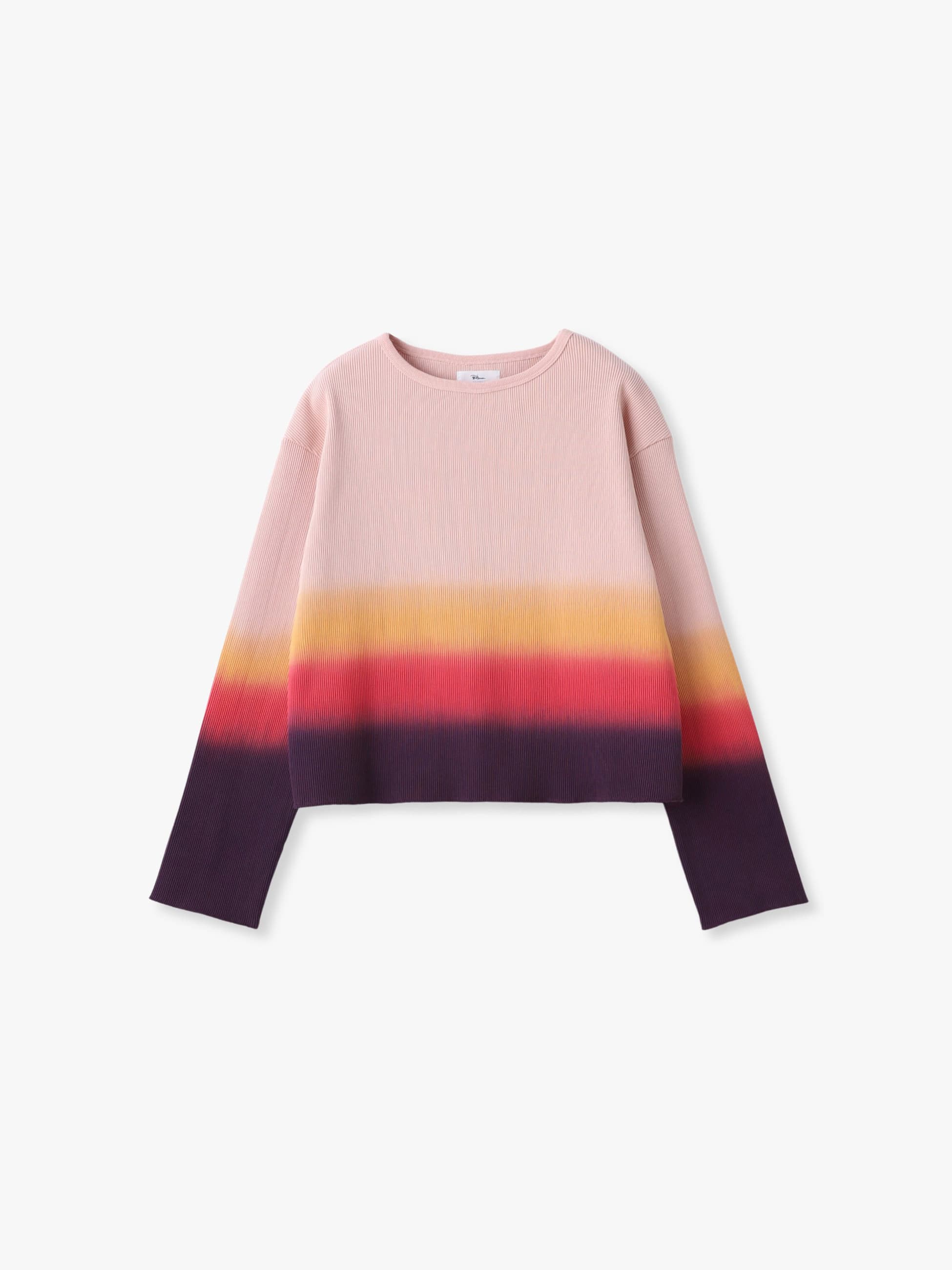 - 厚みのあるリブ生地でデザインしたロングスリーブトップは、淡いピンクをベースに、袖と裾にあしらったグラデーション染めが特徴です。クルーネックのベーシックなシルエットでありながらも、ドロップショルダーがリラクシーな雰囲気をプラス。コットン生地で長いシーズンで活躍します。同シリーズのリブスカートもございます。