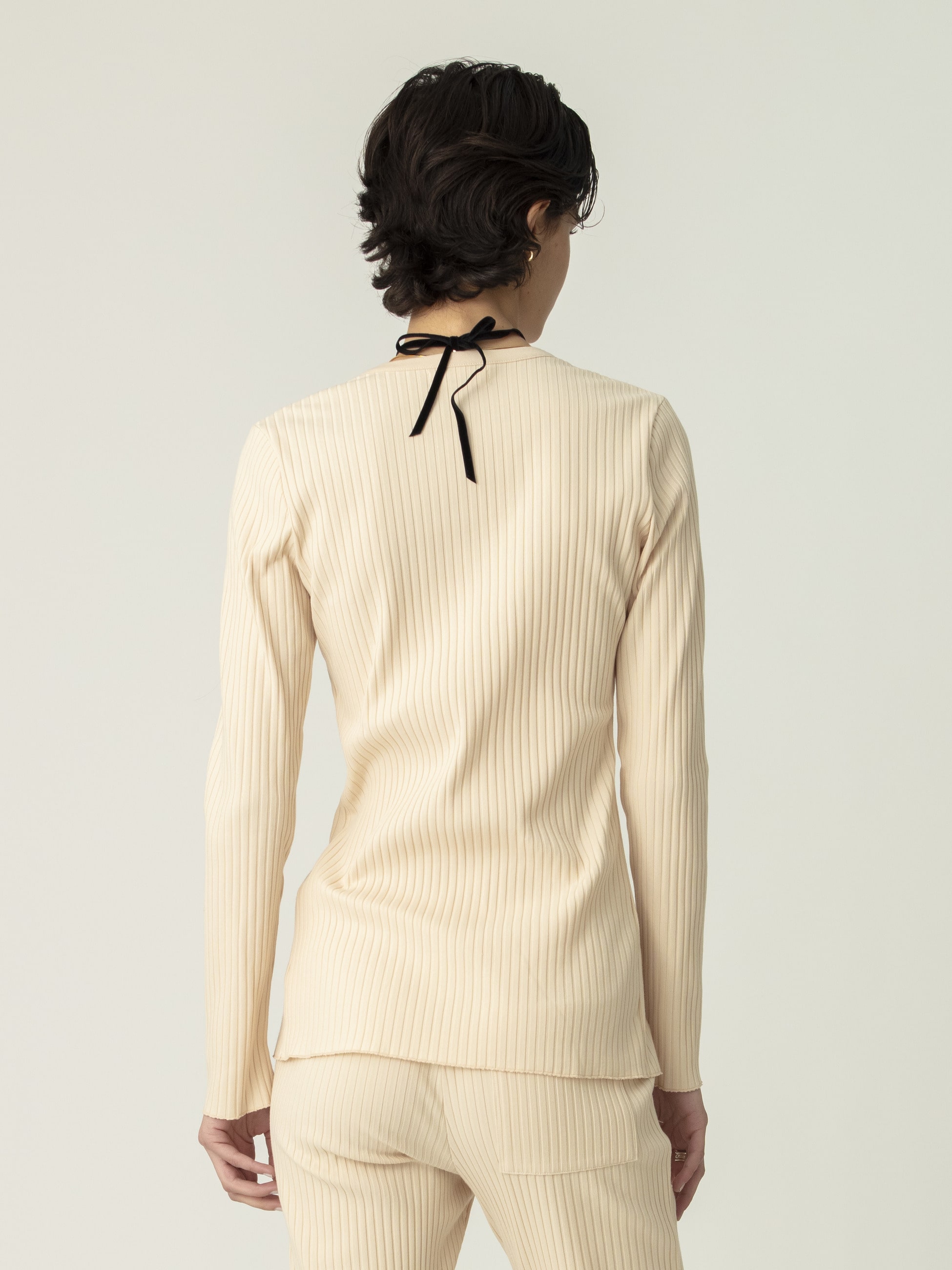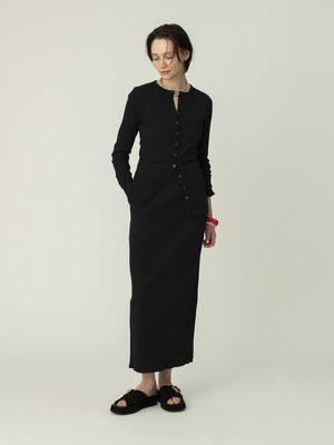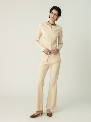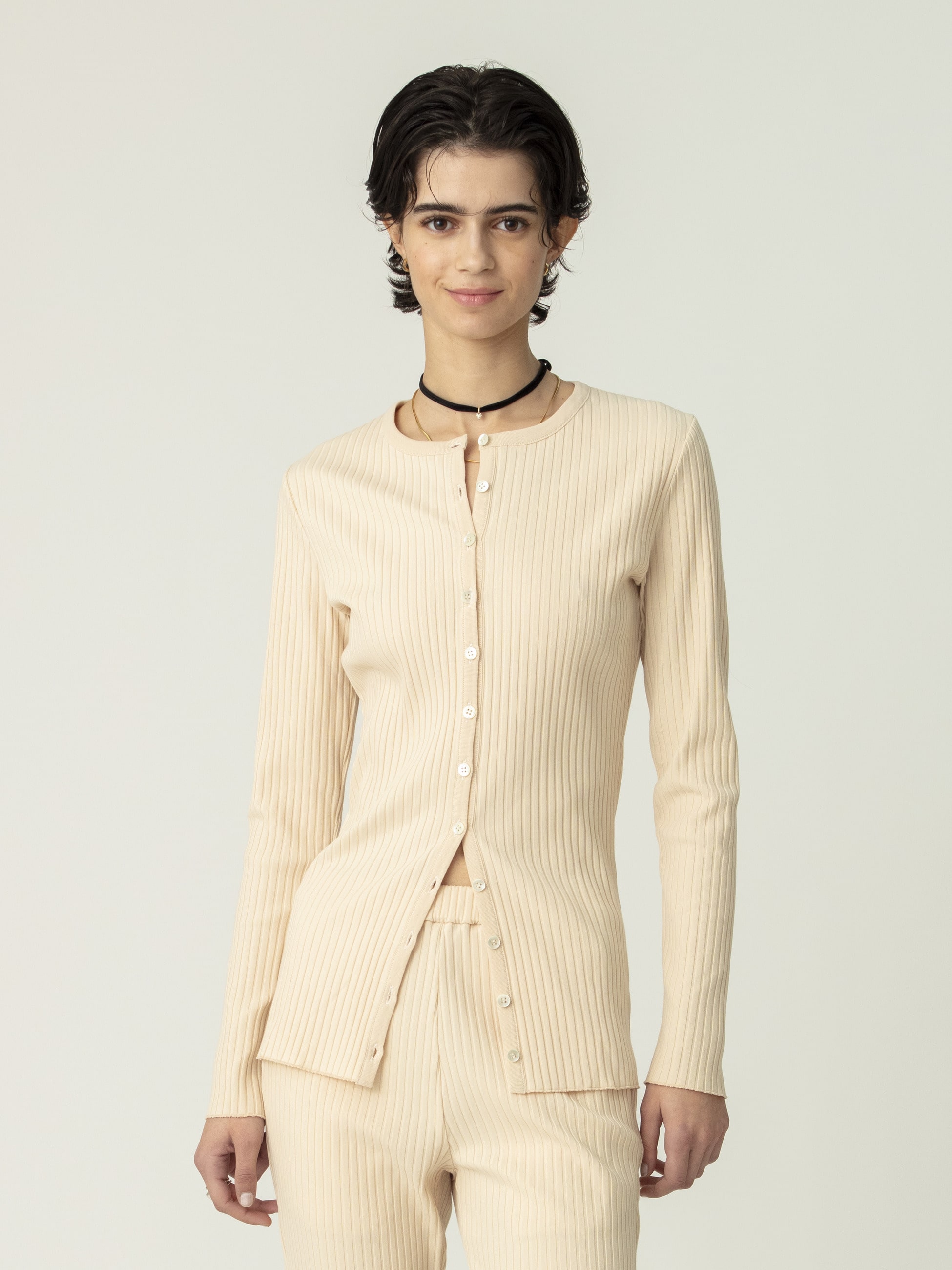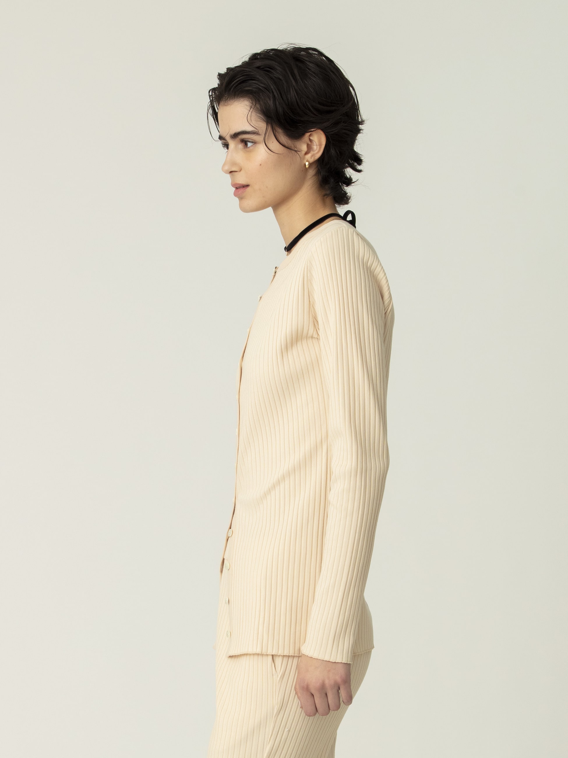 心地良いフィット感のリブカーディガンは、表の綿は強撚でシャリ感を加え、裏のポリエステルは軽さと防シワ性を持たせています。やや長めの着丈で、裾のボタンを開けてボトムを合わせると、抜け感がプラスされよりバランス良く着用いただけます。同シリーズのフレアパンツ、スカートとのセットアップもおすすめです。
