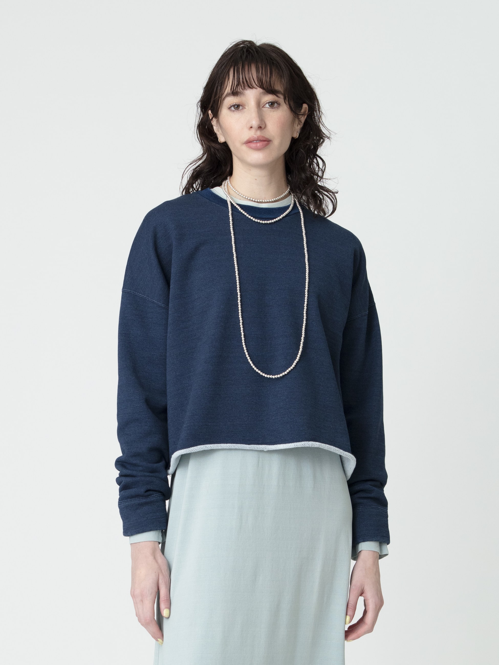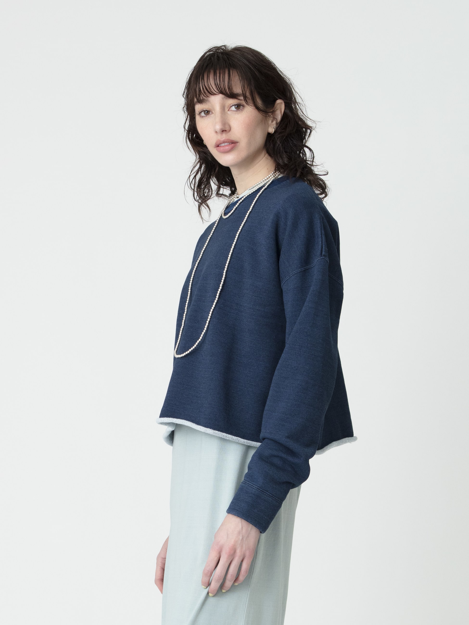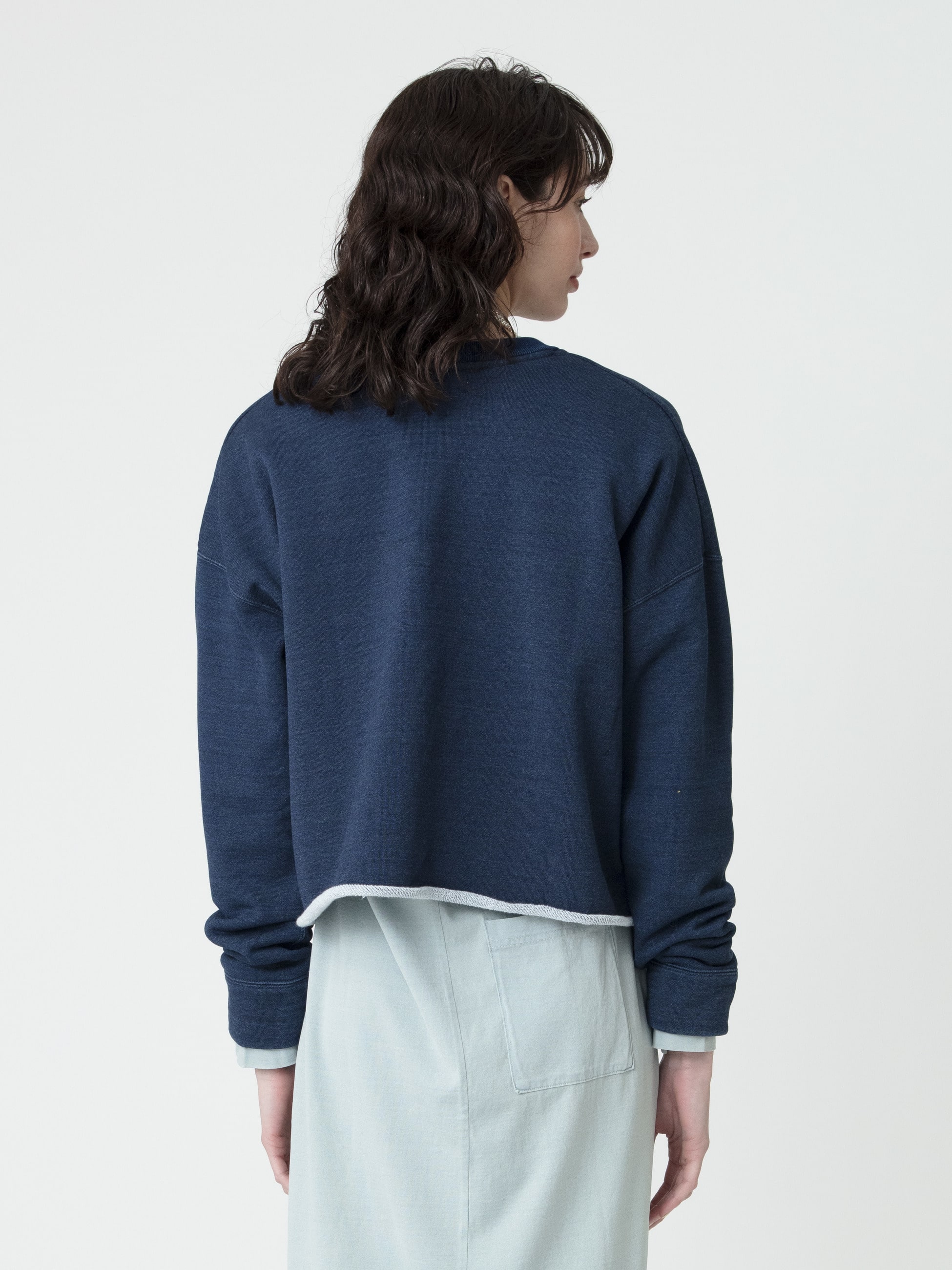 - インディゴの美しさを、リラックスしたムードで着用いただけるカットソーシリーズが登場です。細番手のオーガニックコットン糸に、シルケット加工、枷染めを施すことで生まれる上品な風合いを引き立てました。裏毛素材のスウェットプルオーバーは、カットオフのディティールが、女性らしい抜け感を作り、ボトムスを選ばず、スタイリングが決まる1着です。1枚での着用はもちろん、腰に巻いたり、その他のインディゴ染めシリーズとのレイヤードで、色の濃淡を楽しむスタイリングも素敵です。