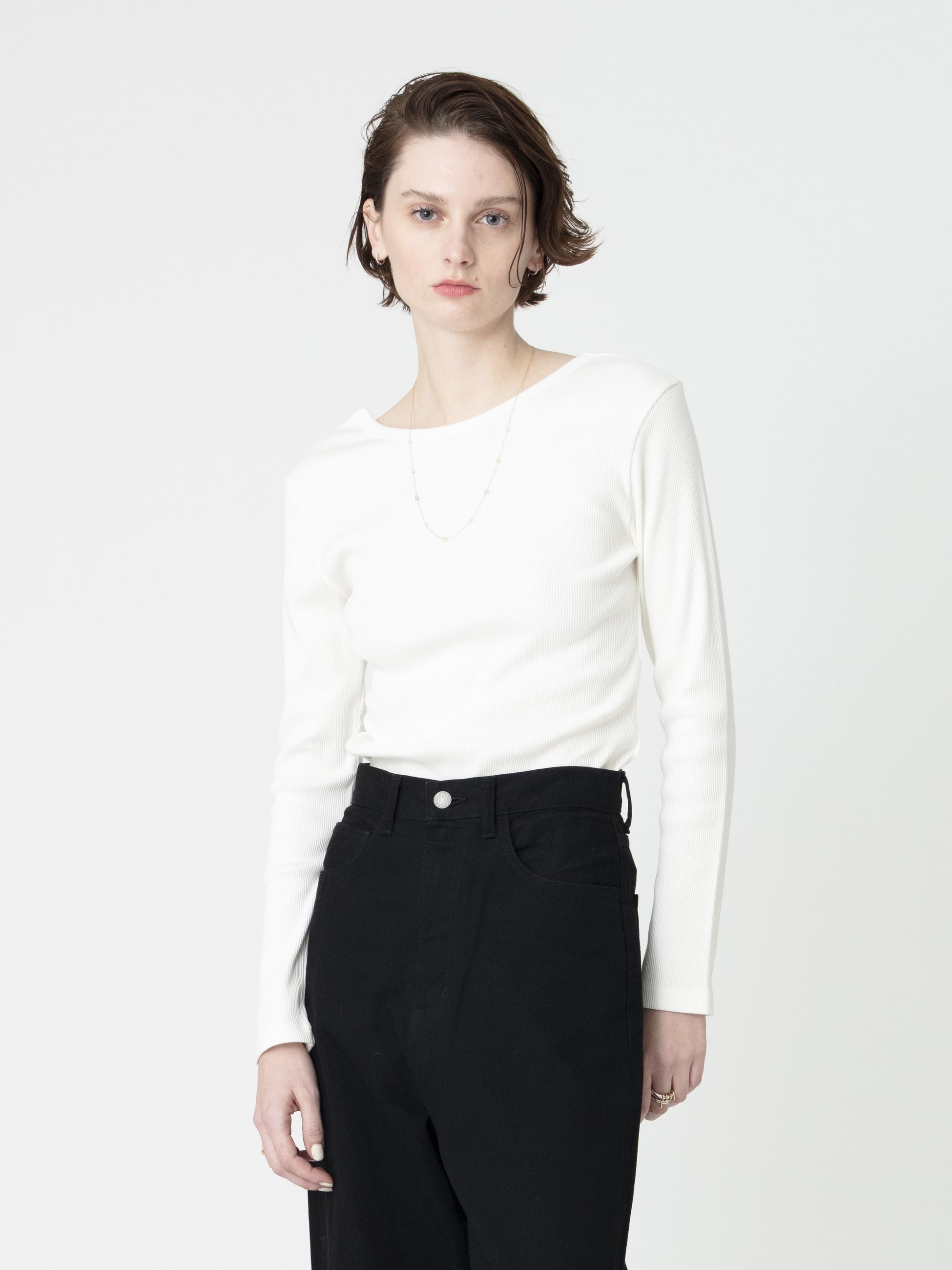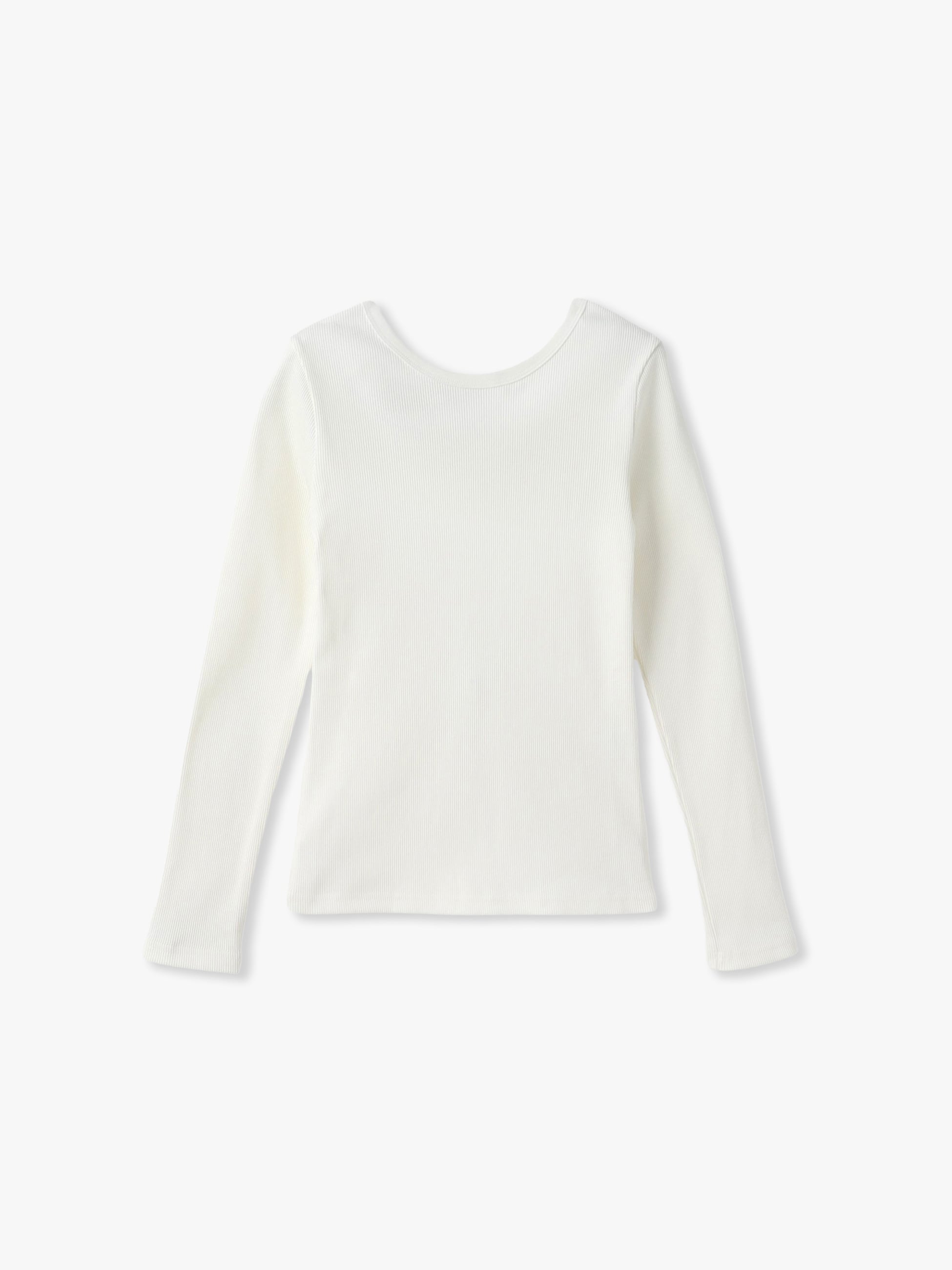 - コットン100%のリブ素材を使用したロングスリーブトップスは、身体に程よく馴染むサイジングがカジュアルながら女性らしさを引き立てます。しっかりとした厚みでインナーも響きにくく、デイリーユースにもぴったりな1枚です。バックのUネックがヘルシーな印象を演出し、ジュエリーをプラスした上品さを纏ったスタイリングもおすすめです。同シリーズのスリーブレストップ(ホワイト/ブラック)もございます。
