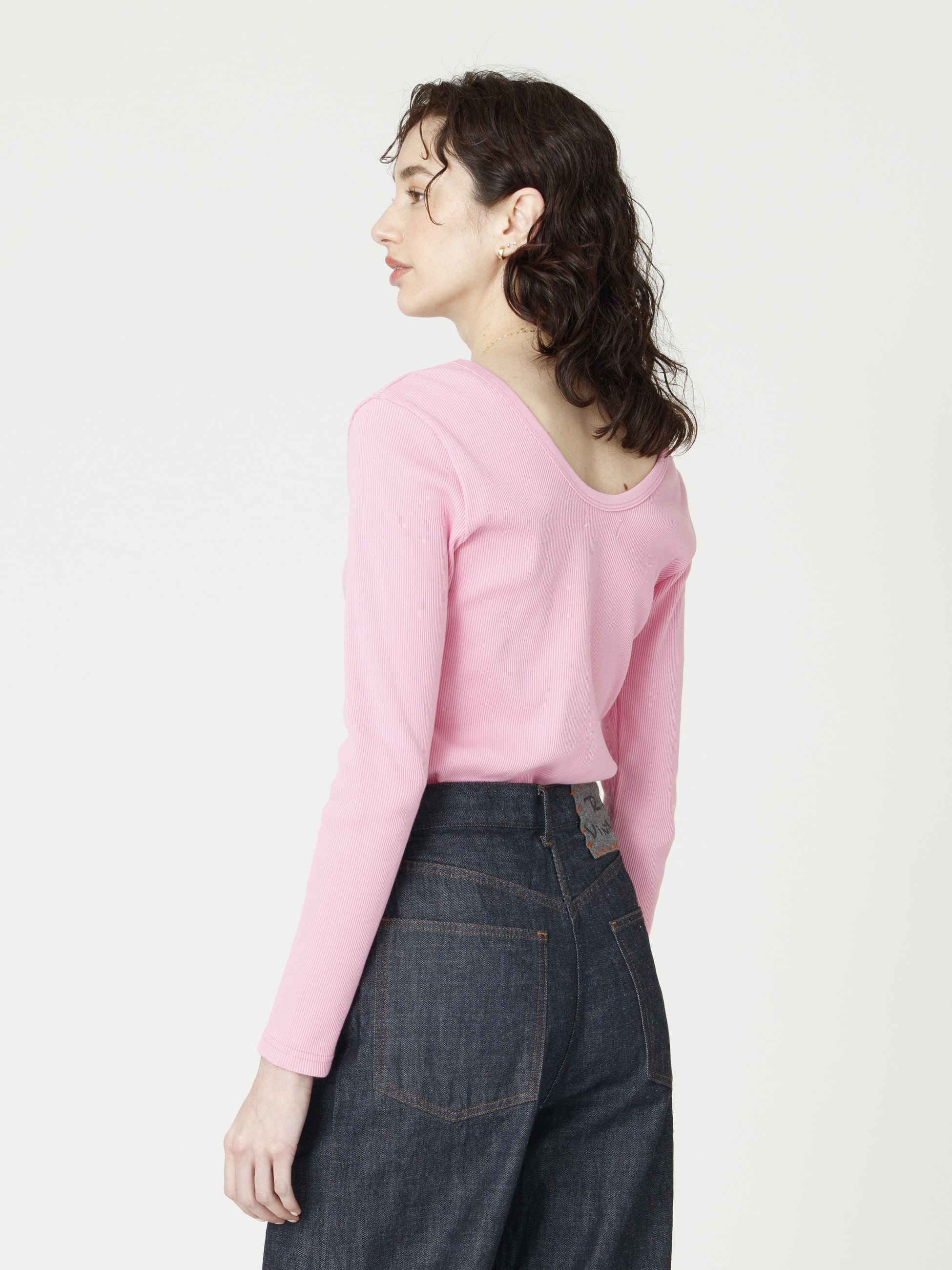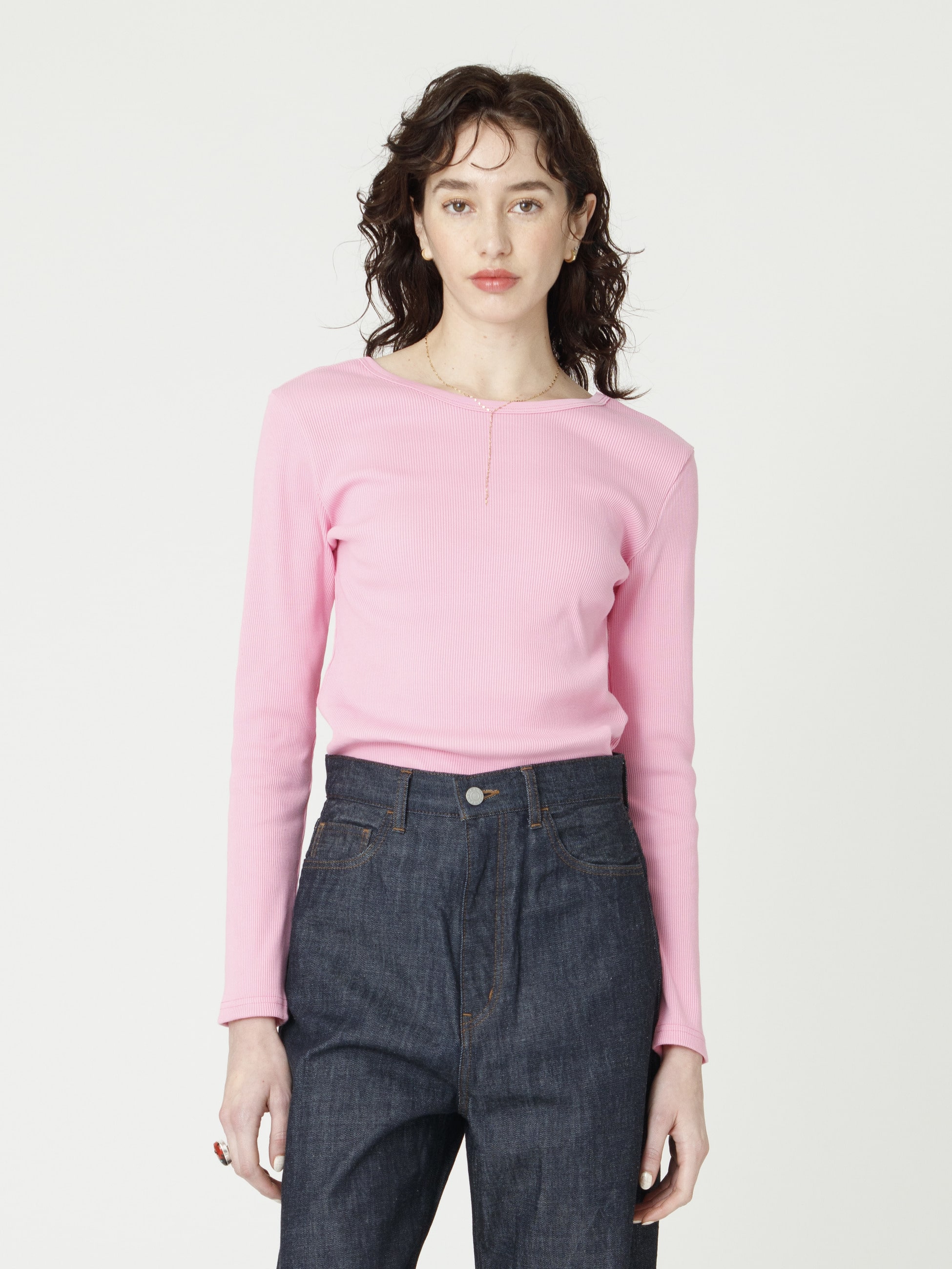 - コットン100%のリブ素材を使用したロングスリーブトップスは、身体に程よく馴染むサイジングがカジュアルながら女性らしさを引き立てます。しっかりとした厚みでインナーも響きにくく、デイリーユースにもぴったりな1枚です。バックのUネックがヘルシーな印象を演出し、ジュエリーをプラスした上品さを纏ったスタイリングもおすすめです。同シリーズのスリーブレストップ(ホワイト/ブラック)もございます。