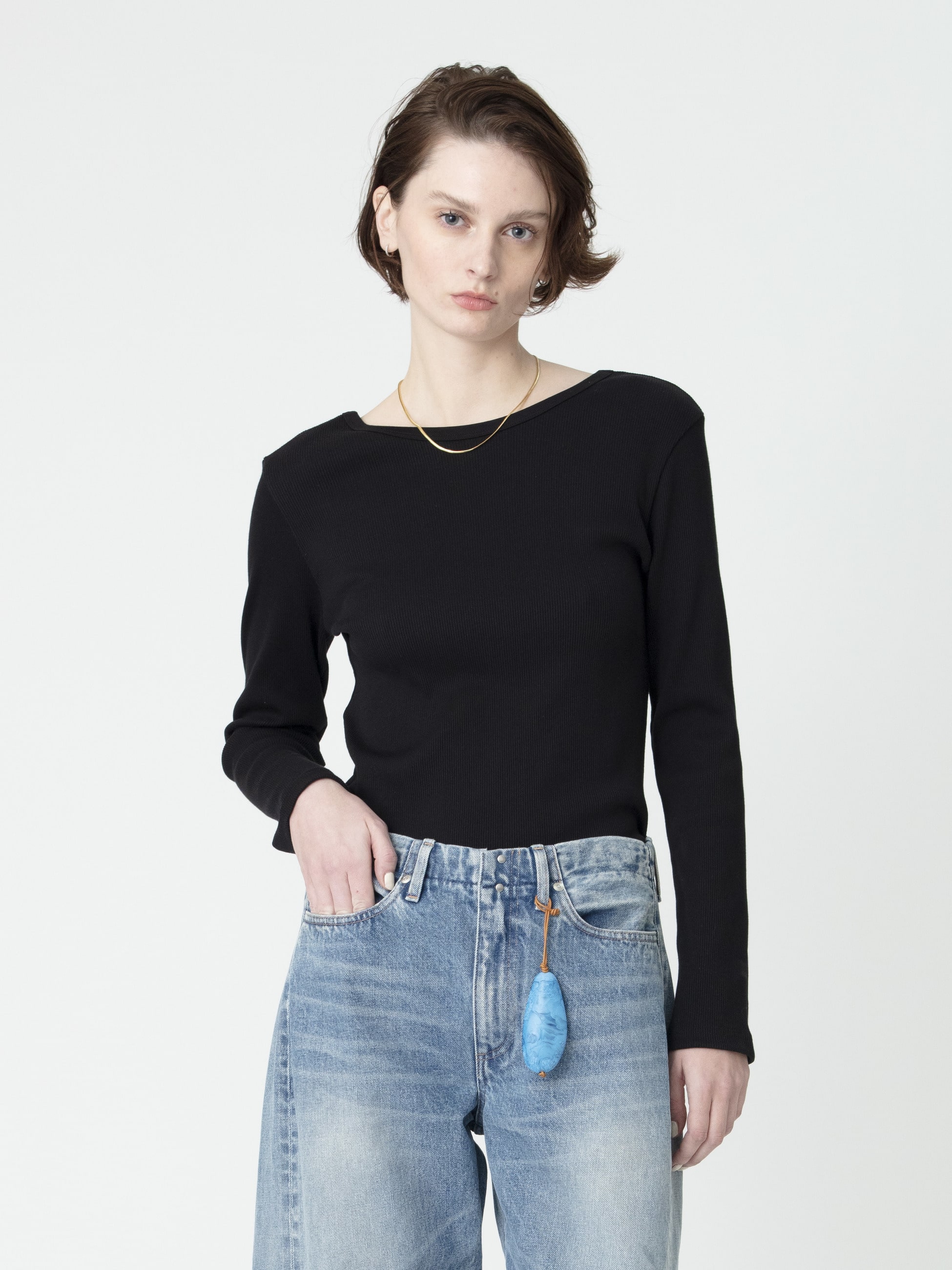 - コットン100%のリブ素材を使用したロングスリーブトップスは、身体に程よく馴染むサイジングがカジュアルながら女性らしさを引き立てます。しっかりとした厚みでインナーも響きにくく、デイリーユースにもぴったりな1枚です。バックのUネックがヘルシーな印象を演出し、ジュエリーをプラスした上品さを纏ったスタイリングもおすすめです。同シリーズのスリーブレストップ(ホワイト/ブラック)もございます。