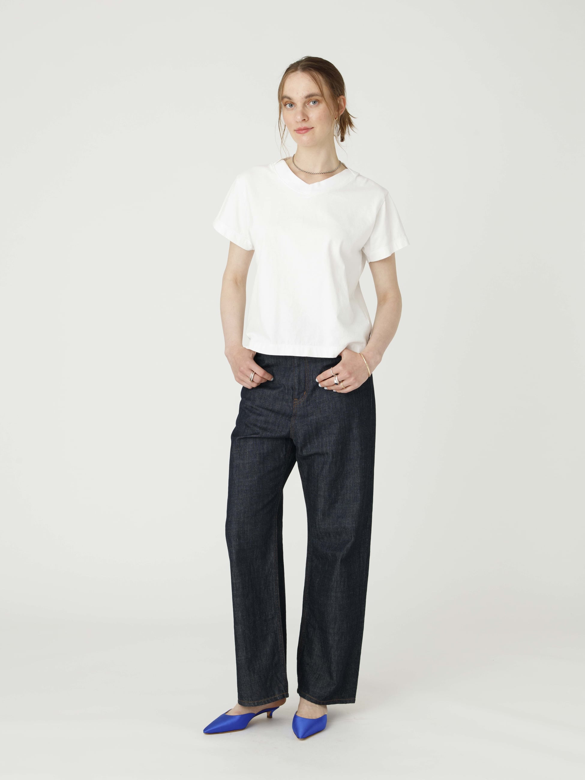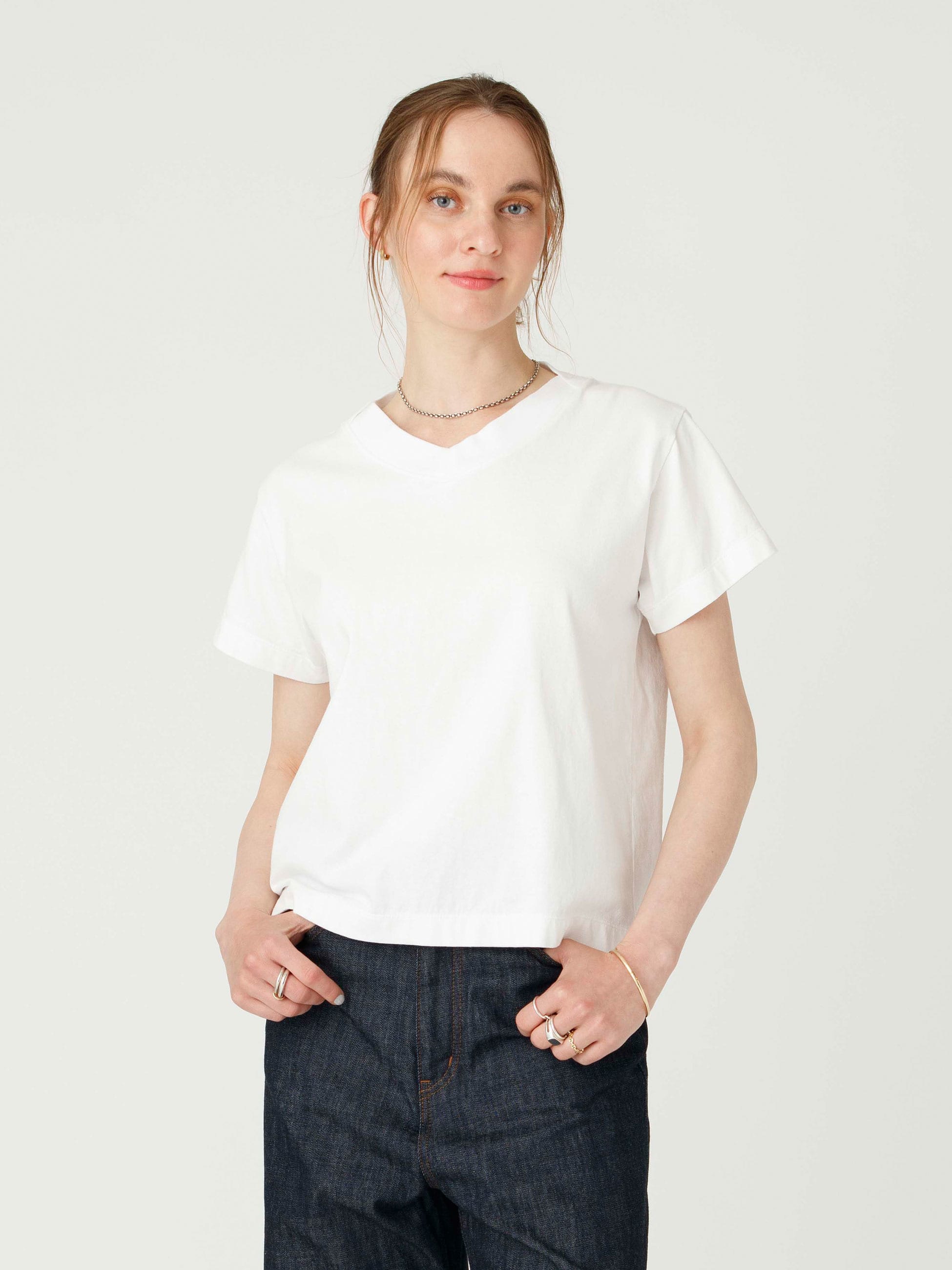 - スラブコットンを使用したTシャツは、ベーシックなシルエットに、ややカーブさせた太めのVネックラインが大人っぽい印象をプラスします。1枚でさらっと着やすく、デイリーユースしやすい汎用性の高いアイテムです。