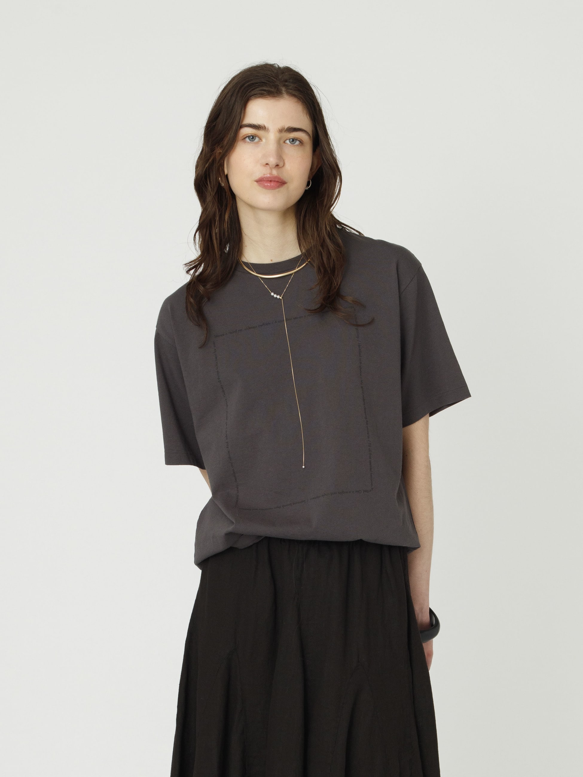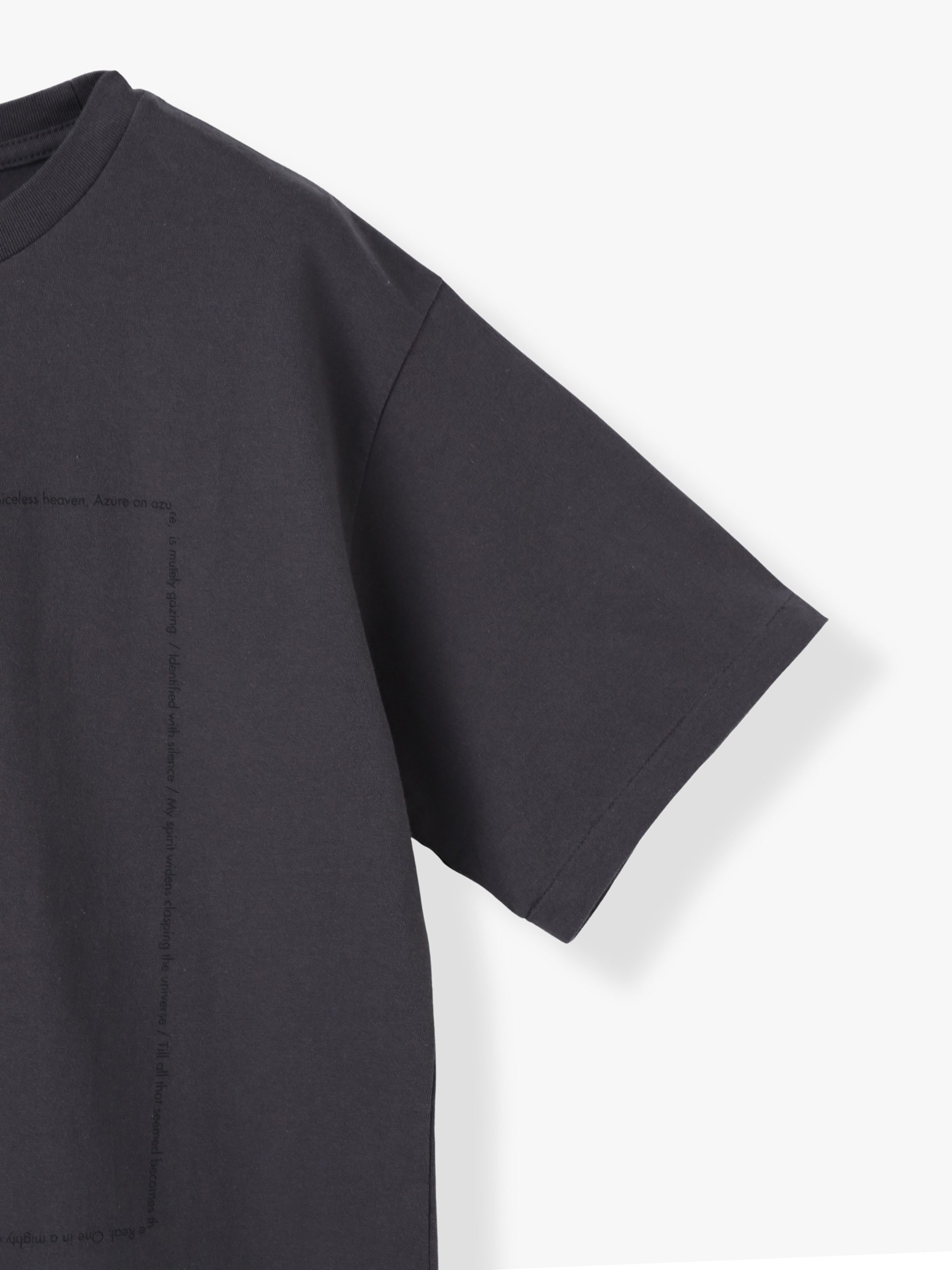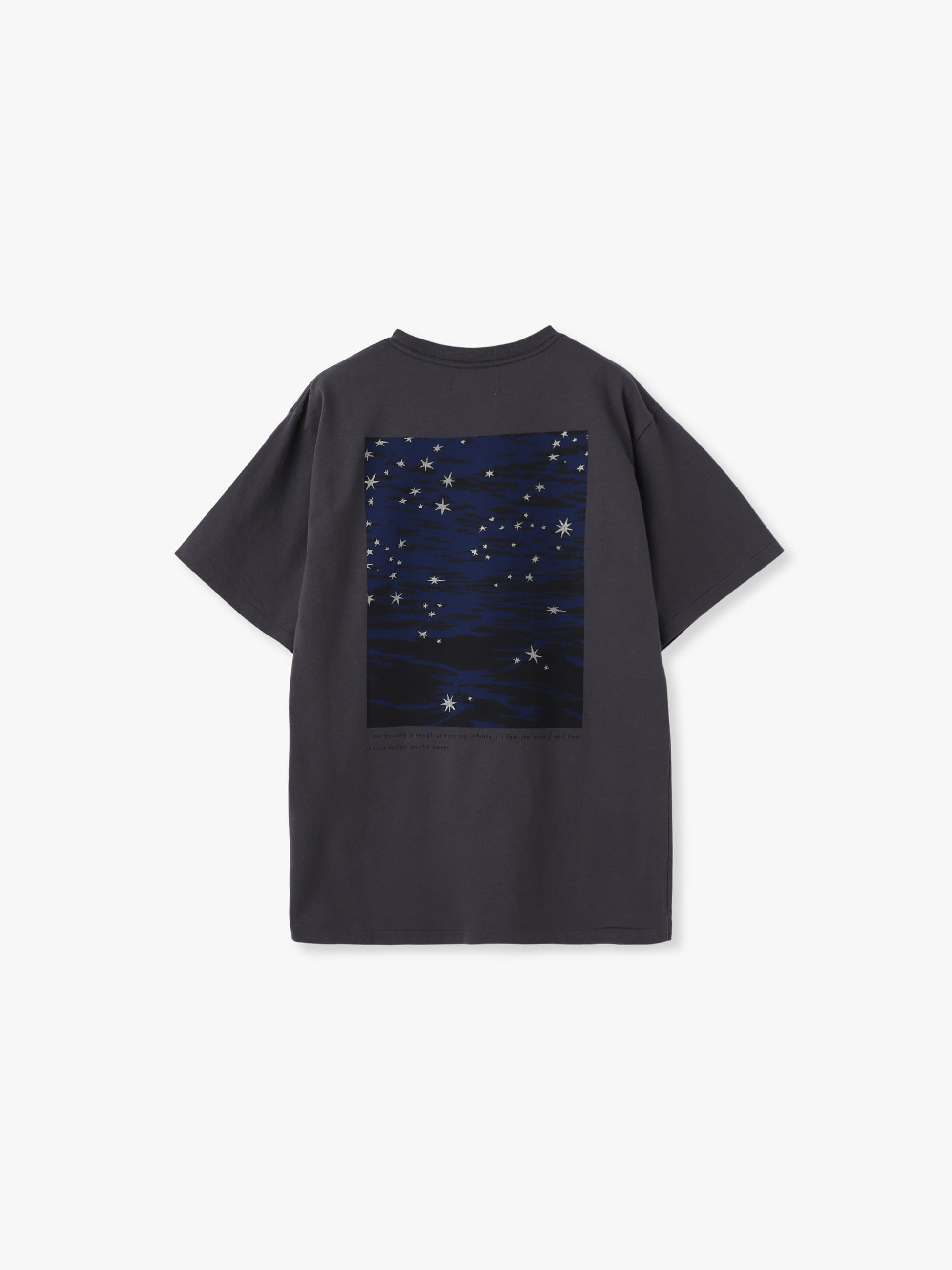 - 静かで暗い夜の海をプリントしたTシャツです。夜空にちりばめられた星は、ラメプリントでキラキラと、フロントにはインドの哲学者の詩の一説が描かれています。程よくゆとりのあるサイズ感で、バランスの取りやすいシルエットに仕上げた1着です。