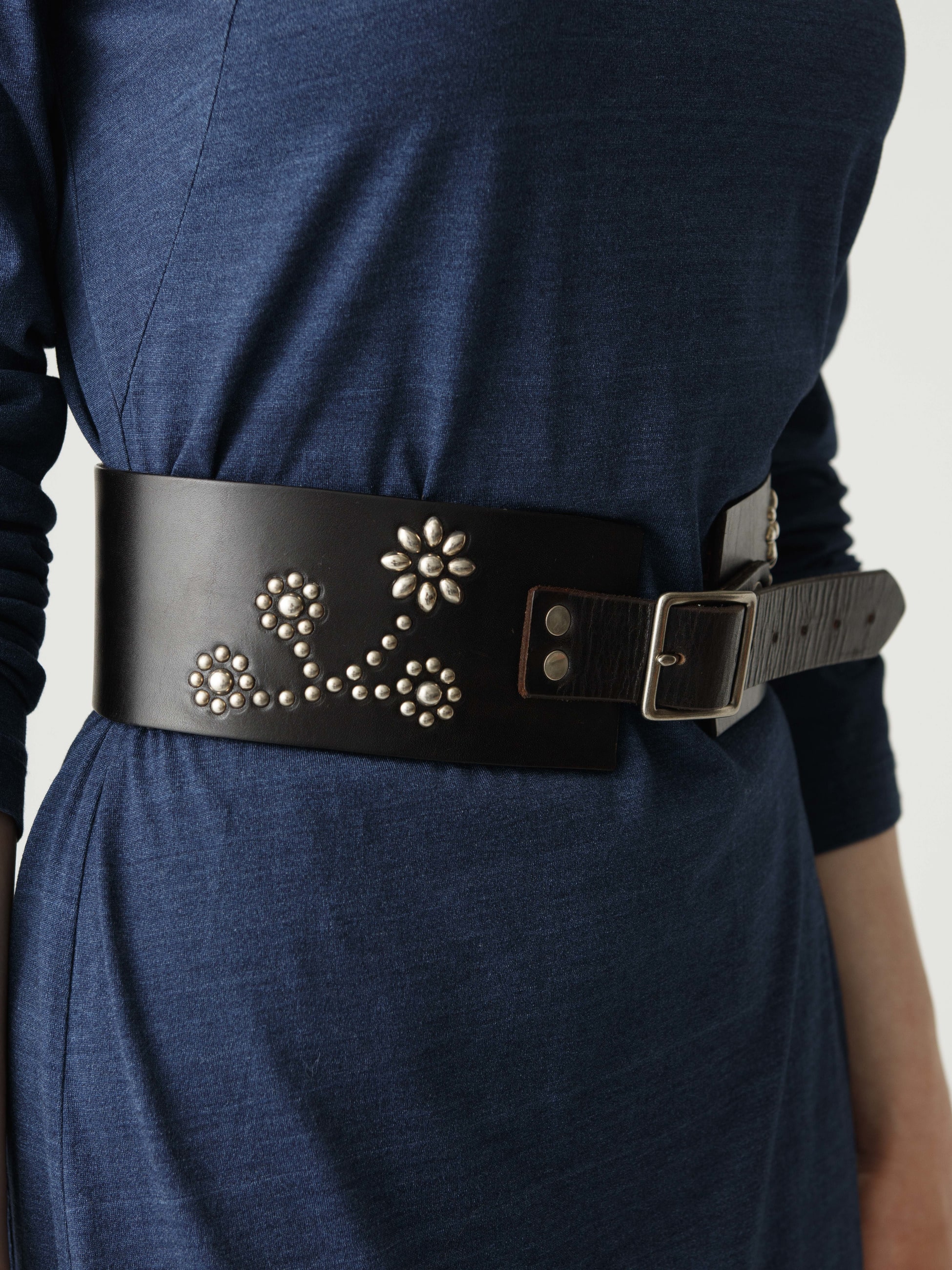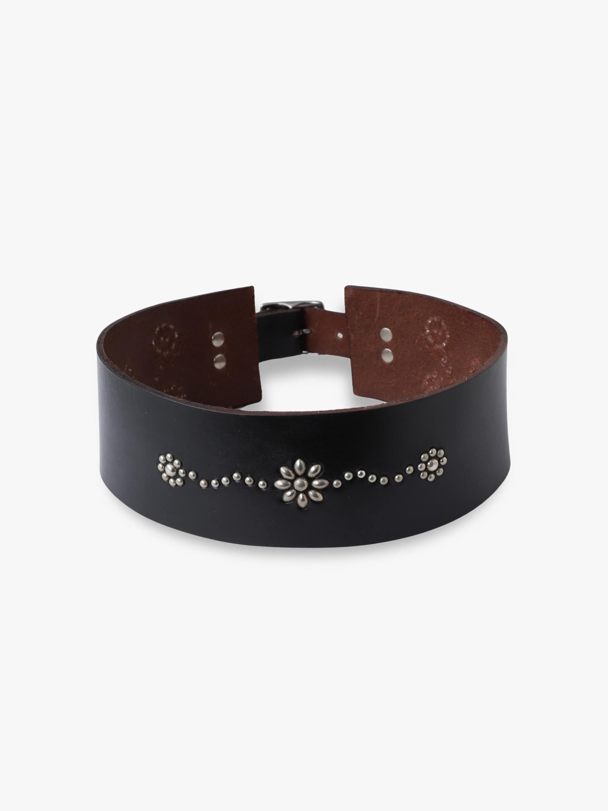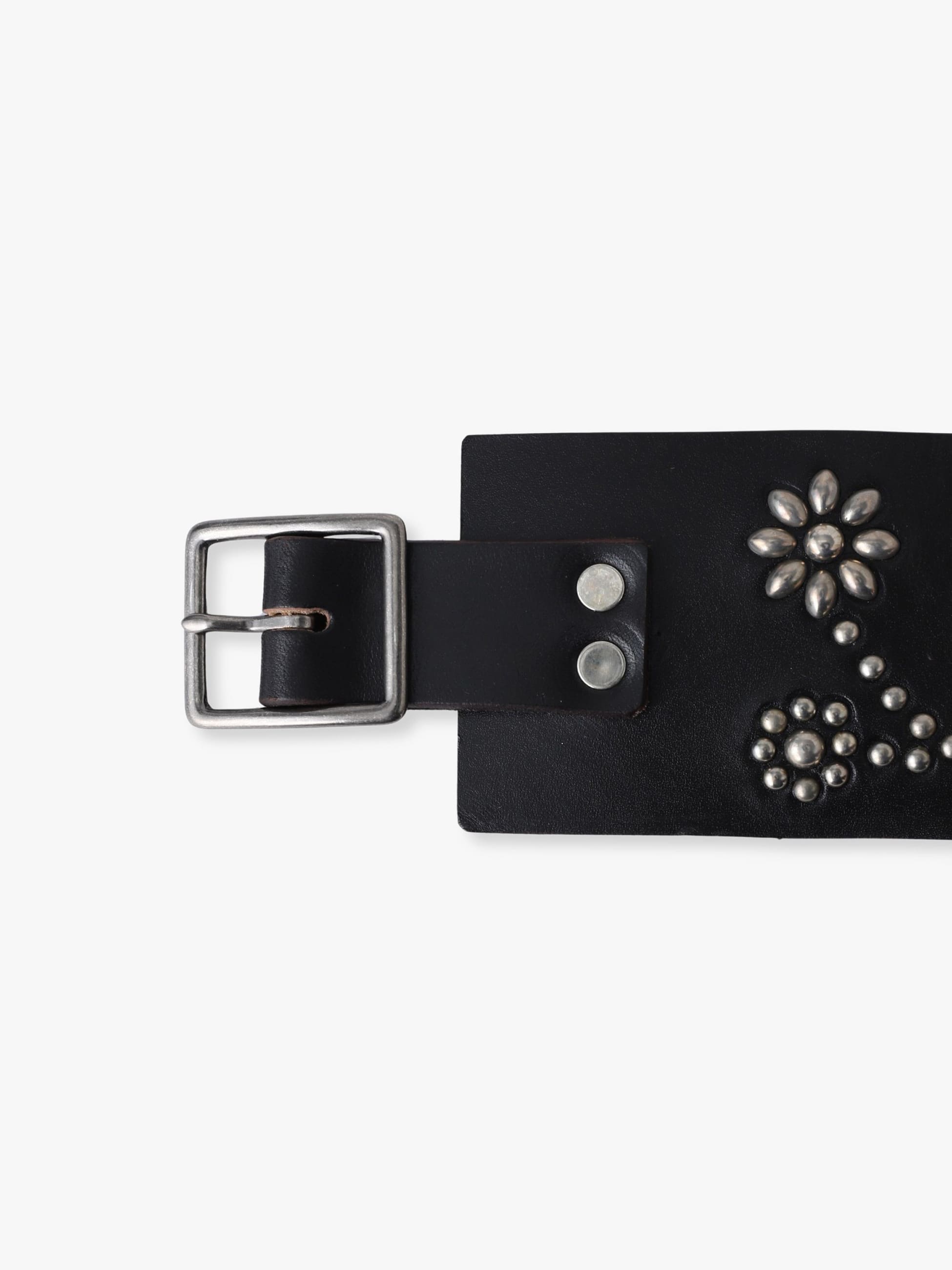 - カリフォルニアを代表するベルトブランド「HTC」に別注した特別なベルトが登場。幅7.5cmのワイドベルトに、HTC定番のフラワーのスタッズワークが広がる無骨なデザインです。肉厚な牛革を使用し、使えば使うほどに馴染みと風合いの出る経年変化もお楽しみいただけます。
