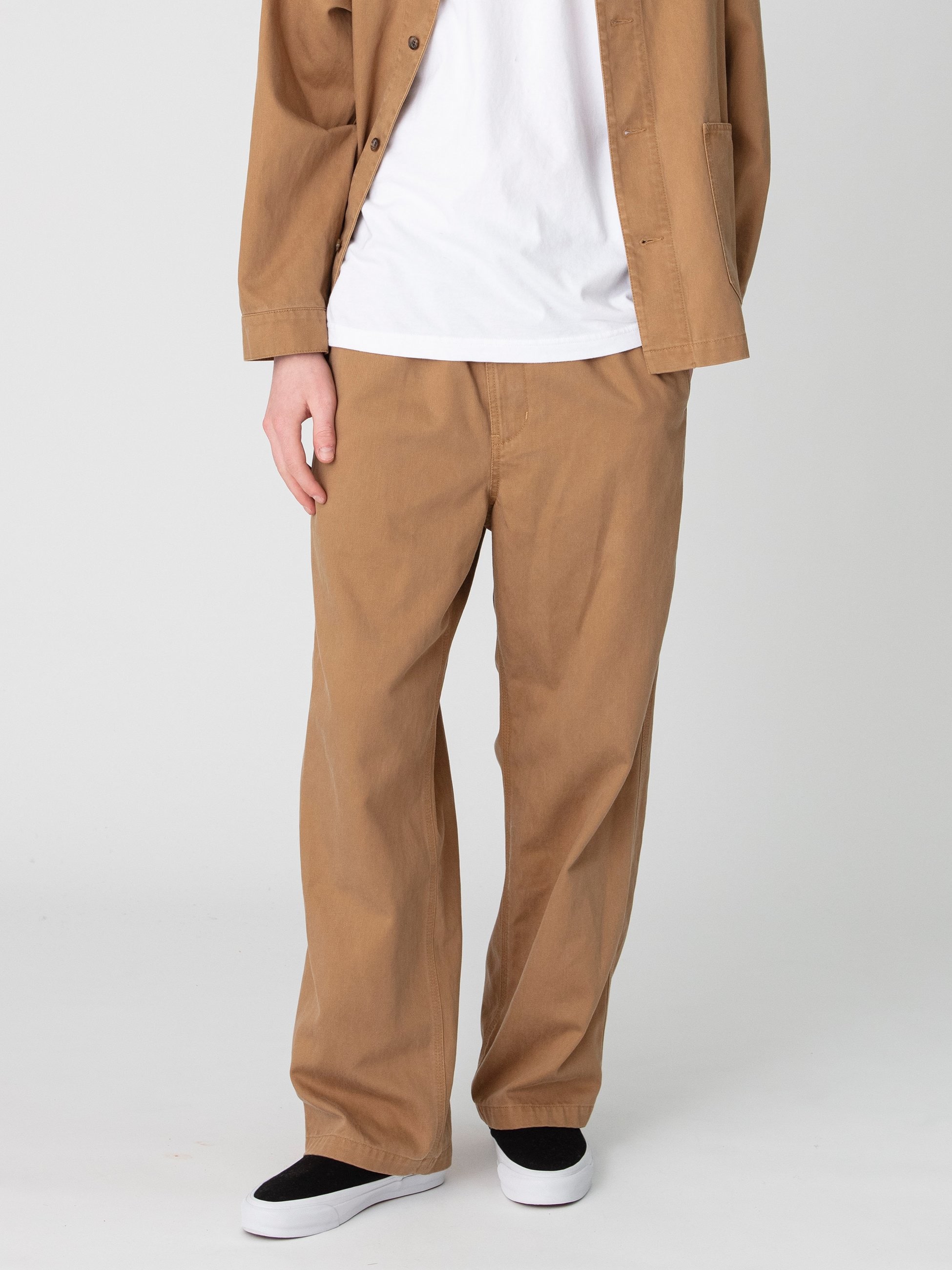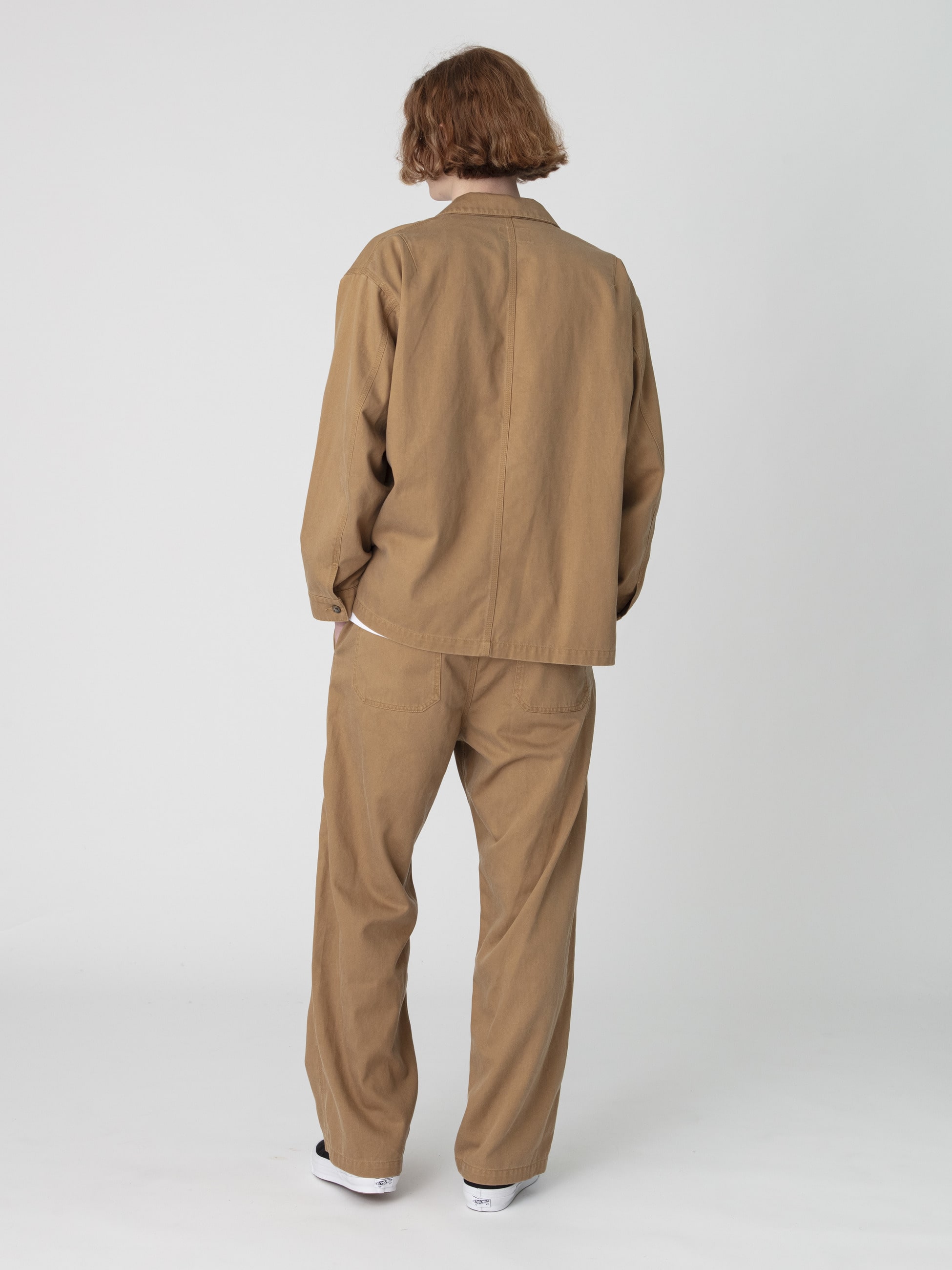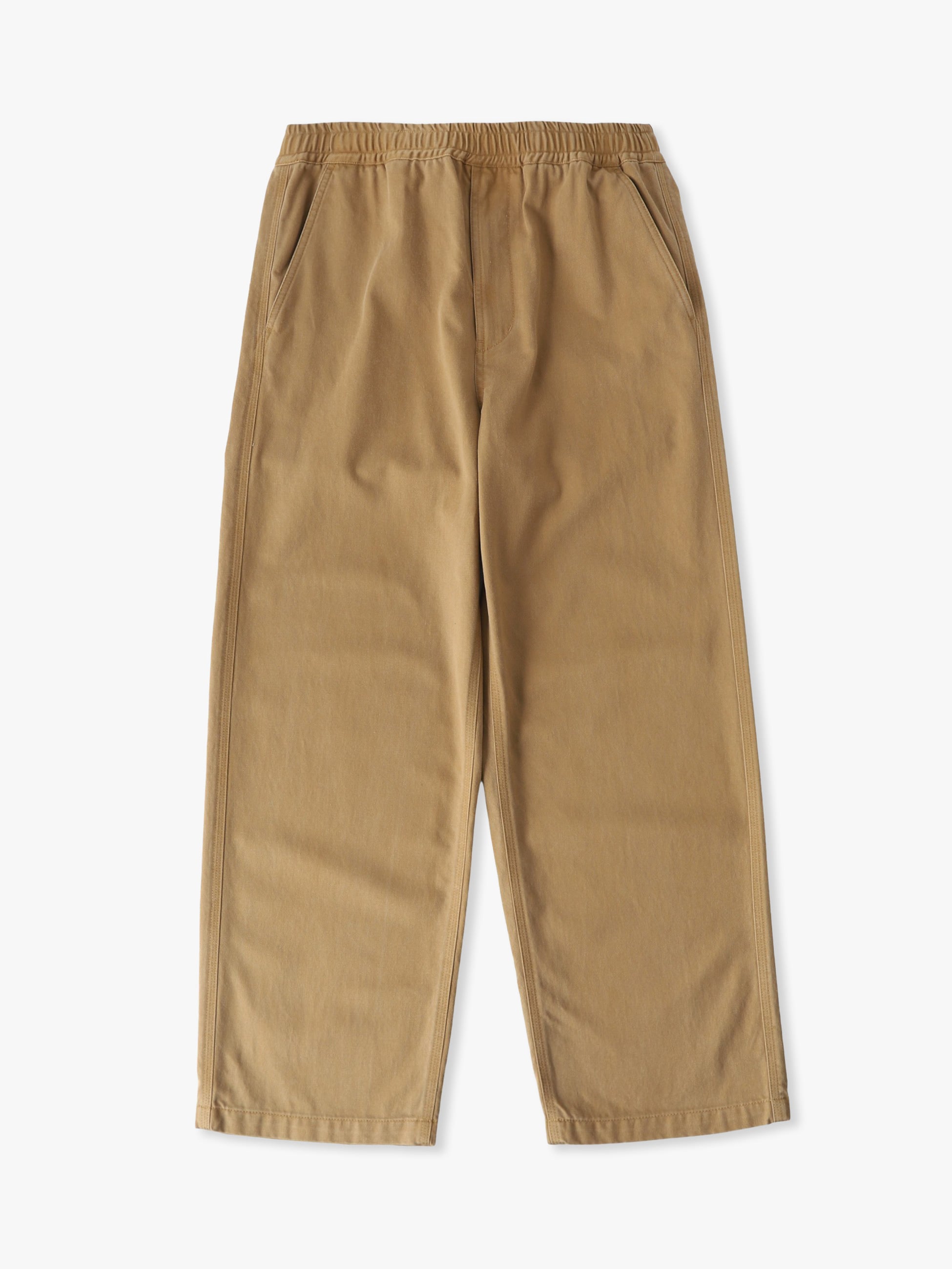 コットンとリヨセルの混紡糸のツイル生地を使用したペインターパンツ。ストーンウォッシュ加工とバイオウォッシュ加工を施した柔らかなドレープ性のある生地感とヴィンテージのような風合いが特徴です。また、トリプルステッチで仕上げた仕様やウエストにゴムを配したイージーな穿き心地もポイント。ゆったりとしたルーズフィットは、デイリーユースしやすい一着です。