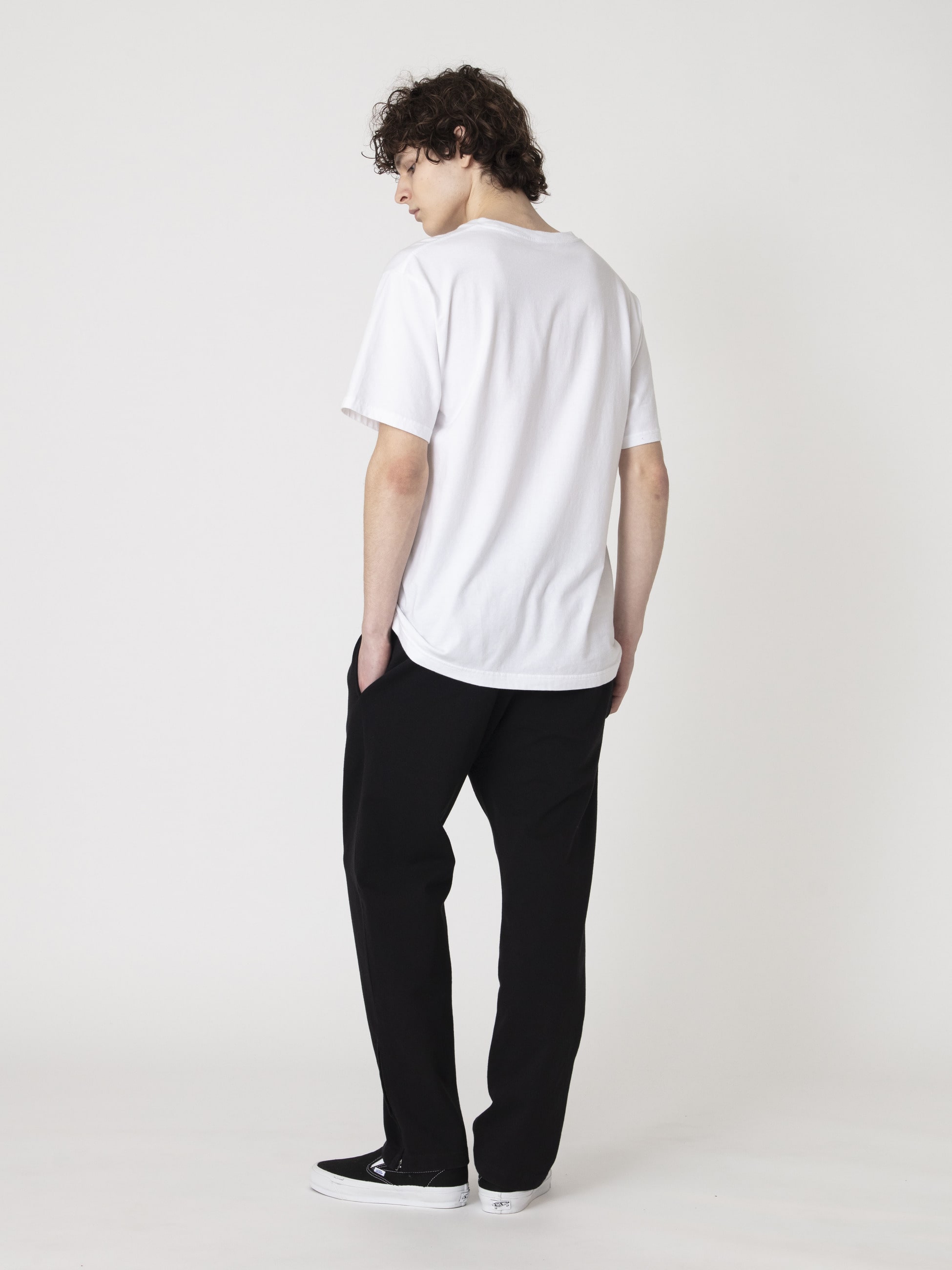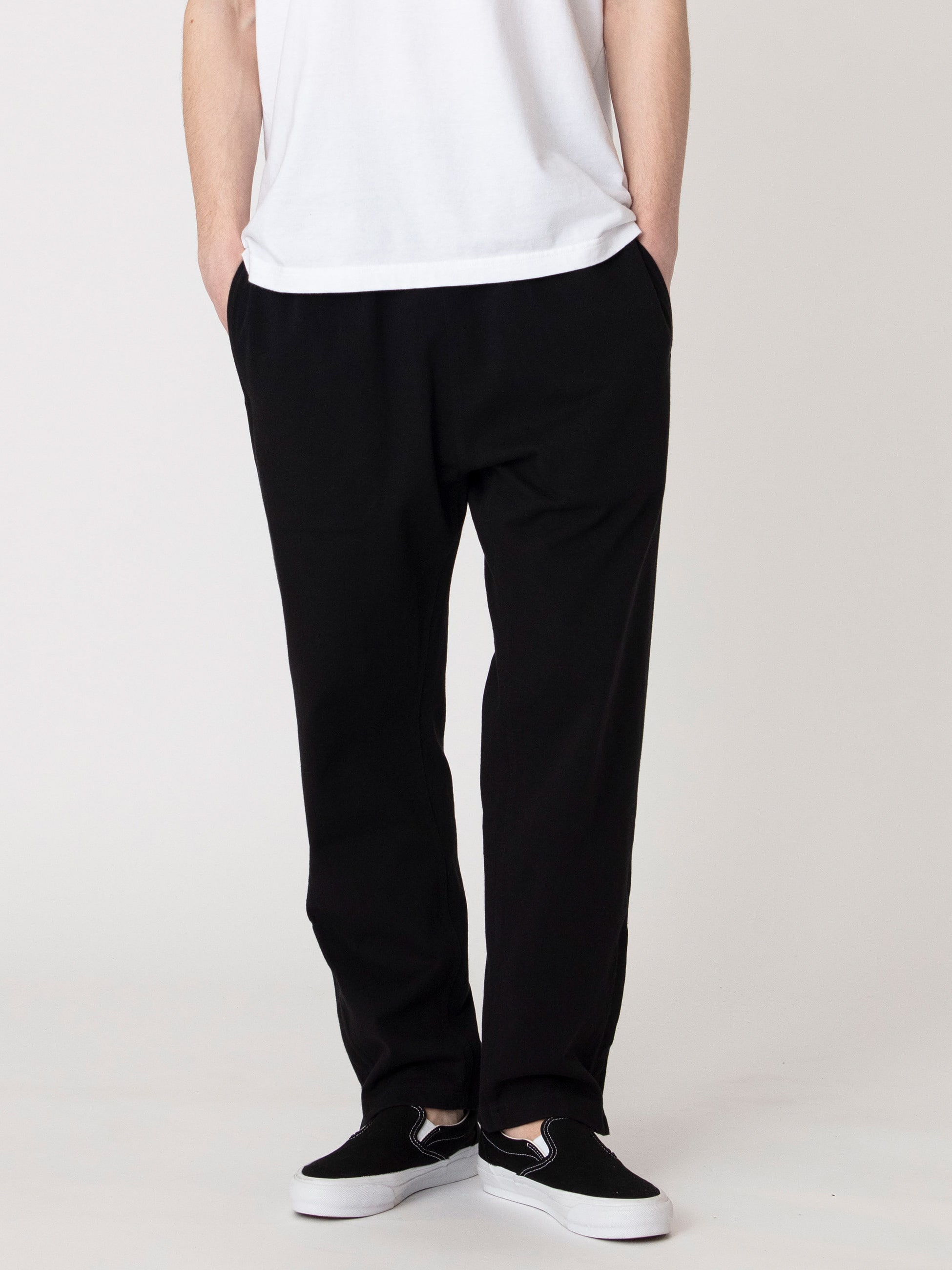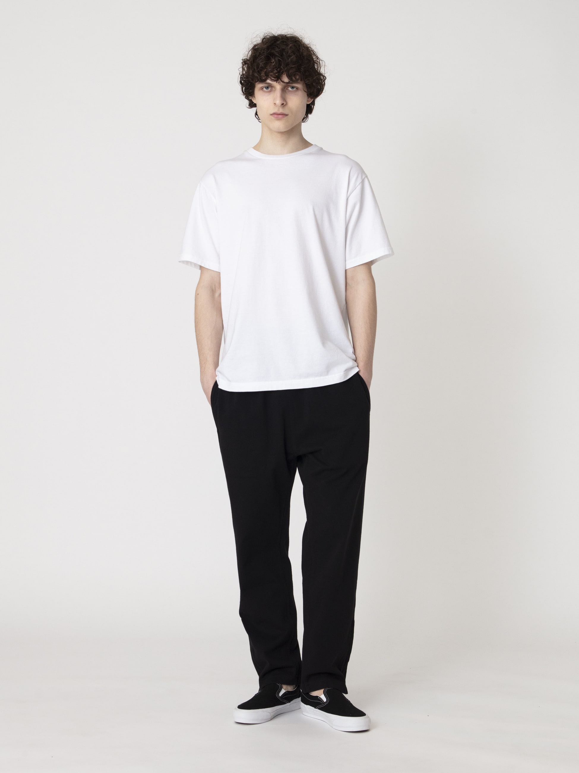 - 天竺素材を使用したパンツは、裏毛の裏側のループを無くした特殊構造を採用することで、程よく厚みとコシや柔らかな肌触りを実現しています。また、裾にジップを配したシルエットに変化をつけられる仕様とテーパードを利かせたすっきりとしたフィットは、デイリーユースしやすい一着です。