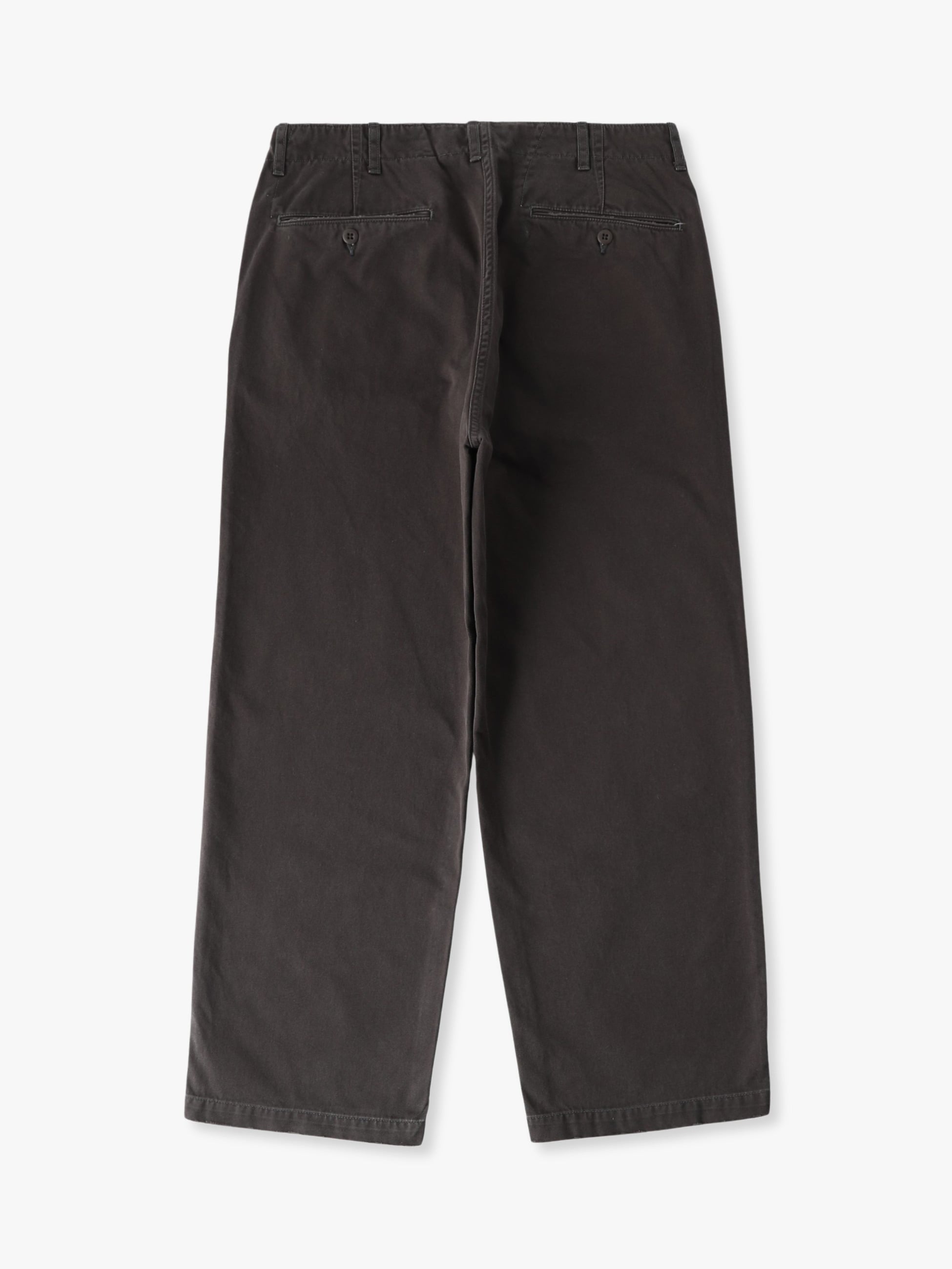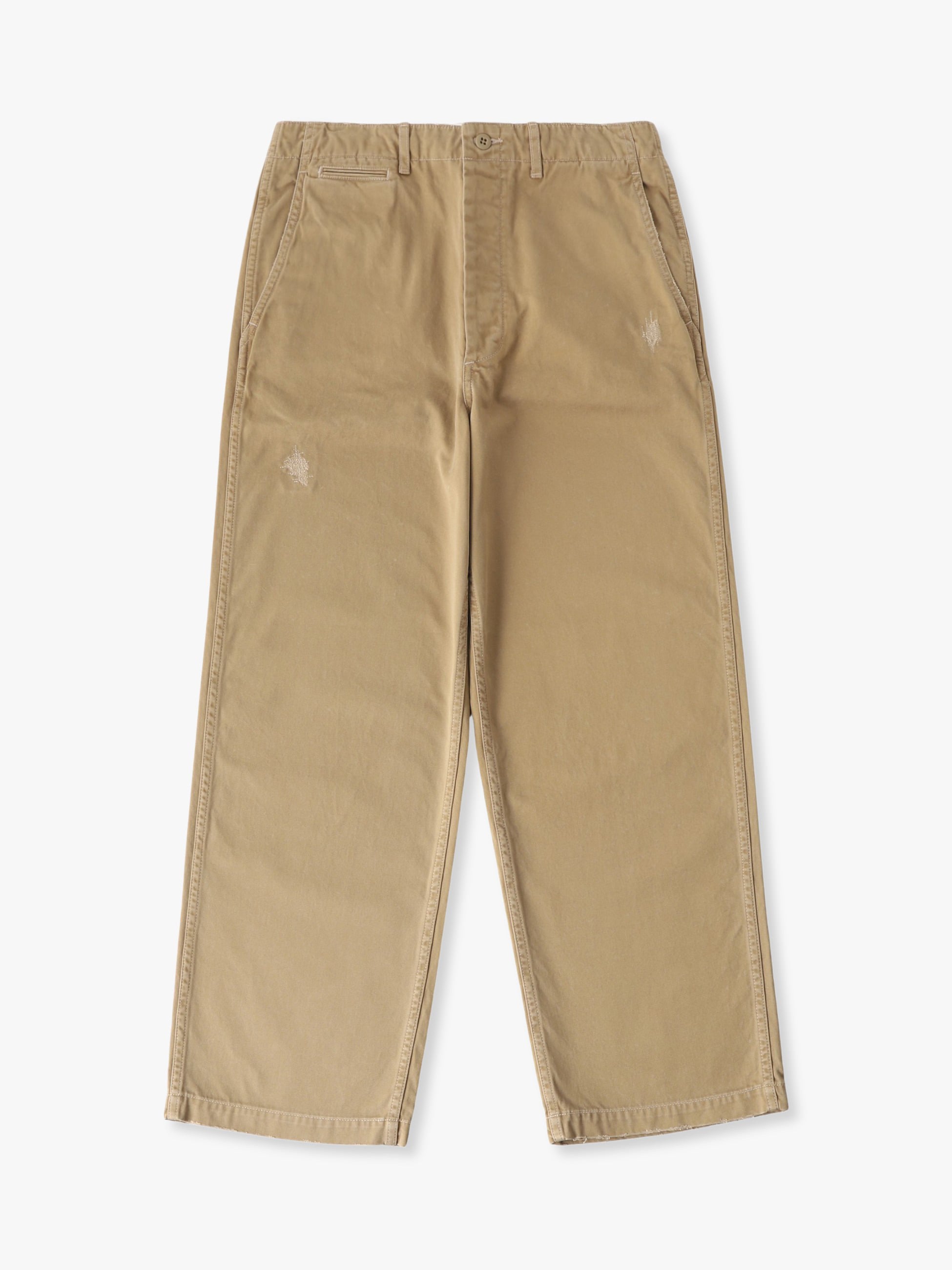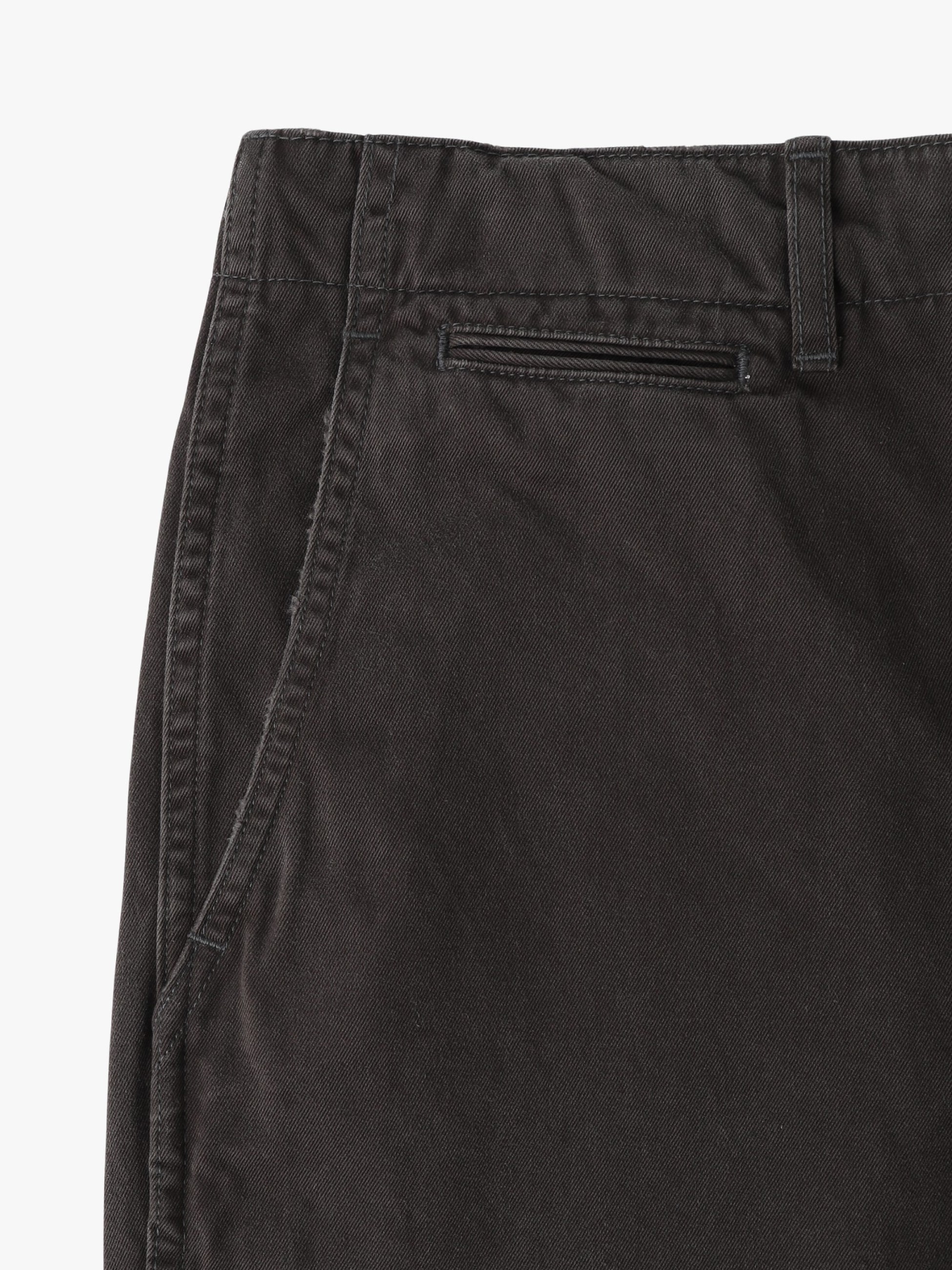 - オーガニックコットンのコンパクト糸を双糸使いしたチノパンツ。薄手ながらもハリ感があり、目面のきれいな上品な風合いが特徴です。また、ロングストーンウォッシュ加工とダメージ加工やガチャミシンを施した、ヴィンテージのようなディテールも魅力のひとつ。ゆったりとしたストレートフィットは、様々なコーディネートに合わせやすく、汎用性の高い一着です。