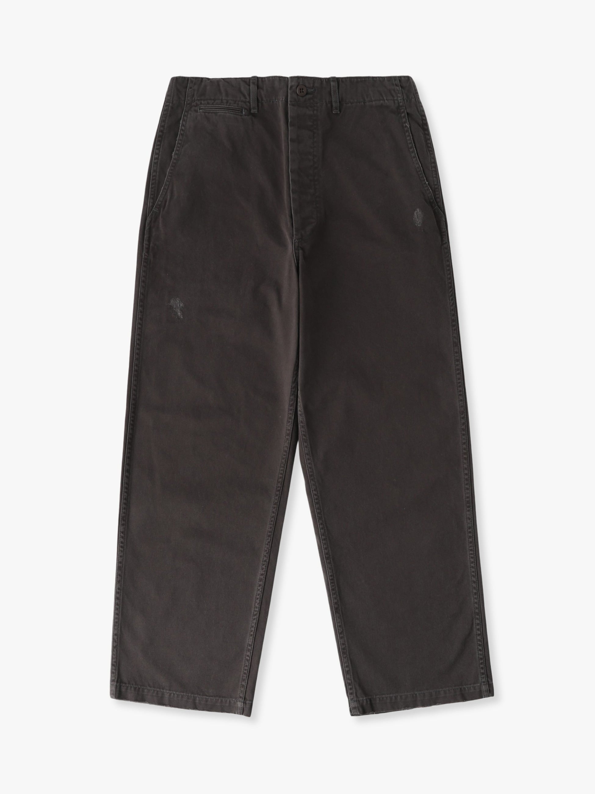 - オーガニックコットンのコンパクト糸を双糸使いしたチノパンツ。薄手ながらもハリ感があり、目面のきれいな上品な風合いが特徴です。また、ロングストーンウォッシュ加工とダメージ加工やガチャミシンを施した、ヴィンテージのようなディテールも魅力のひとつ。ゆったりとしたストレートフィットは、様々なコーディネートに合わせやすく、汎用性の高い一着です。