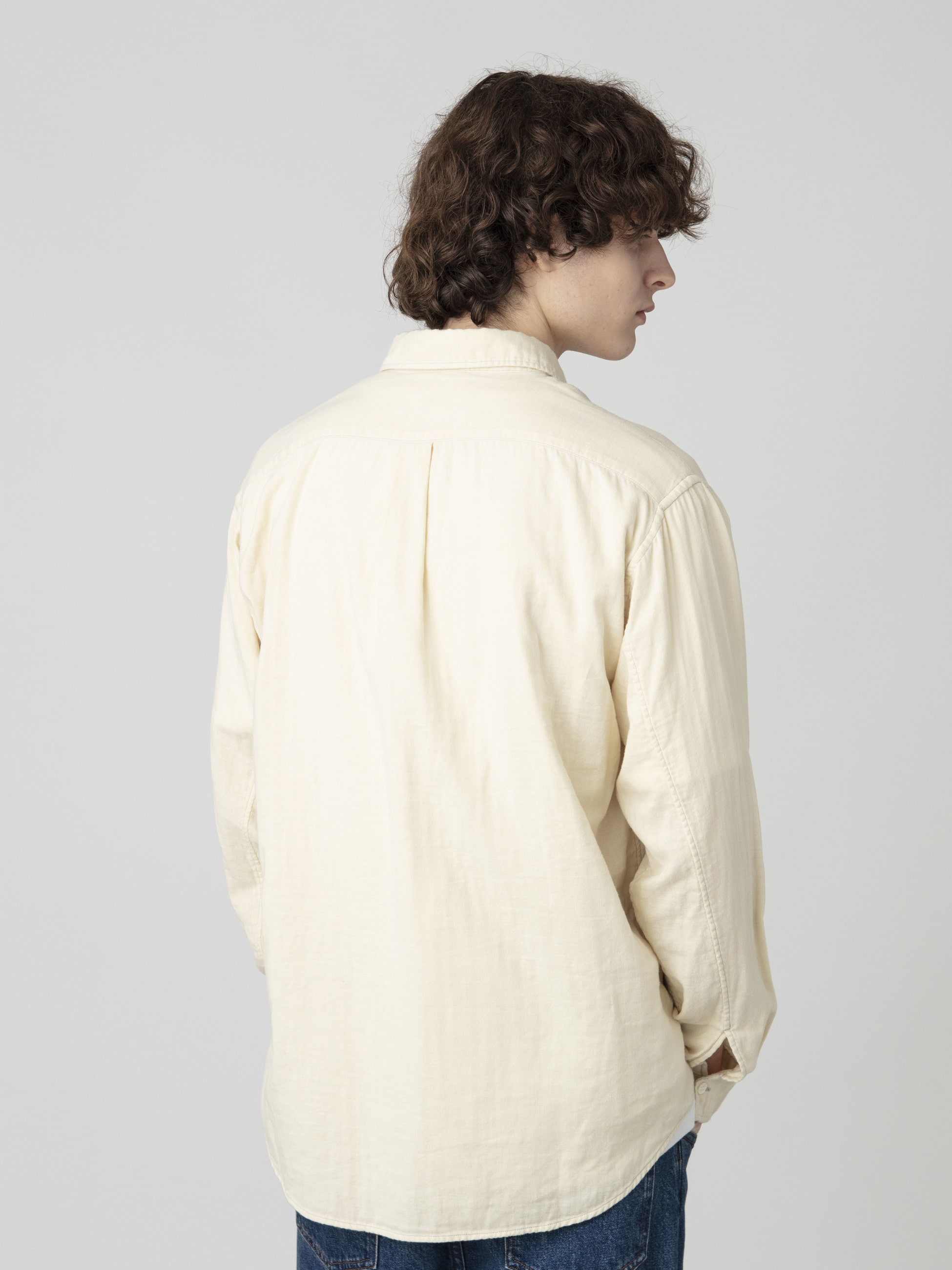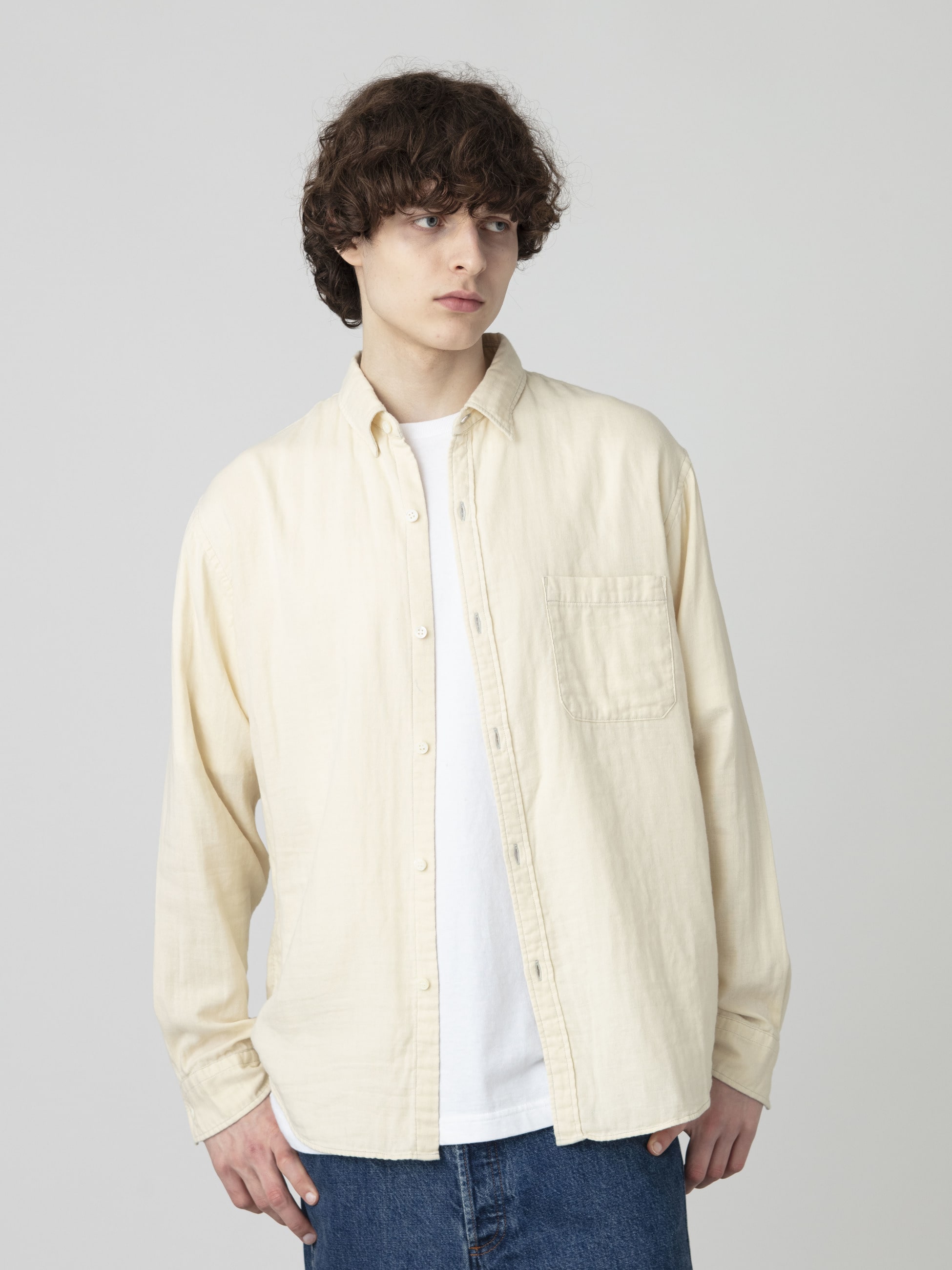 - コットン100%のダブルガーゼ素材を使用したシャツは、ウォッシュ加工を施した柔らかな肌触りとふんわりとした風合いが特徴です。また、軽やかな着心地を活かした柔らかなカラーリングも魅力のひとつ。程よくゆったりとしたレギュラーフィットは、デイリーユースしやすい一着です。