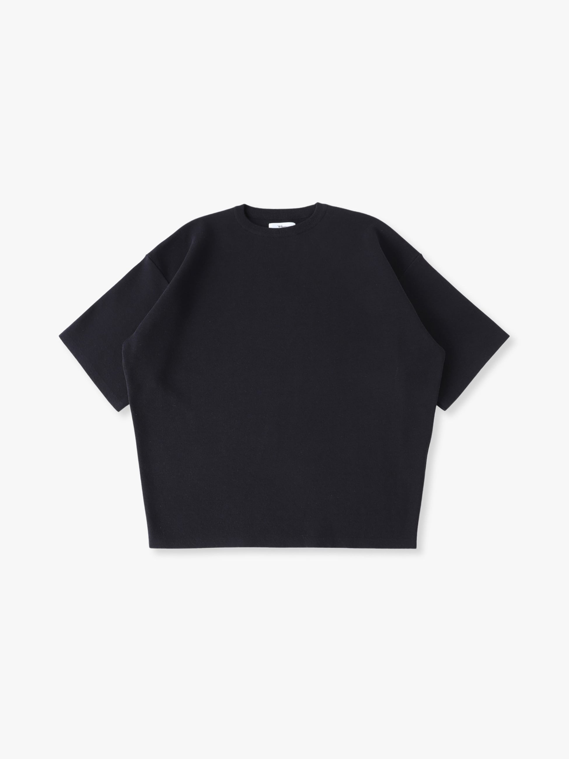 リサイクルコットンを強撚で編み上げたニットTシャツ。18ゲージのスムース編みによる生地は、さらっとした肌触りと程よく厚みのある生地感が特徴です。また、肩から袖にかけてボリュームを出したモダンなデザインも魅力のひとつ。ゆったりとしたフィットは、コーディネートの主役になる一着です。