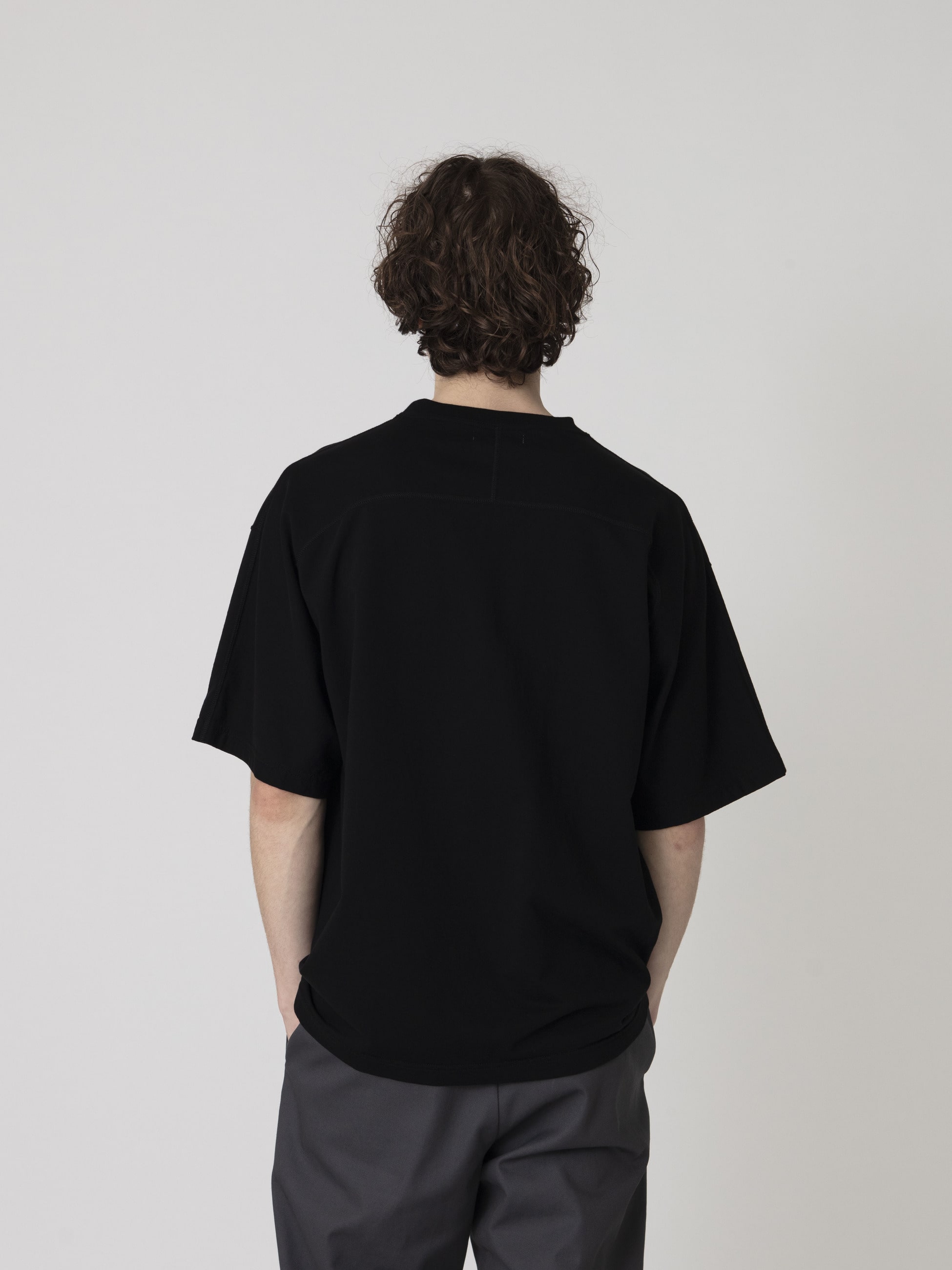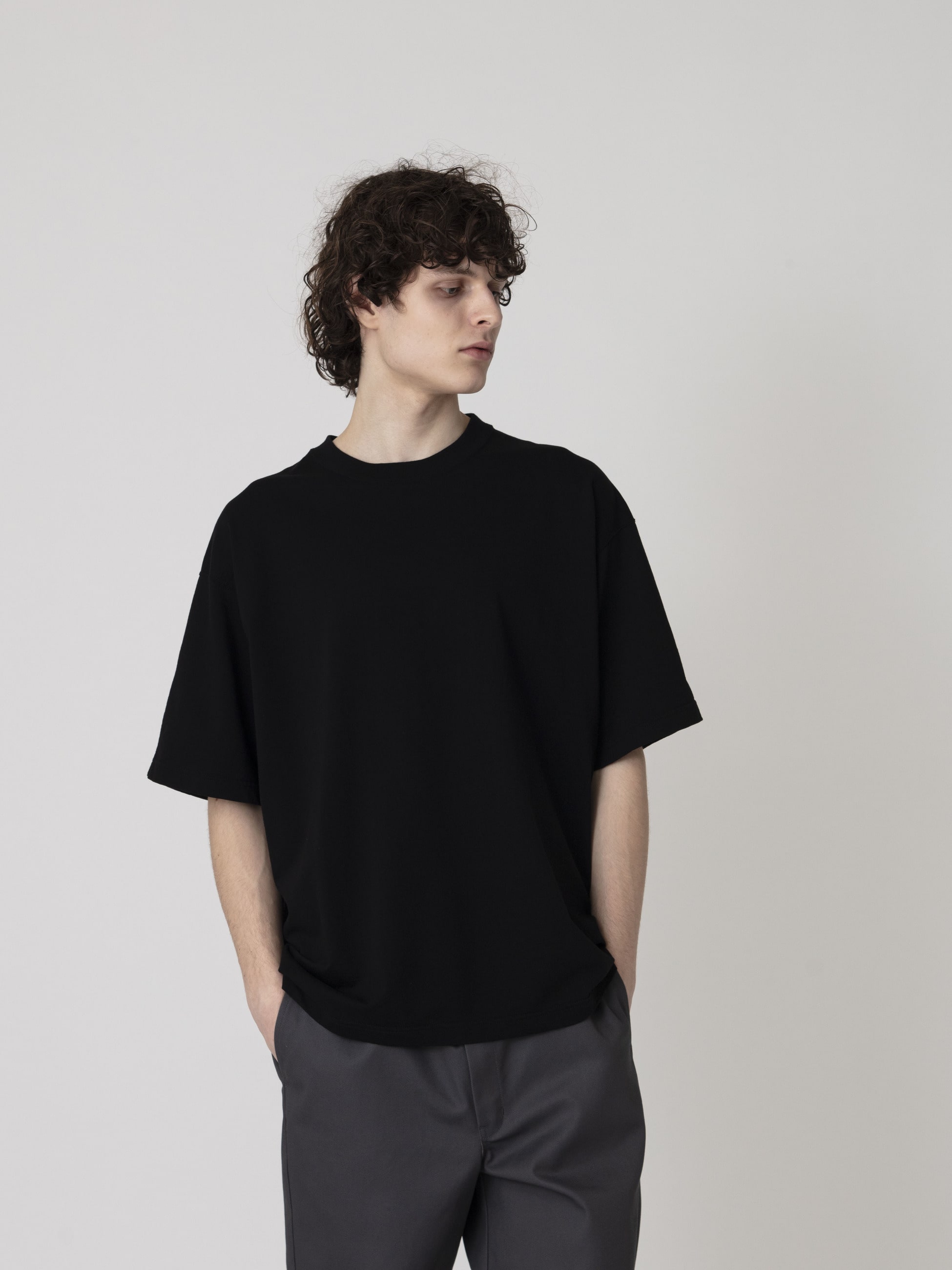 - 繊維が長く滑らかなコーマ糸を36ゲージのハイゲージで編み立てたTシャツ。BLC加工を施すことで毛羽を抑えた滑らかな肌触りと裏面のループ構造による肌離れの良さが快適な着心地を実現しています。また、後ろ身頃にラウンドヨークとラグランスリーブ構造を採用した可動性を高めた仕様もポイント。程よくゆったりとしたフィットは、デイリーユースしやすい一着です。