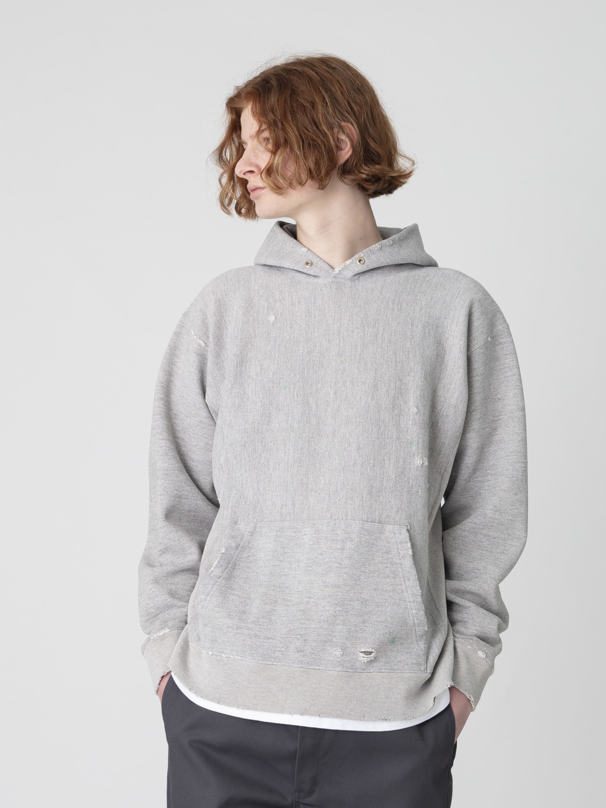 - 90年代のヴィンテージスウェットをベースに、リプロダクションした素材を使用したスウェットフーディー。コットンとポリエステルによる混紡生地は、くたっとした非常に柔らかな肌触りが特徴です。また、ロングストーンウォッシュ加工とバイオウォッシュ加工やダメージ加工などを施した、ヴィンテージのような表情も魅力のひとつ。さらに、リバースウィーブ仕様を採用し、アクティブなシーンでも快適な着心地を実現しています。身幅にゆとりを持たせ、着丈を短めに設定した程よくゆったりとしたフィットは、デイリーユースしやすい一着です。