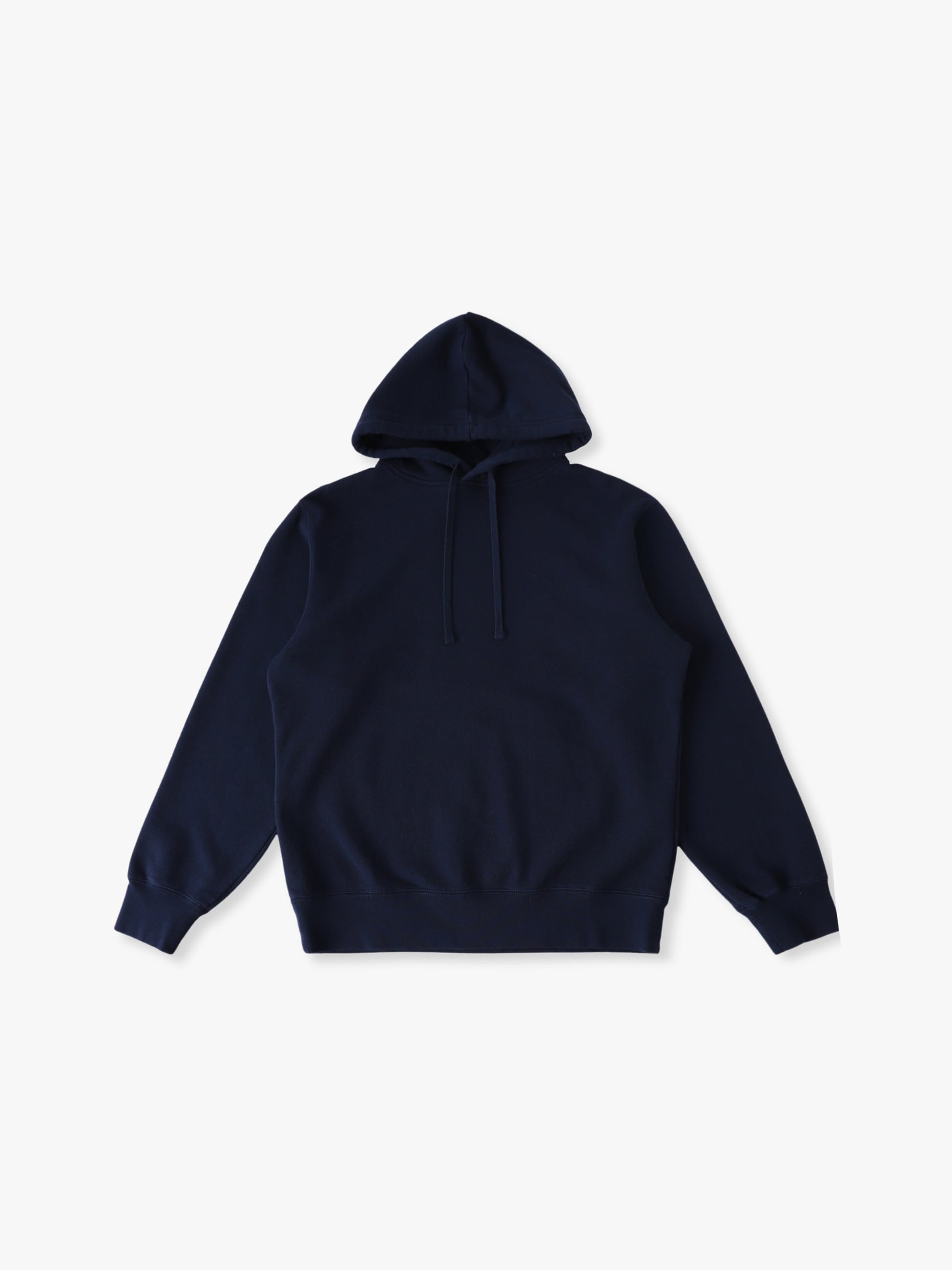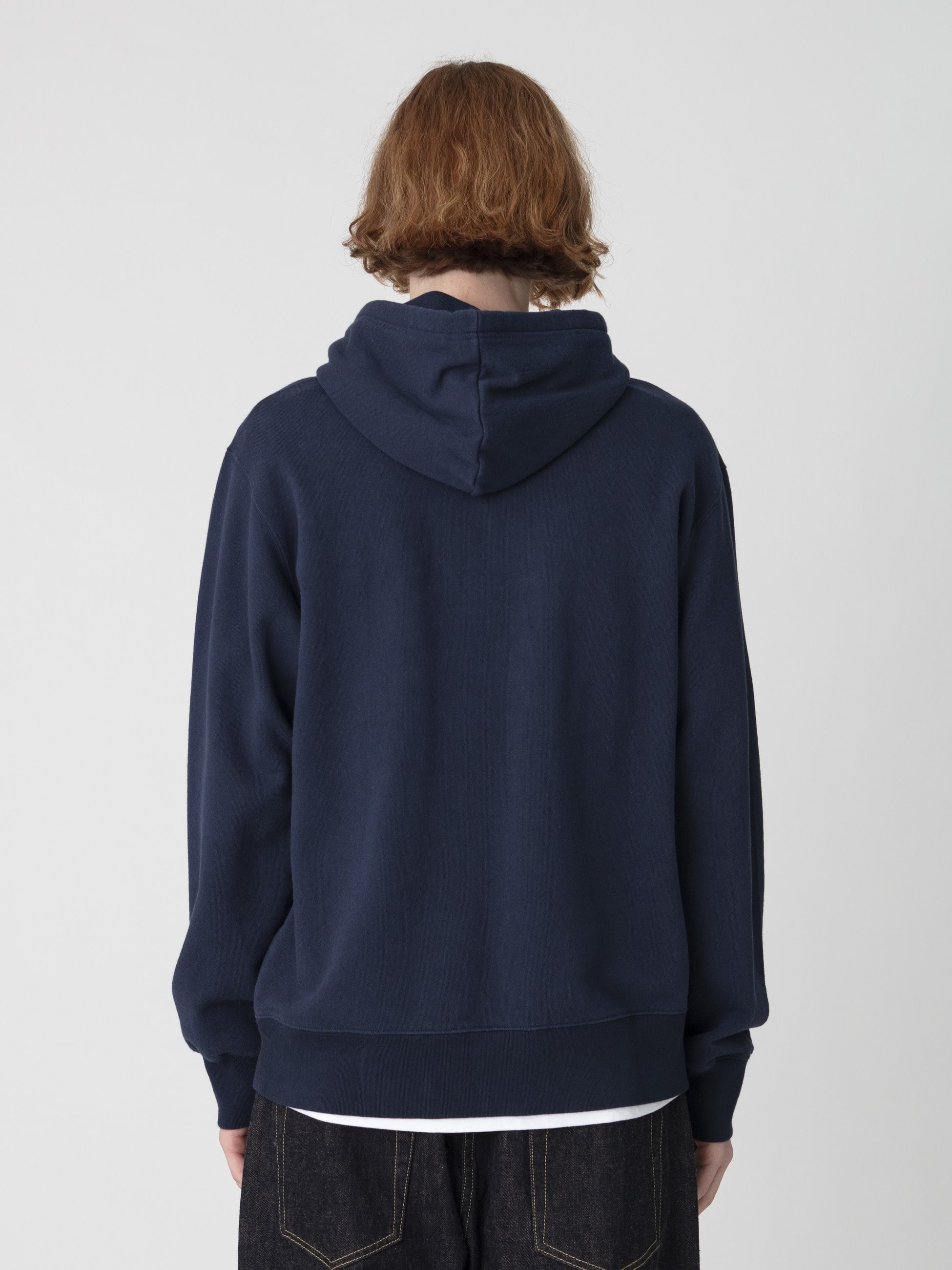 ロンハーマンがもっとも大切にしているベーシックアイテムの定番スウェットシリーズから、オンラインストア限定となるNAVYカラーのスウェットフーディーの登場です。吊り編み機によって丁寧に織られたオリジナルボディーは、中糸と裏地のループを一段階細くしたライトな着心地へ仕上げた3層構造の生地が特徴です。また、ヴィンテージに見られるディテールを一掃し、現代的解釈で、よりシンプルで長く着用いただける定番アイテムへと進化させました。さらに、サイズを見直し、様々な時季で活躍する程よくゆったりとしたフィットへアップデートしています。ミニマルなデザインと、こだわりのオーガニックコットン素材やフィットは、ロンハーマンの定番として長く愛用していただける一着です。