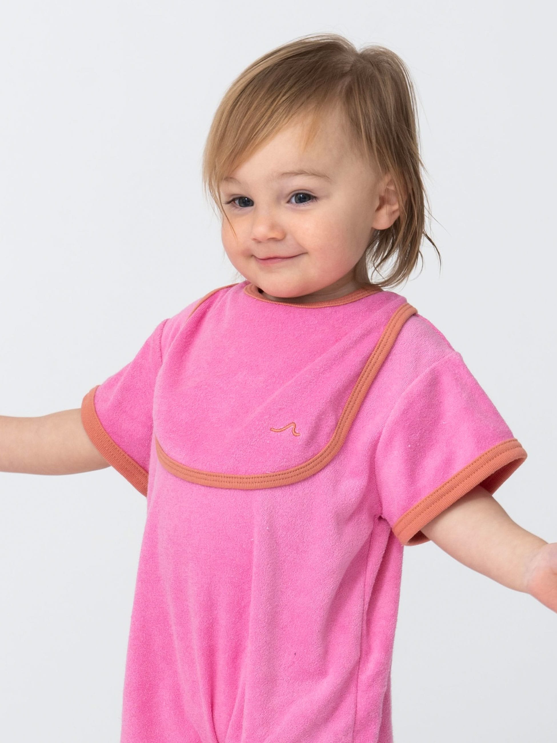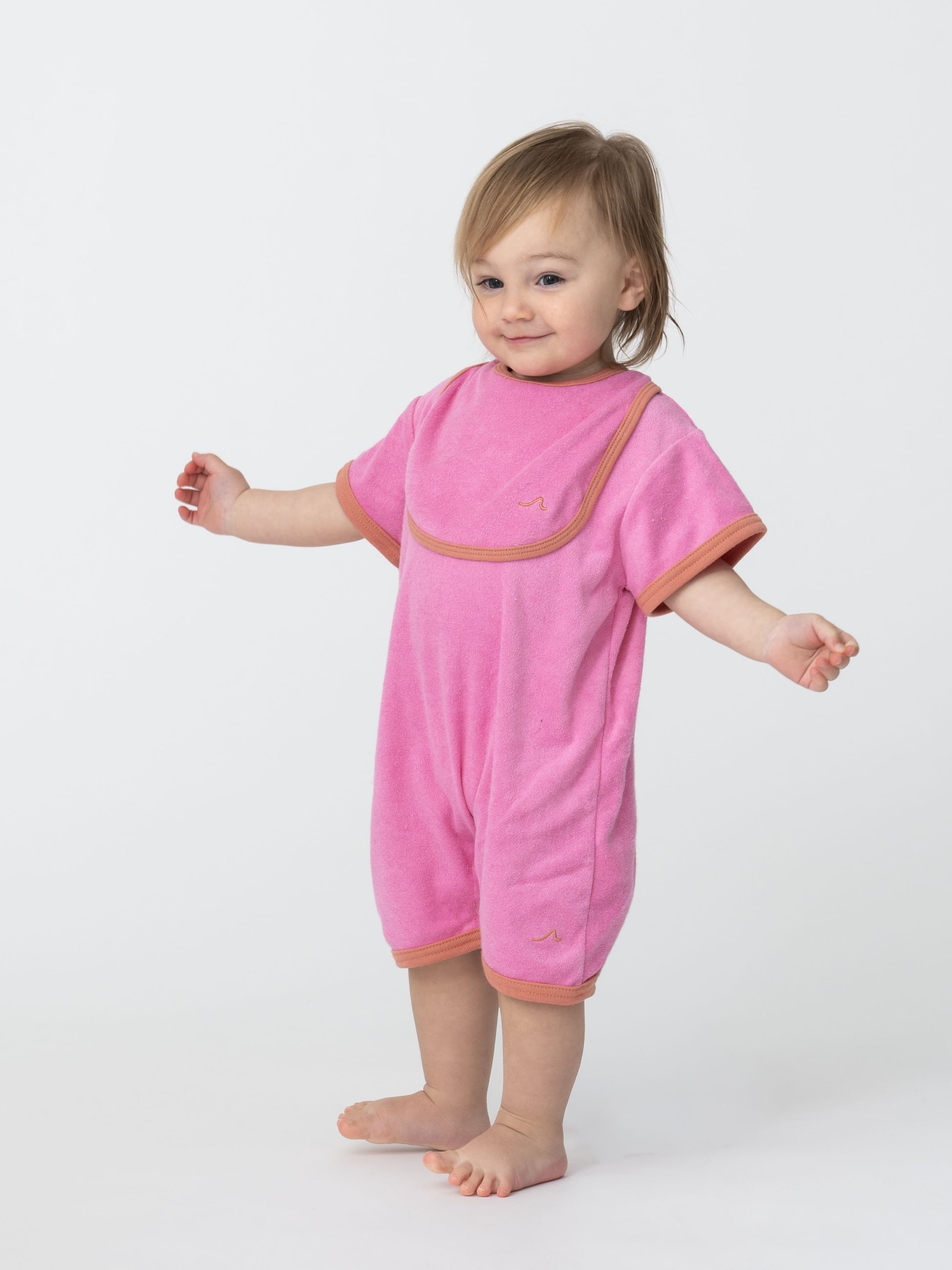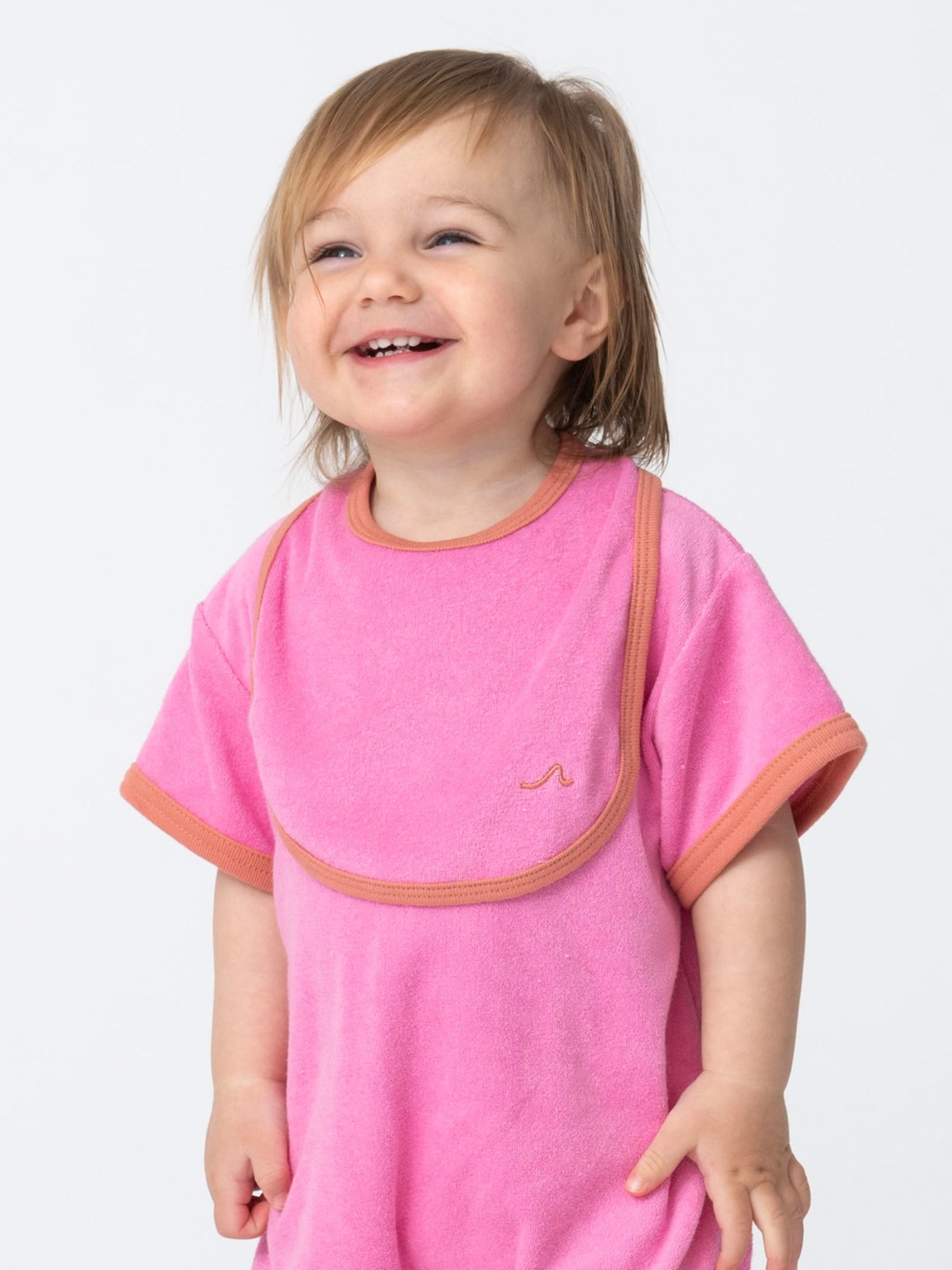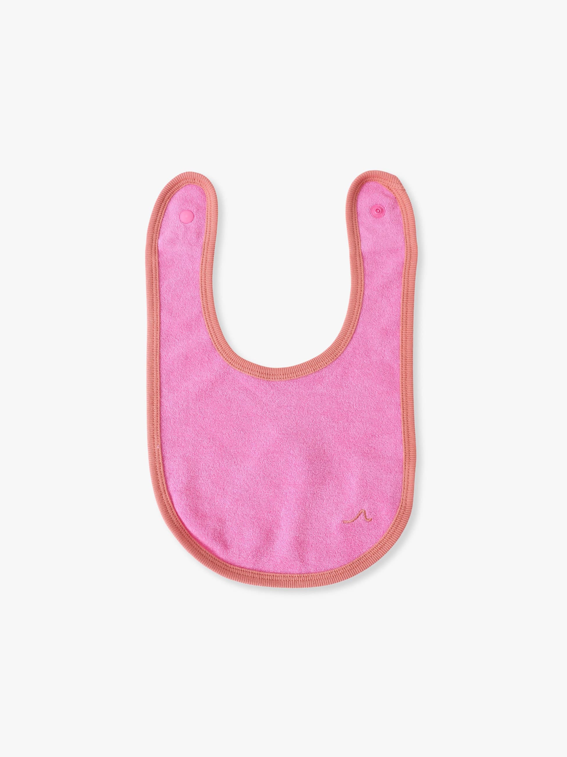 ふんわりとした肌触りのよいビブは、やさしいパイル生地を使い軽やかで柔らかな着心地です。吸水性が高いため、ミルクやよだれをしっかりキャッチします。遊び心ある配色のパイピングもアクセントになり、デザイン性と実用性の両方を兼ね備えた頼れるアイテムです。