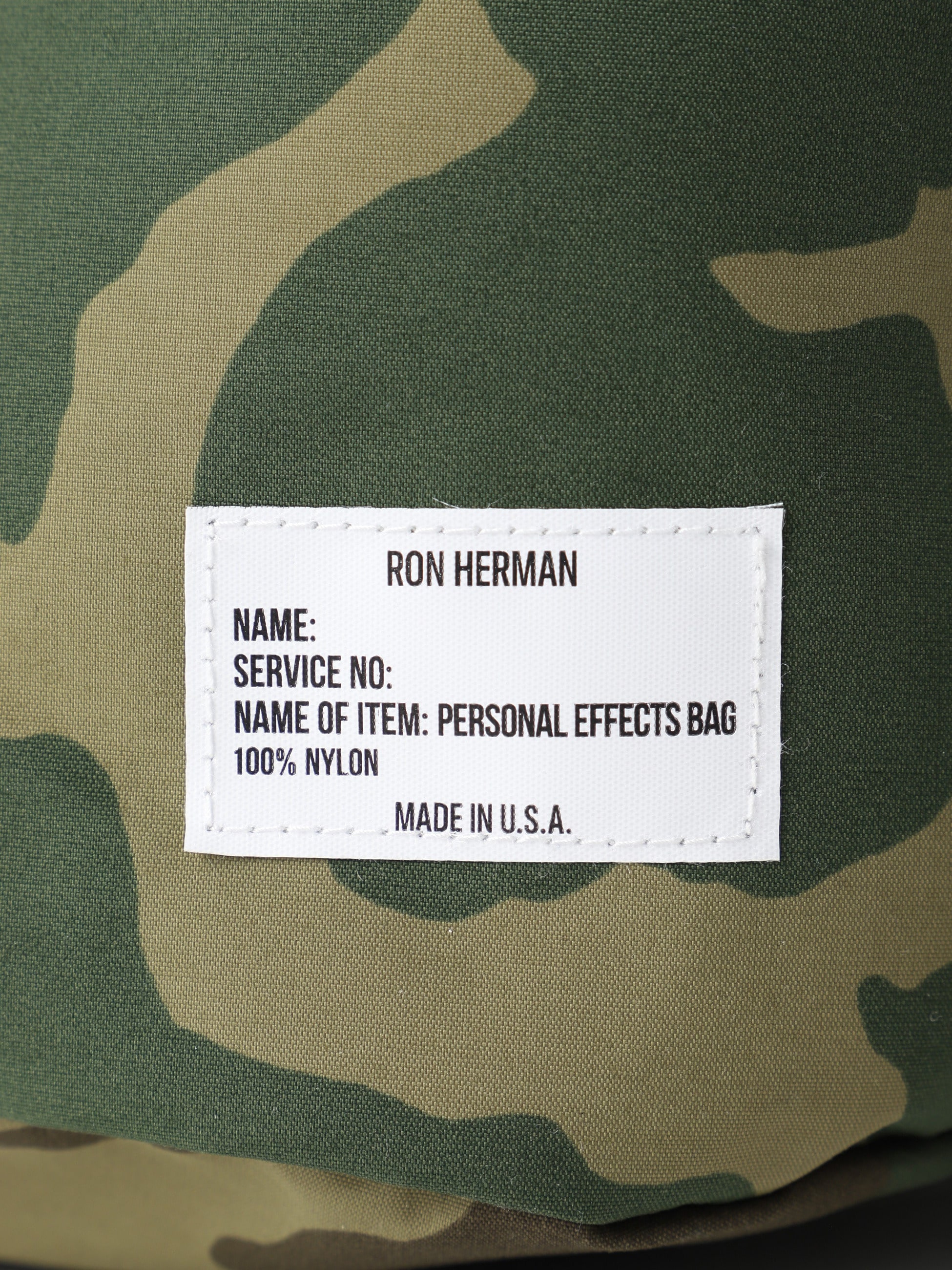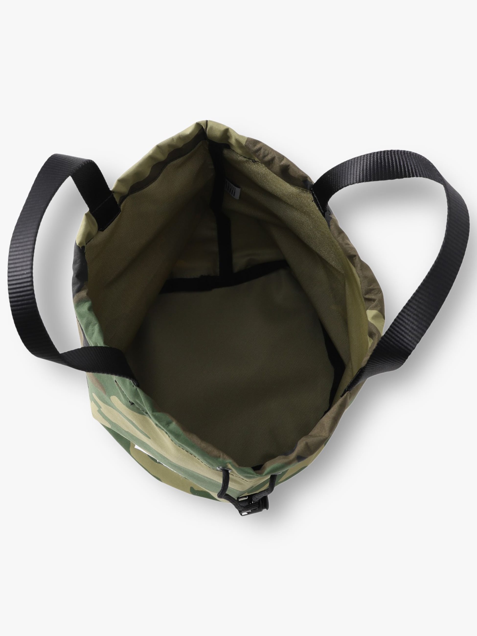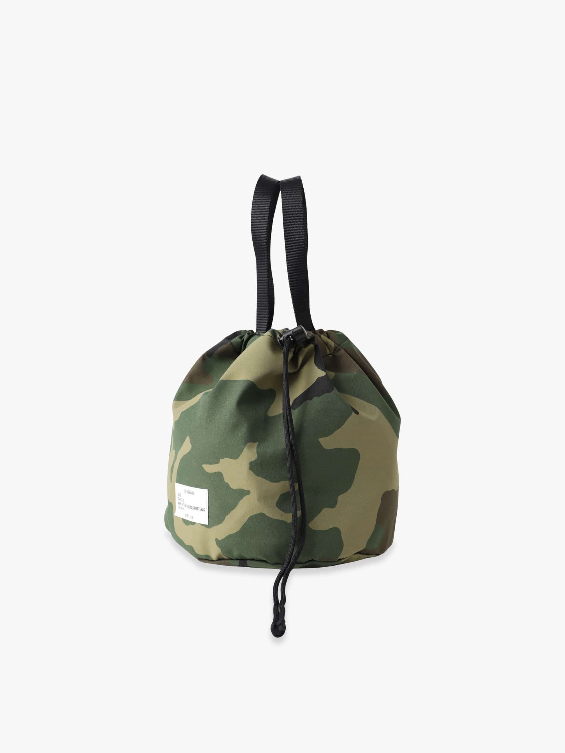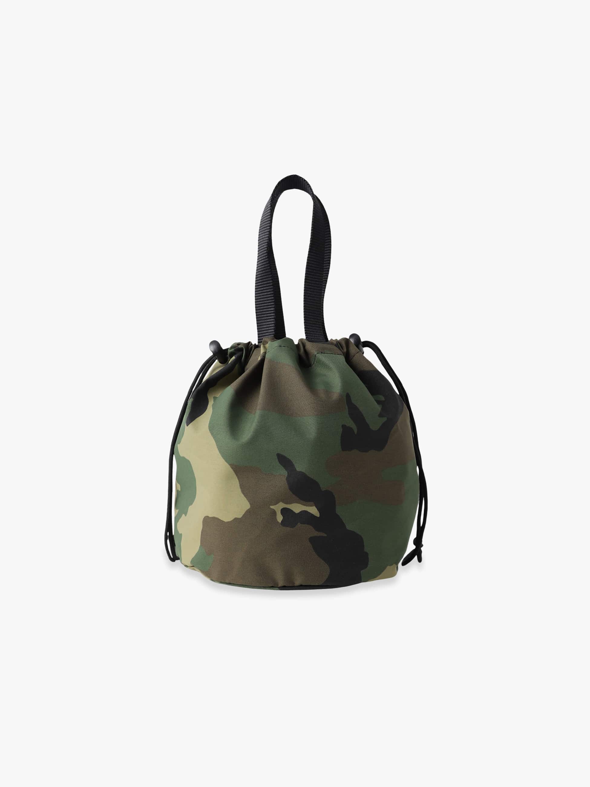 RH California Made in Los Angeles Collectionの巾着型バッグ。クラシックなウッドランド迷彩のデッドストック生地を使用し、ブラックハンドルで引き締めたデザイン。ミリタリーの無骨さをタウンユースに取り入れやすく仕上げています。