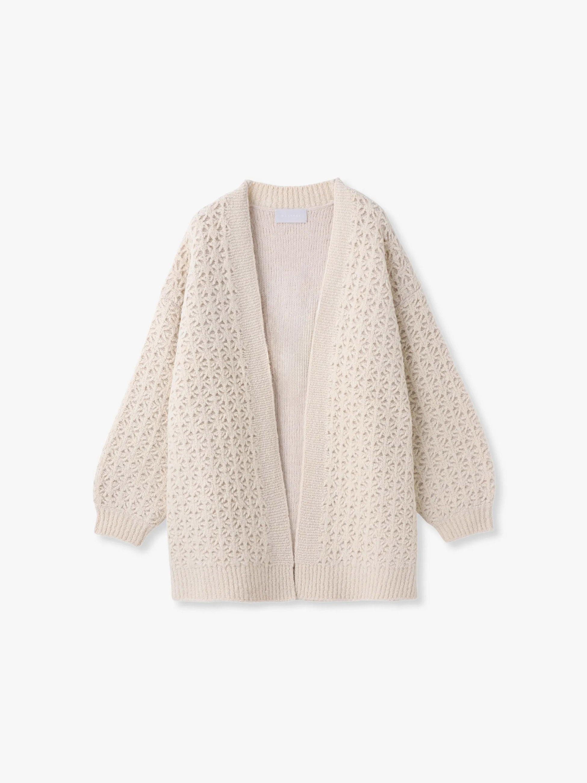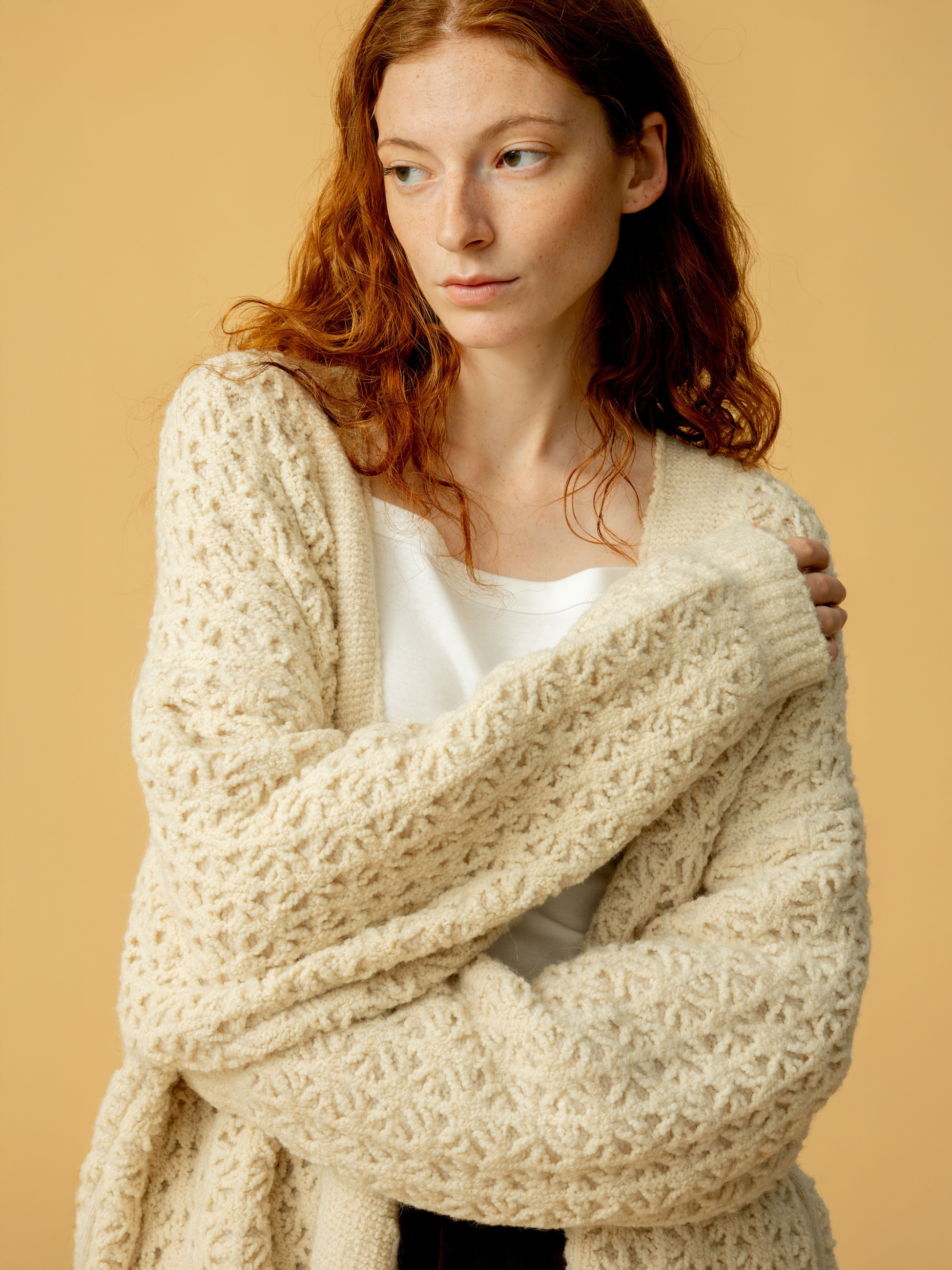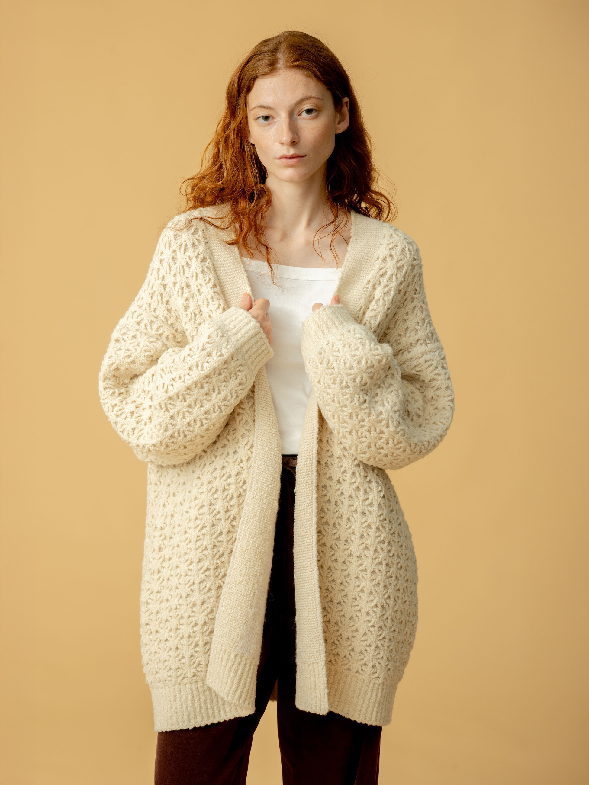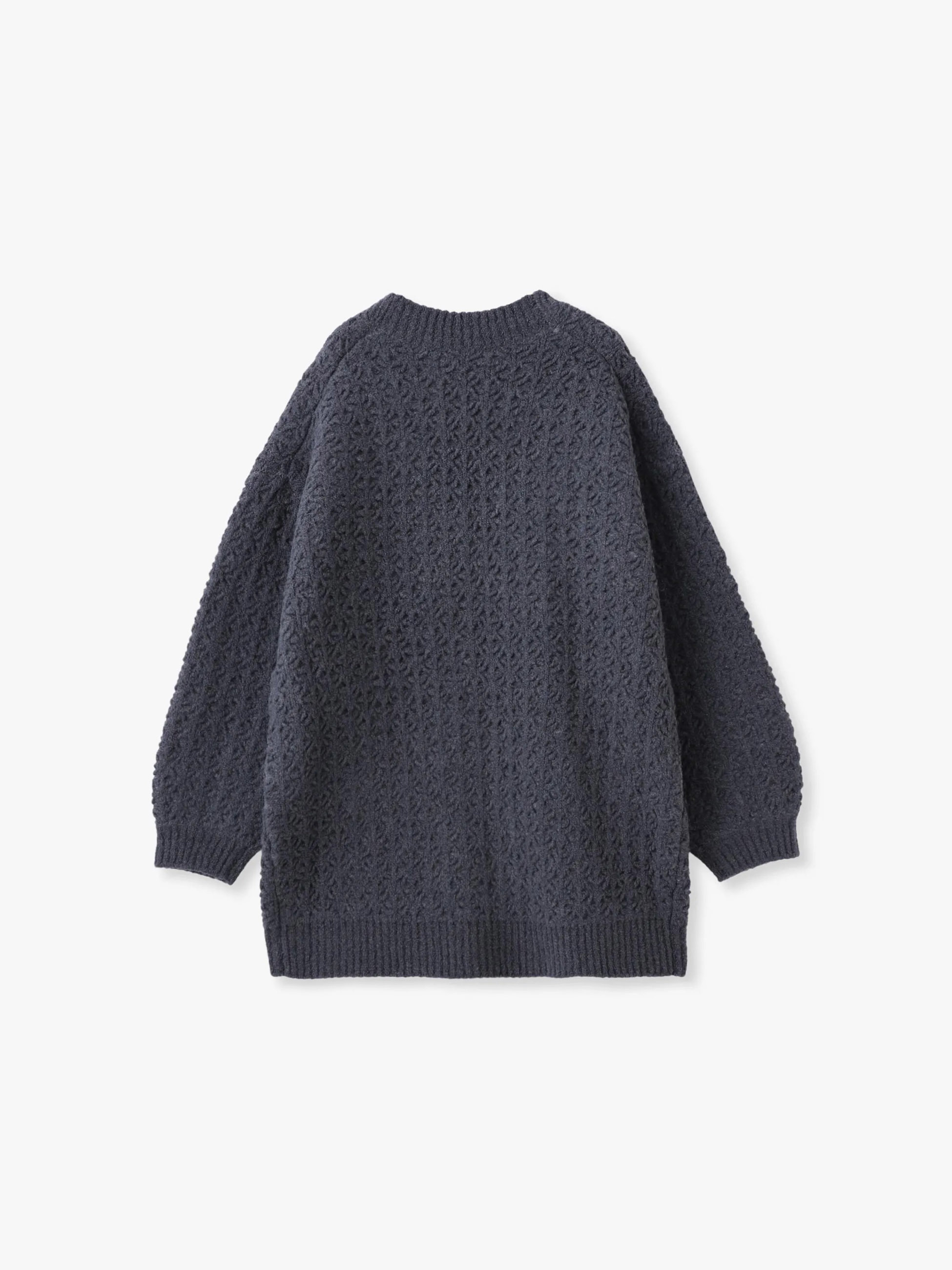 軽やかで暖かく、ふんわり羽織れるニットカーディガン。表はブークレ調の透かし柄、裏は軽く暖かなアルパカ混素材を使用し、ダブルフェイスのような表情豊かな仕上がりです。ゆったり丸みのあるフォルムで、ボタンなしですっと羽織れるのも魅力。秋口のアウターとしても活躍します。