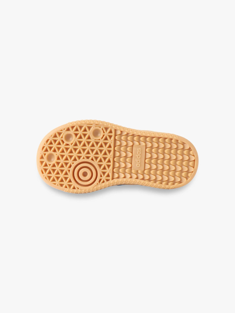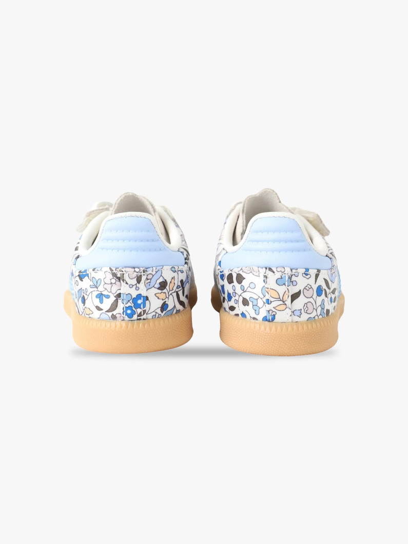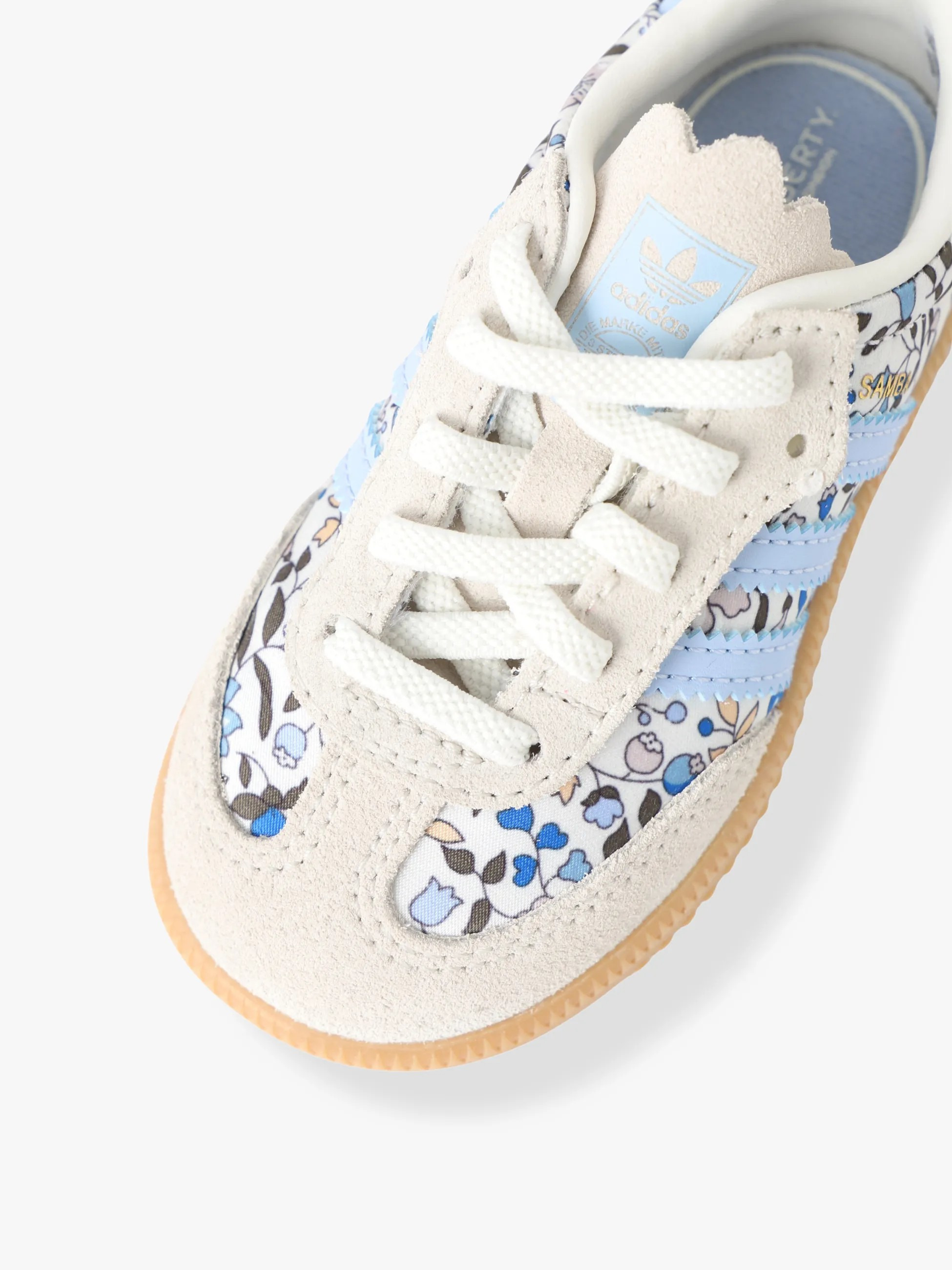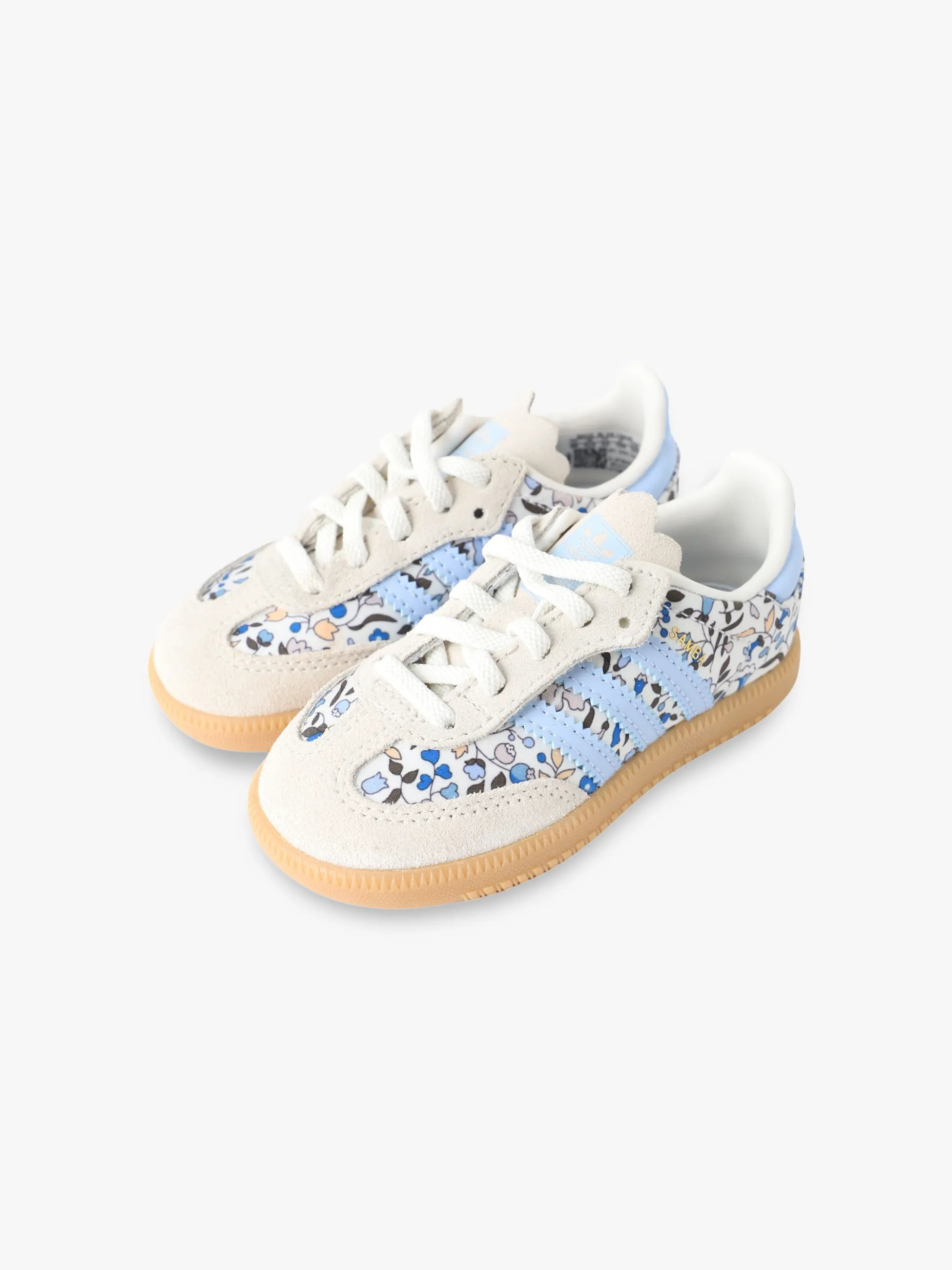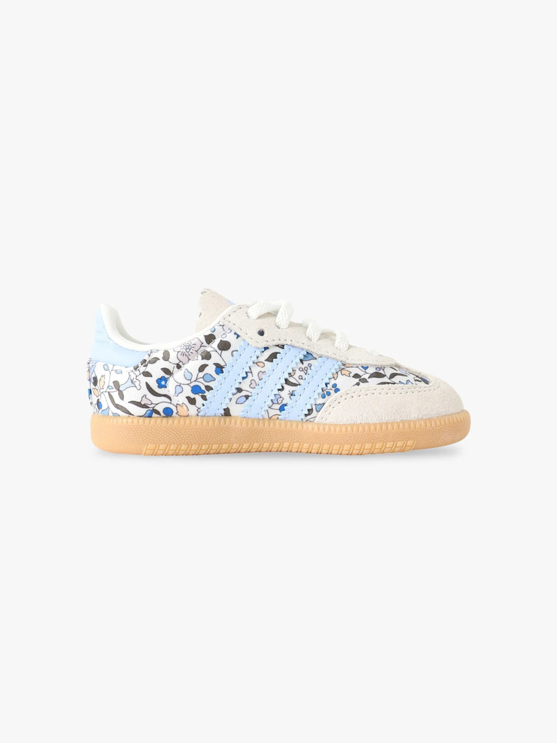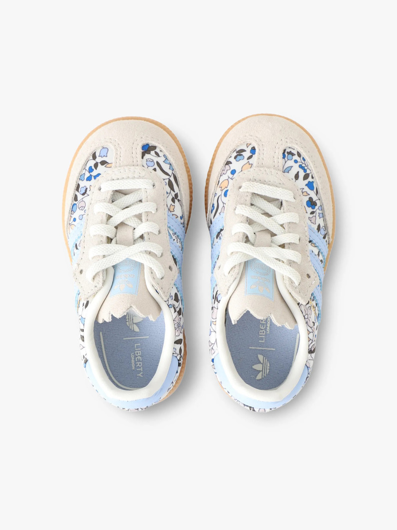 adidas Samba OGとLiberty London共同制作のシューズは、クラシックなフォルムにフローラルプリントが施され、スタイリッシュなアクセントになっています。伸縮性のあるシューレースで脱ぎ履きしやすく、ラバーアウトソールが耐久性を発揮します。テキスタイルと合成素材のアッパーには柔らかなテキスタイルのライニングが施され、お子さまの小さな足を快適に保ちます。