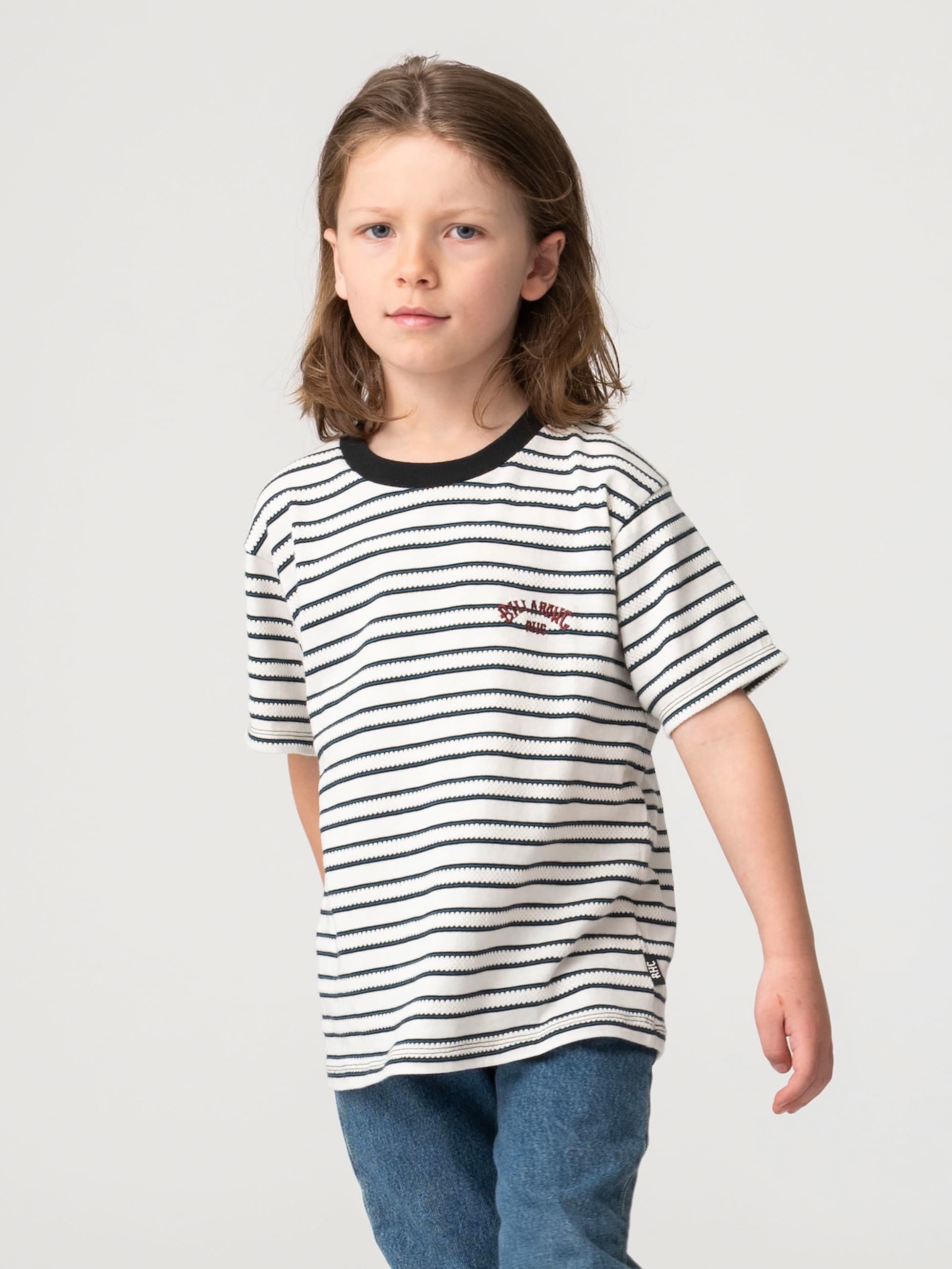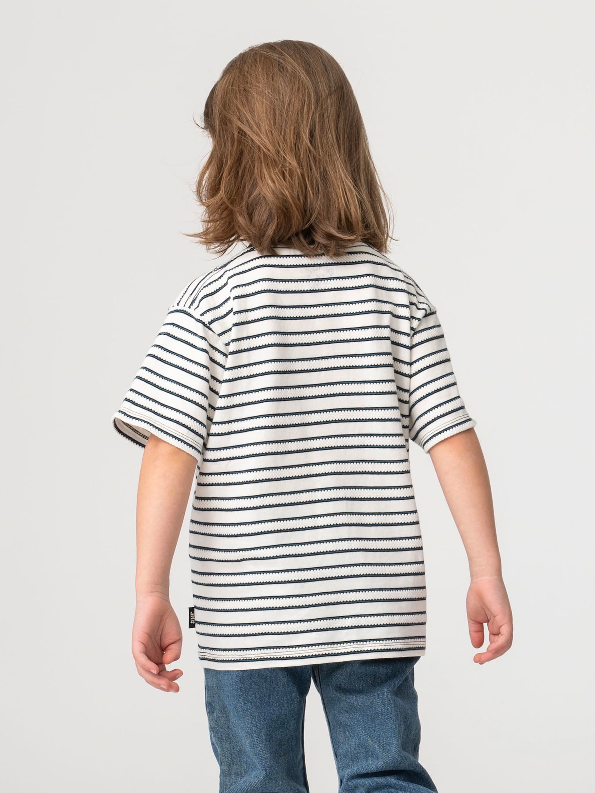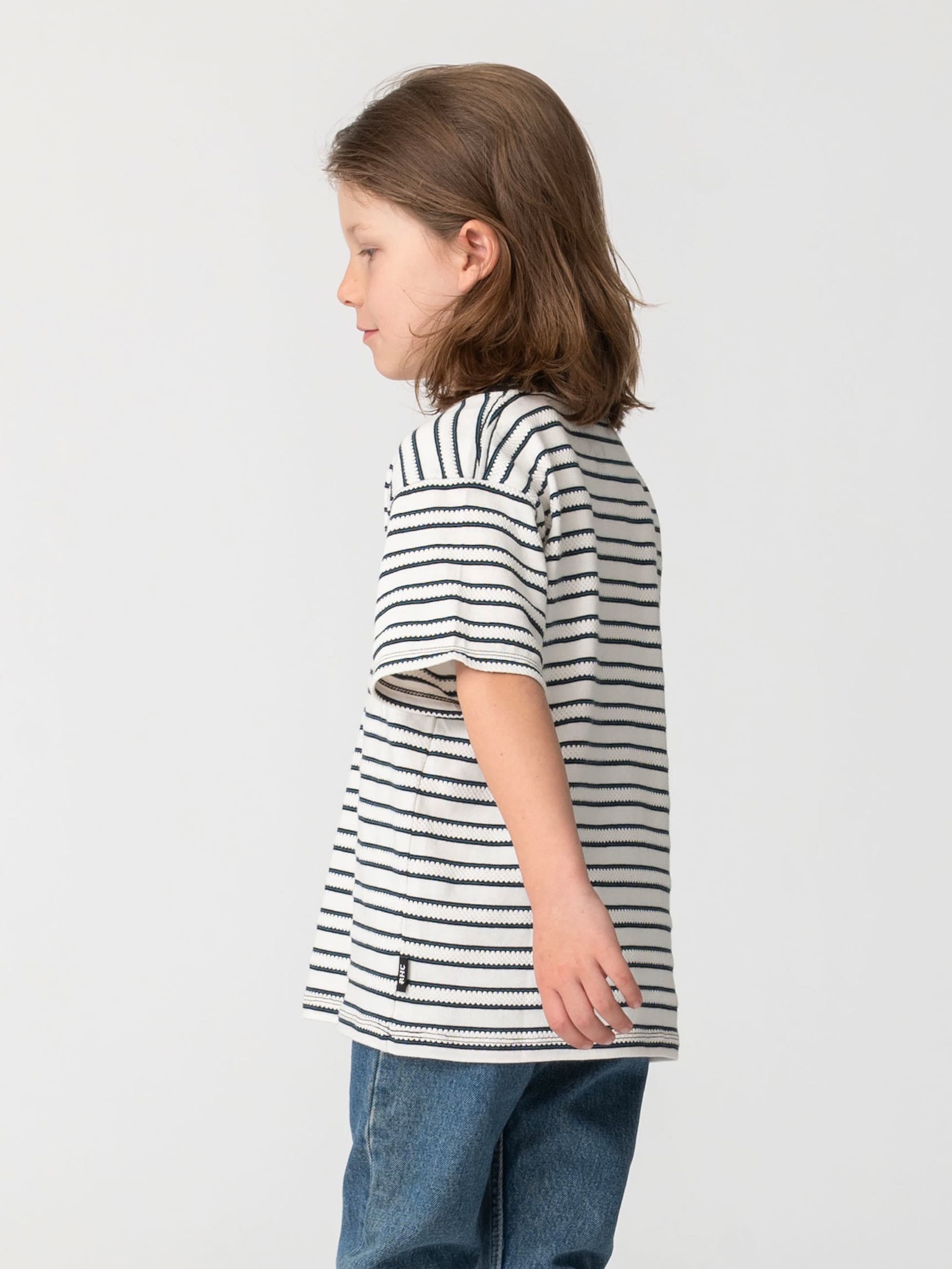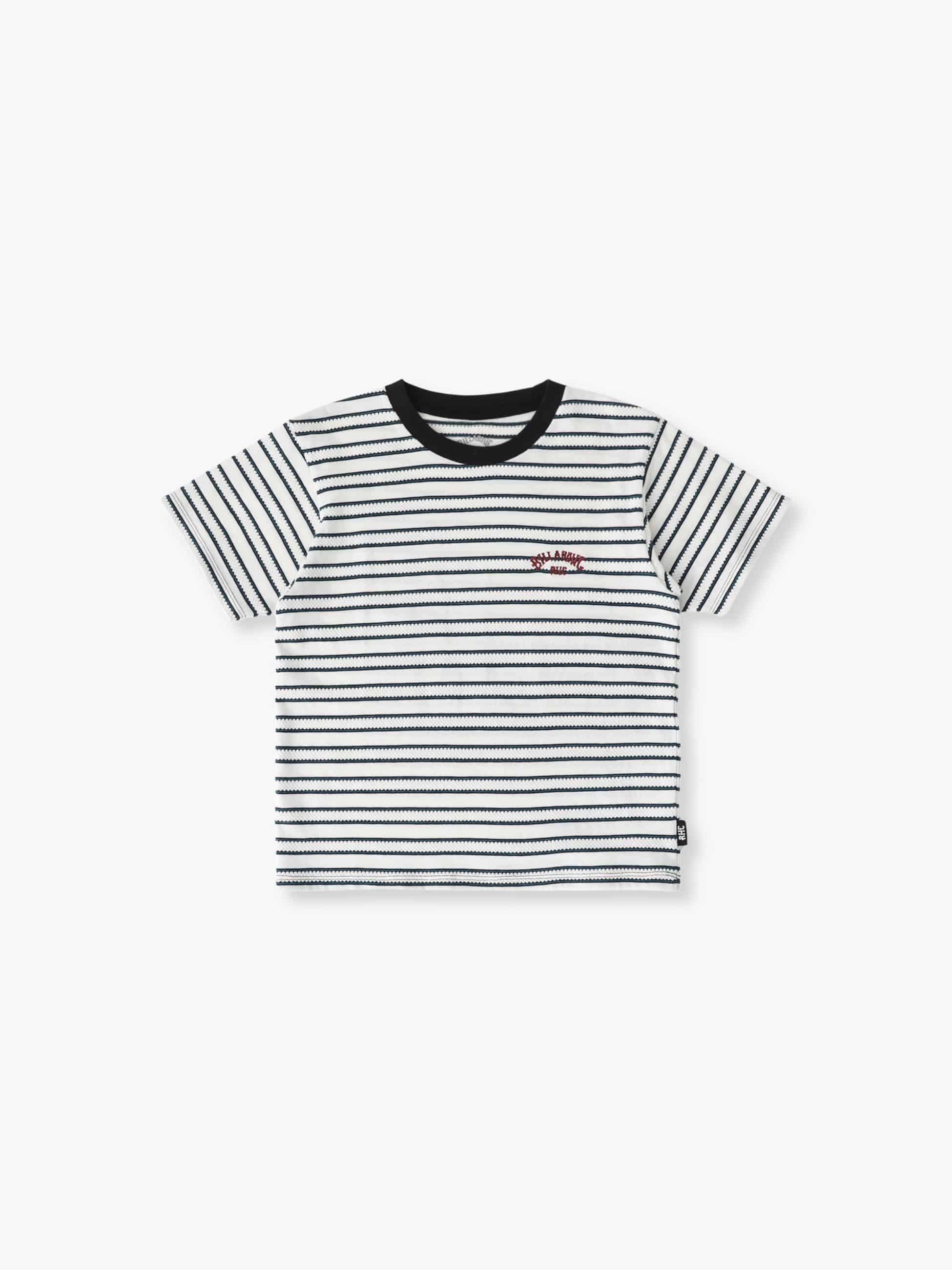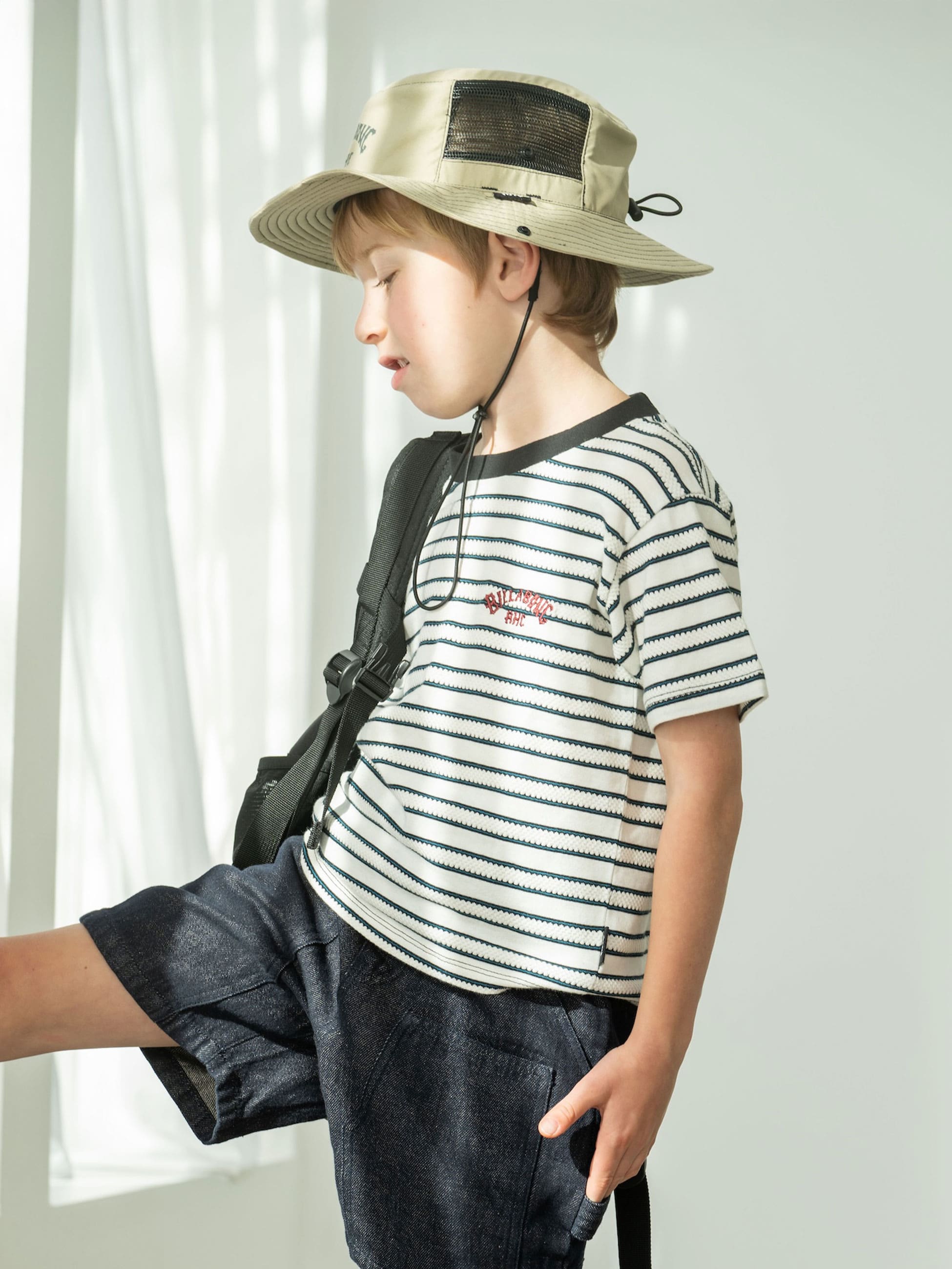 ロンハーマンキッズ別注の特別なTシャツが登場です。マルチストライプ柄のジャガード天竺生地を採用し、胸元には両ブランドの別注ロゴの刺繍を施しました。ラフに着こなせるため、デイリー使いにぴったりな1枚です。