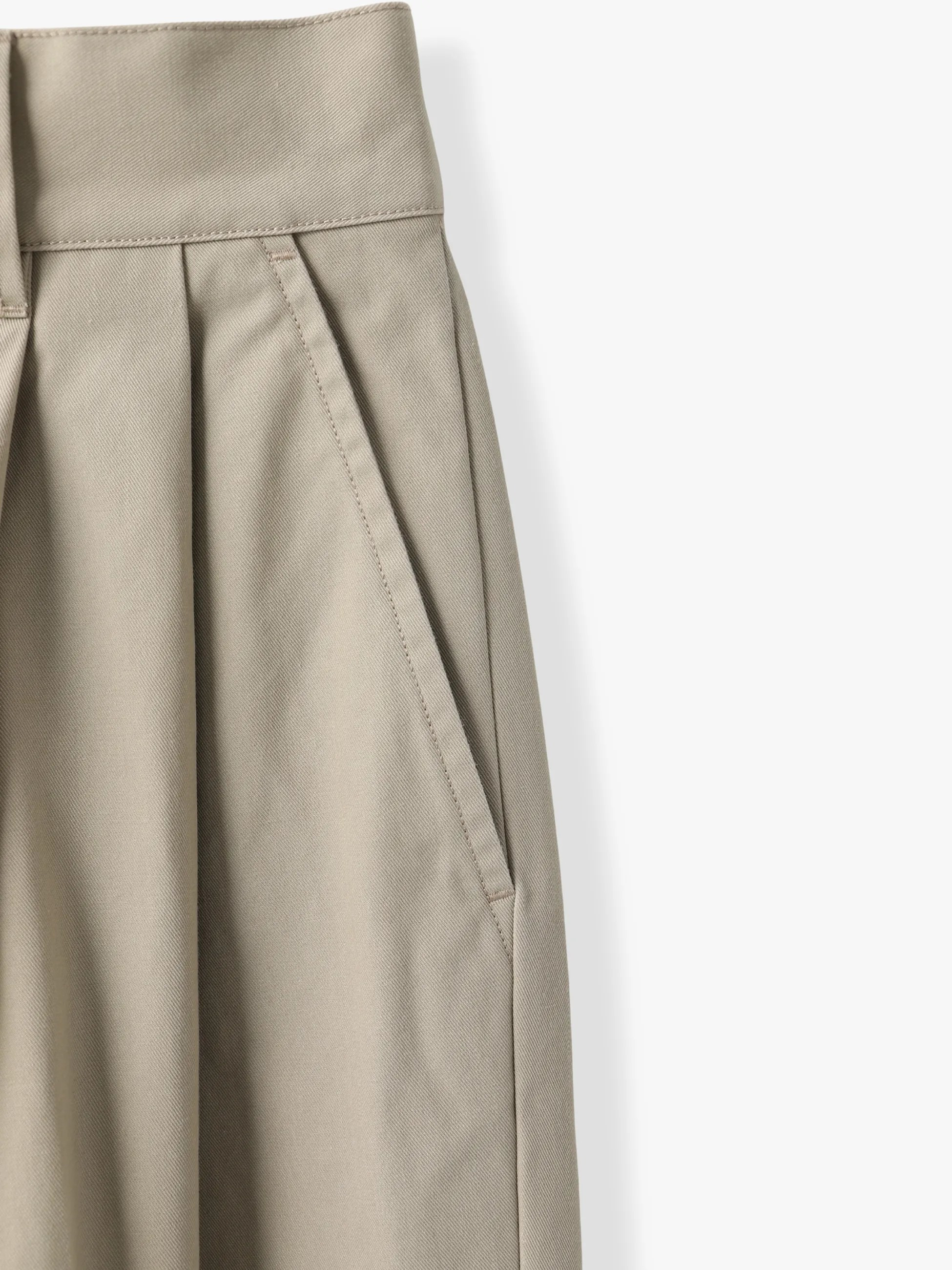 - クラシックなタックパンツは、しっかりとしたハリ感のある生地を使用し、メンズライクなシルエットながら、ハイウエストでウエストまわりはすっきりと、女性らしい印象を演出します。ざっくりとした大きめシルエットのニットトップスを合わせ、カジュアルなスタイリングをお楽しみいただけます。同素材を使用したバルカラーコートと合わせたスタイリングも素敵です。