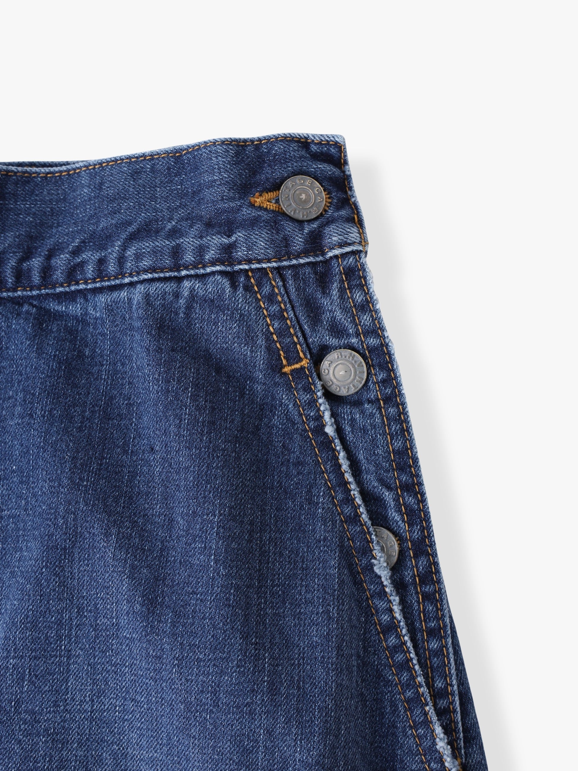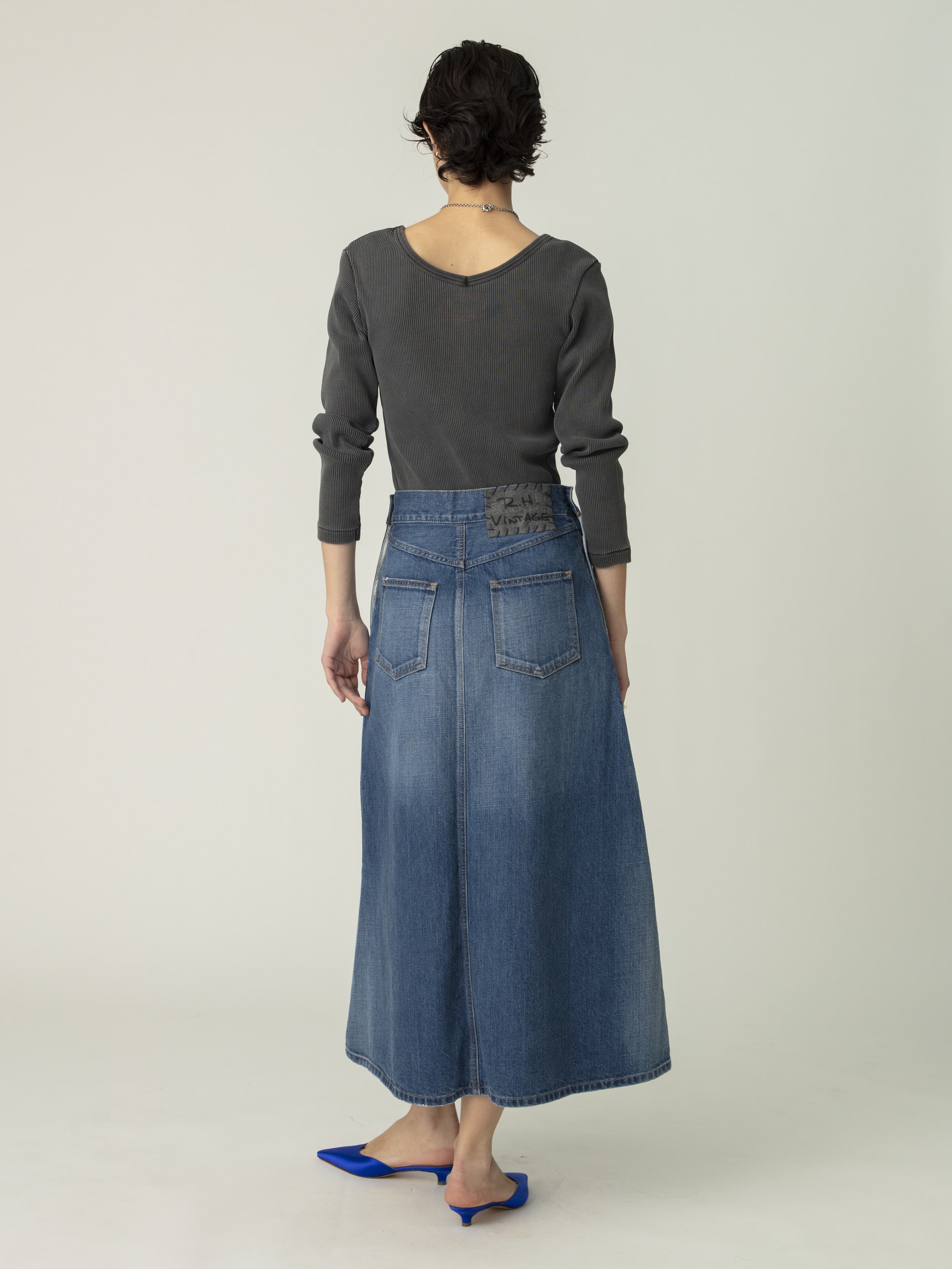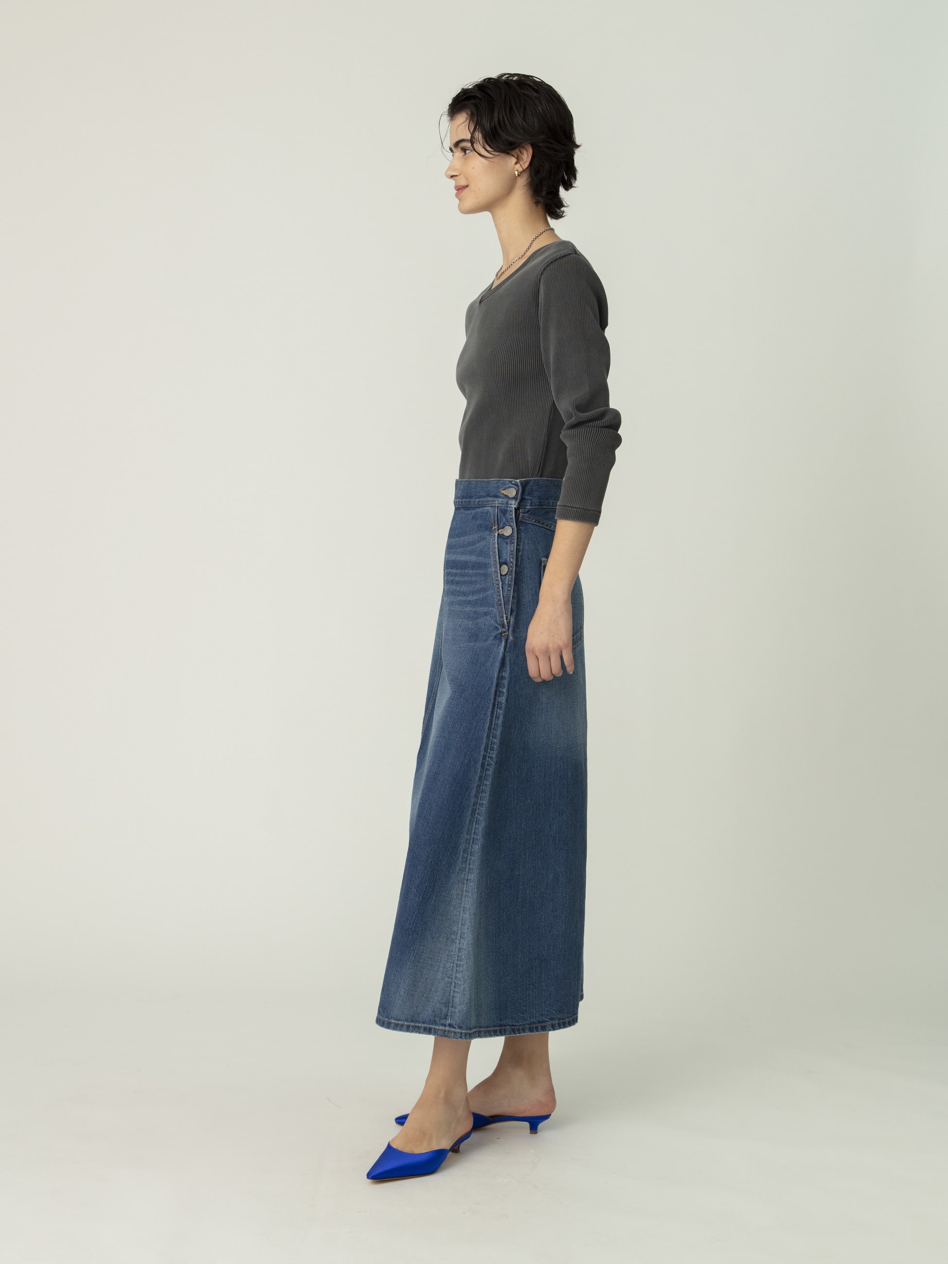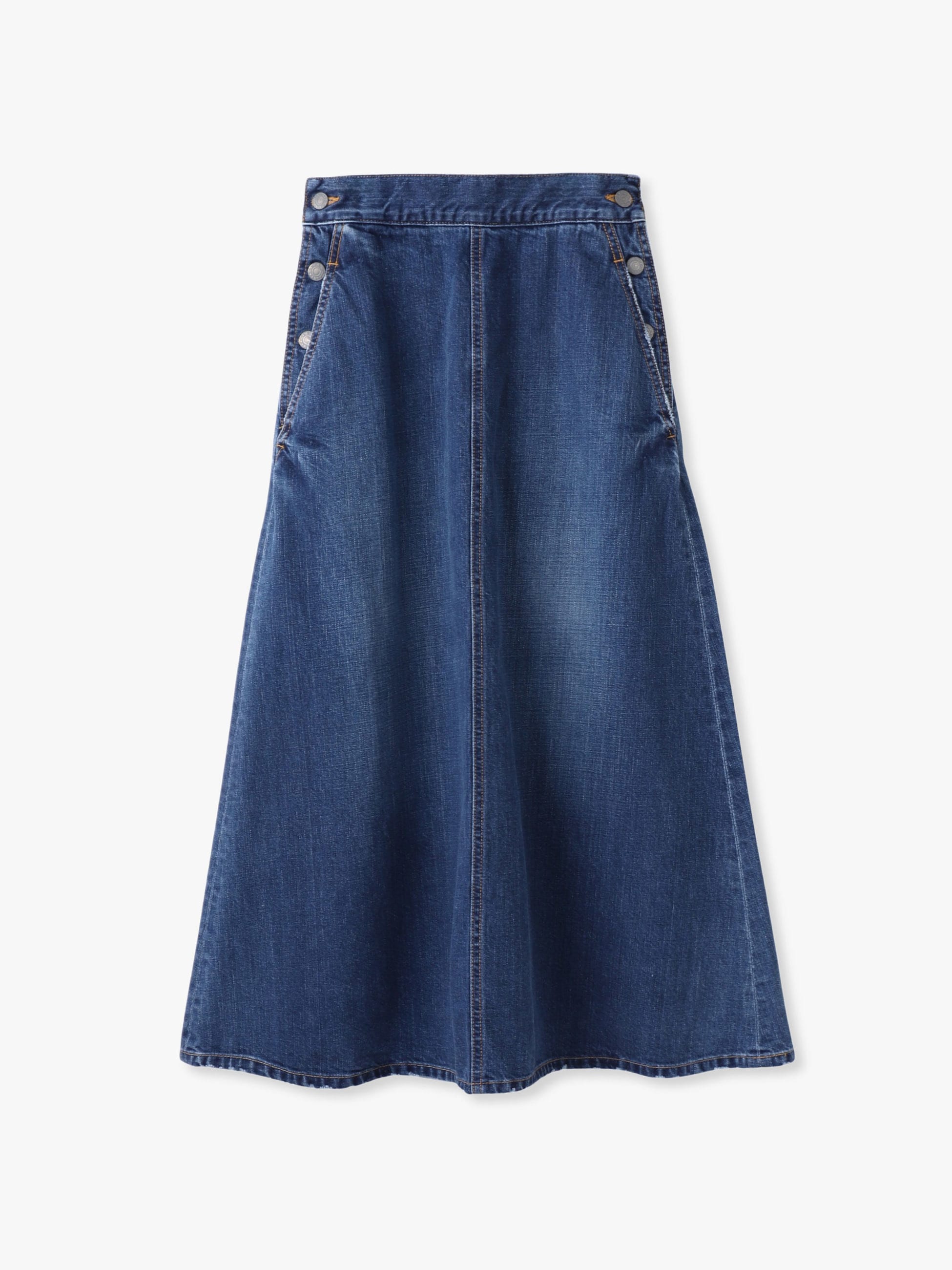 - 12オンスのオーガニックコットンデニムを使用したフレアスカートは、足元まで届くロング丈に、美しく広がるフレアラインが、上品な印象をプラスします。フロントの切り替えや、サイドのボタンで腰まわりにアクセントを効かせたディティールは、スタイルアップも叶う1着です。