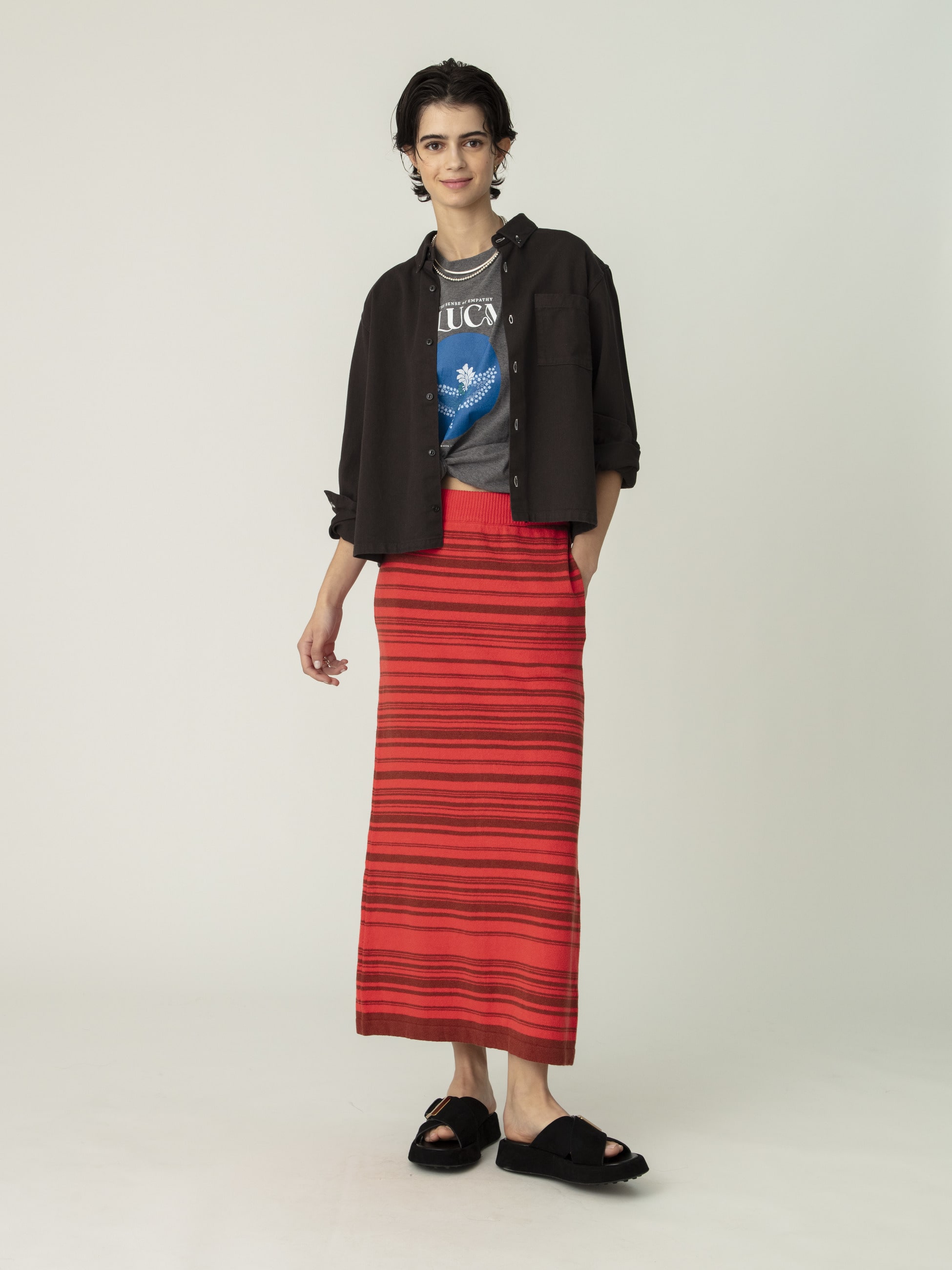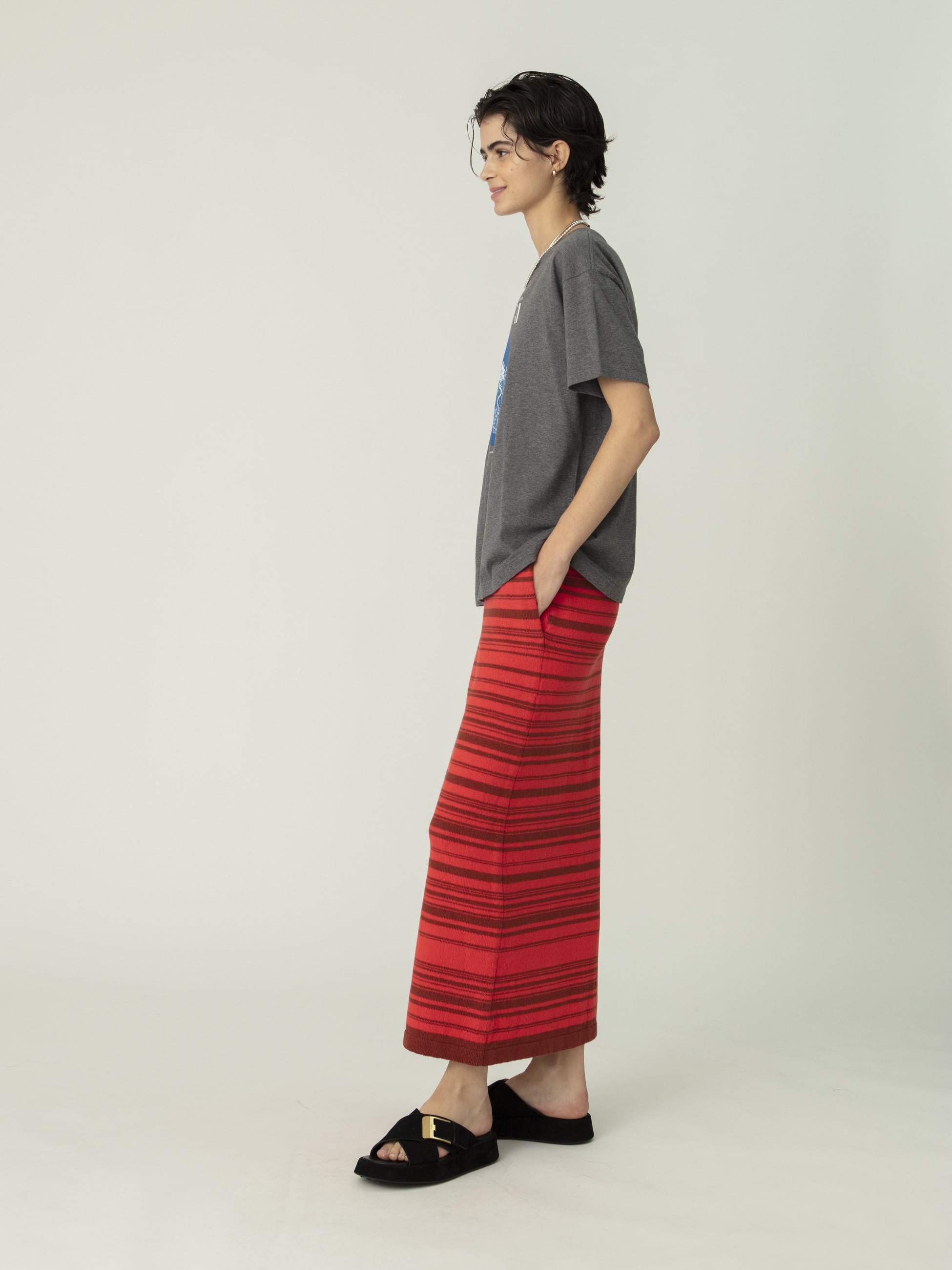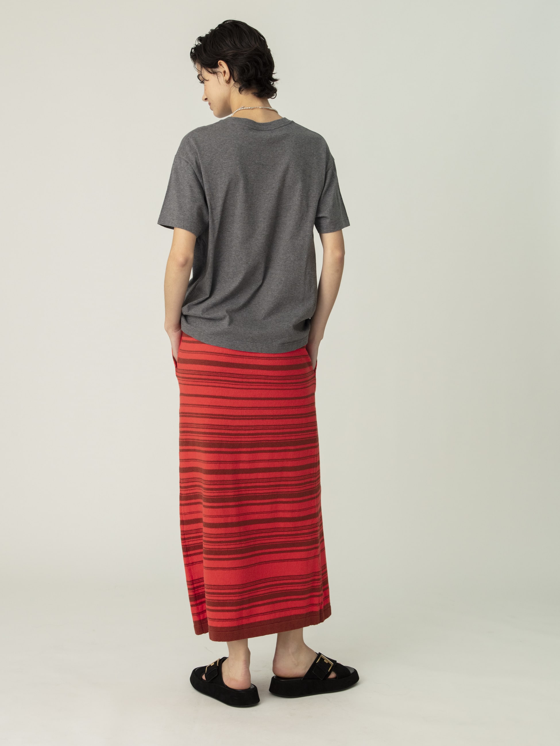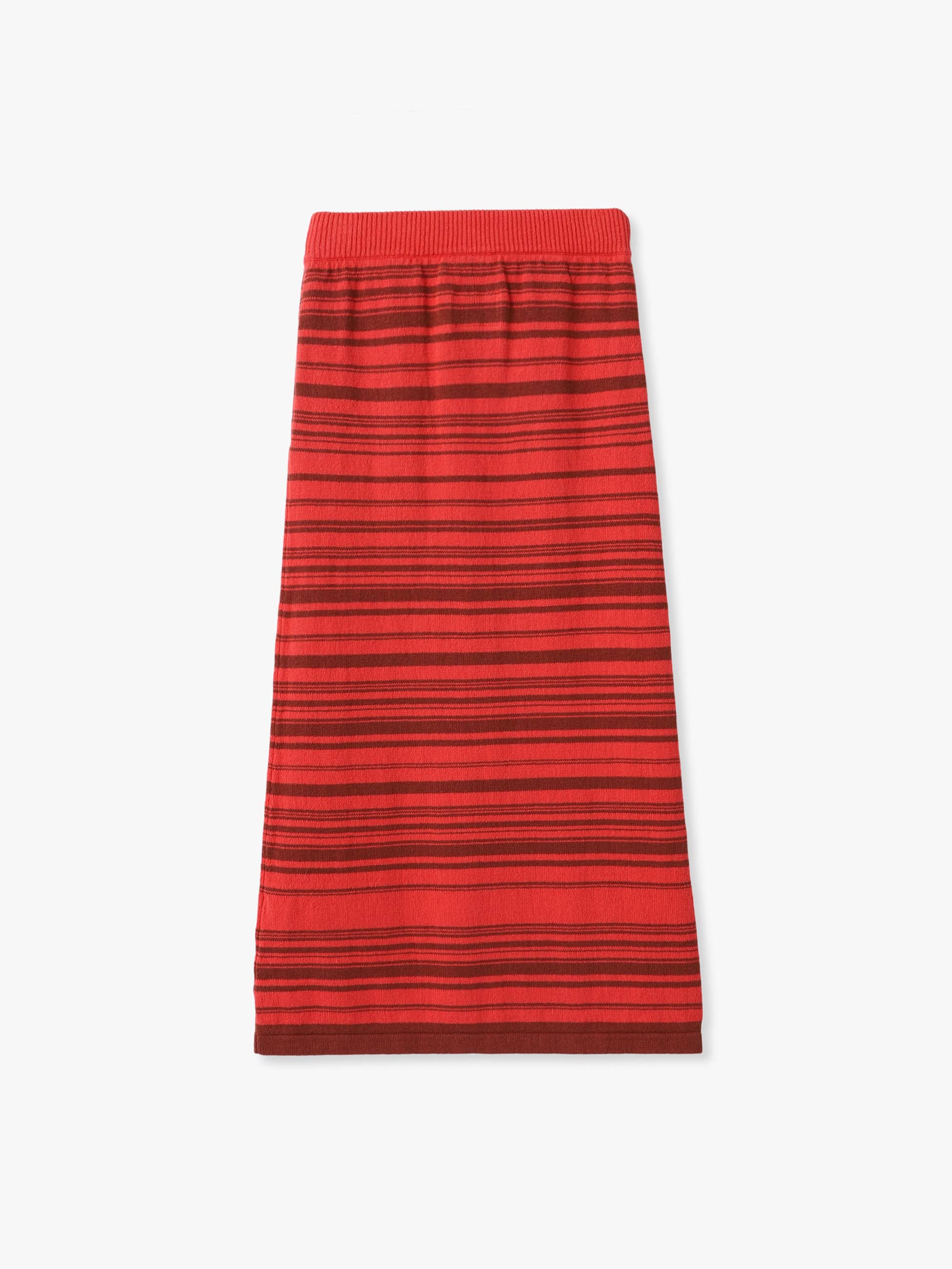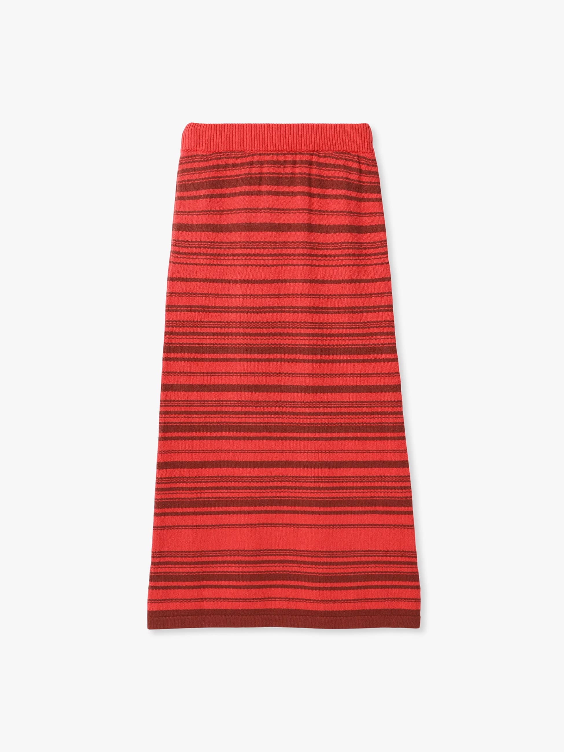 - 丈の長さにあわせたマルチボーダー柄のスカートは、ネイティブアメリカンのラグをイメージソースにデザインしています、リネンとコットンを使用したカジュアルな風合いで、柄のラインにもわずかな凹凸があり、炎の揺らぎのような雰囲気を醸します。同シリーズのジップアップカーディガンとのセットアップもおすすめです。