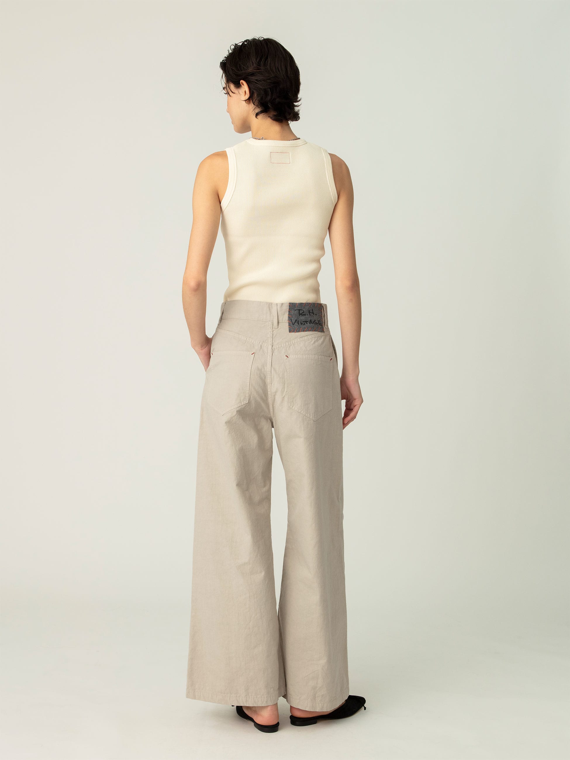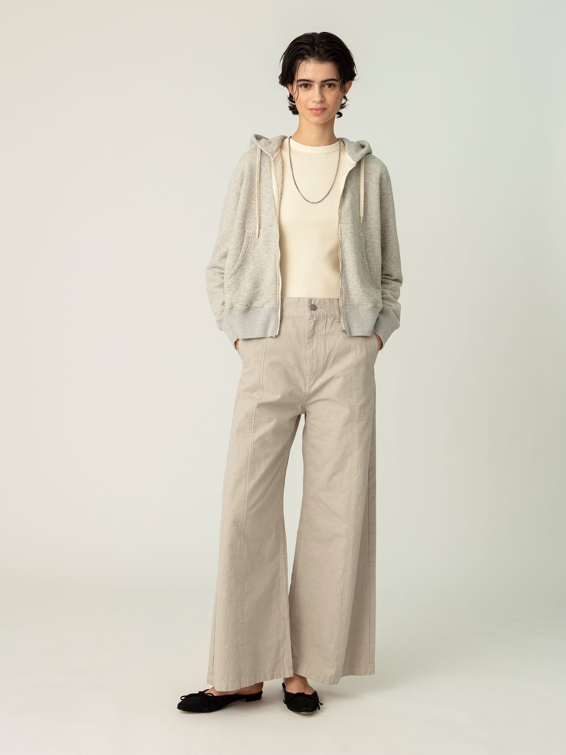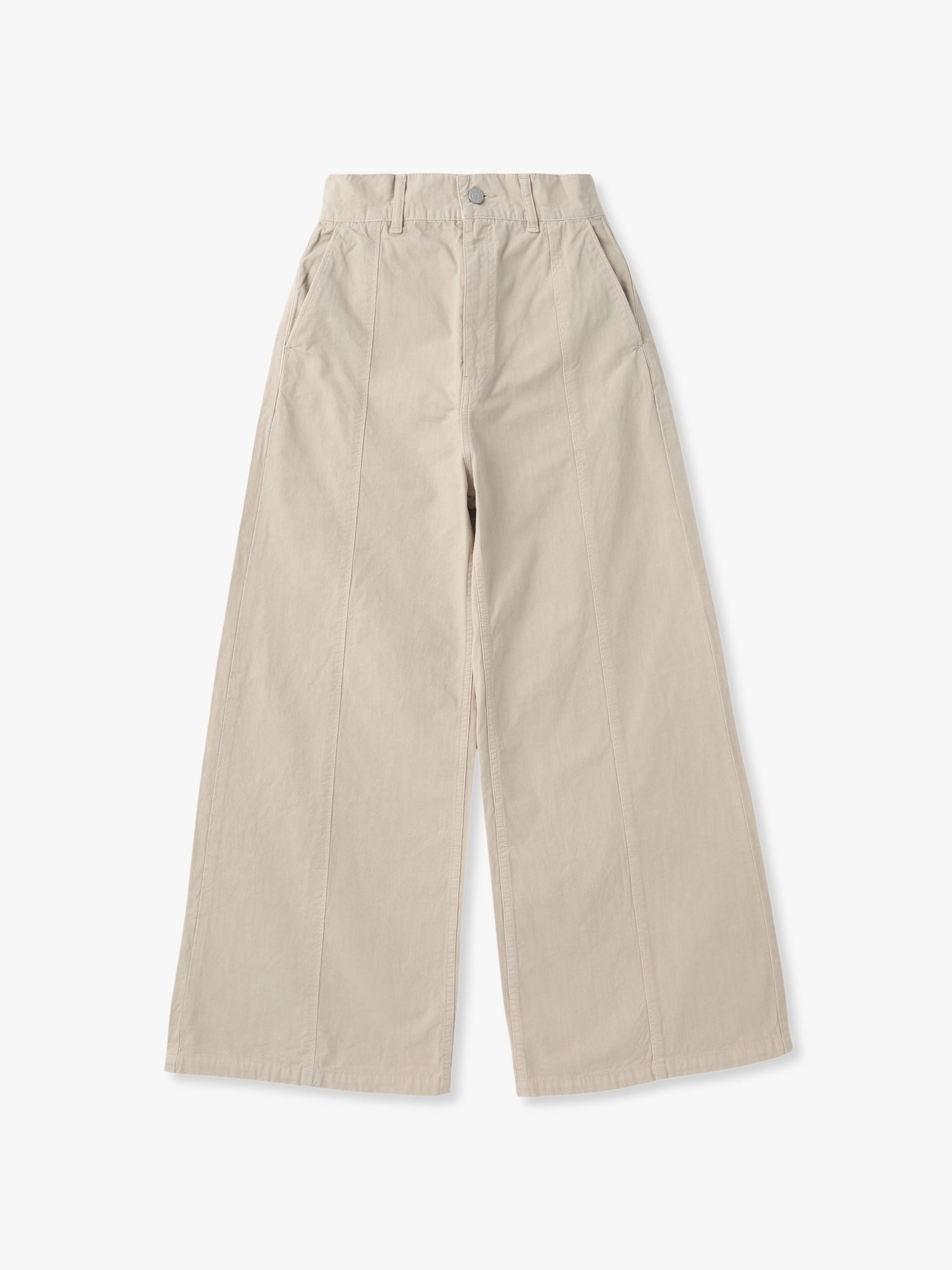 - ネップのコットンウェザークロスを使用したワイドパンツは、軽やかな印象の3色展開で、製品染めを施した独特の風合いとセンターの切り替えがアクセントに。ゆったりとしたシルエットがリラクシーで、トーンを合わせたカラーのトップスとのコーディネートもおすすめです。