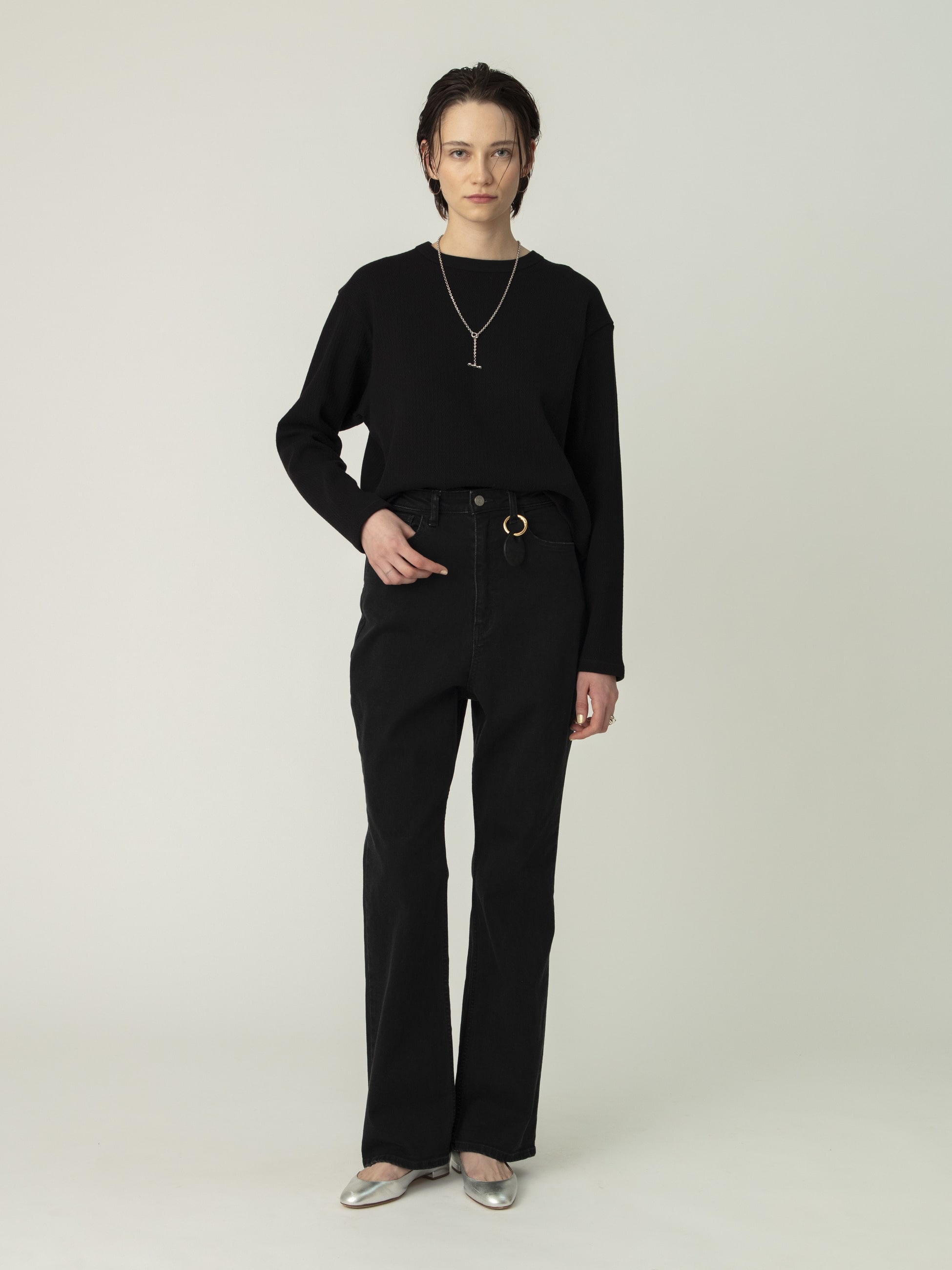 - 脚が綺麗にみえるフレアシルエットのデニムパンツは、ウエスト周りがすっきりとしたシルエットで、ストレッチの効いた快適な穿き心地です。穿くごとに身体に馴染んでいく経年変化もお楽しみいただけ、オールシーズンで活躍するアイテムです。
