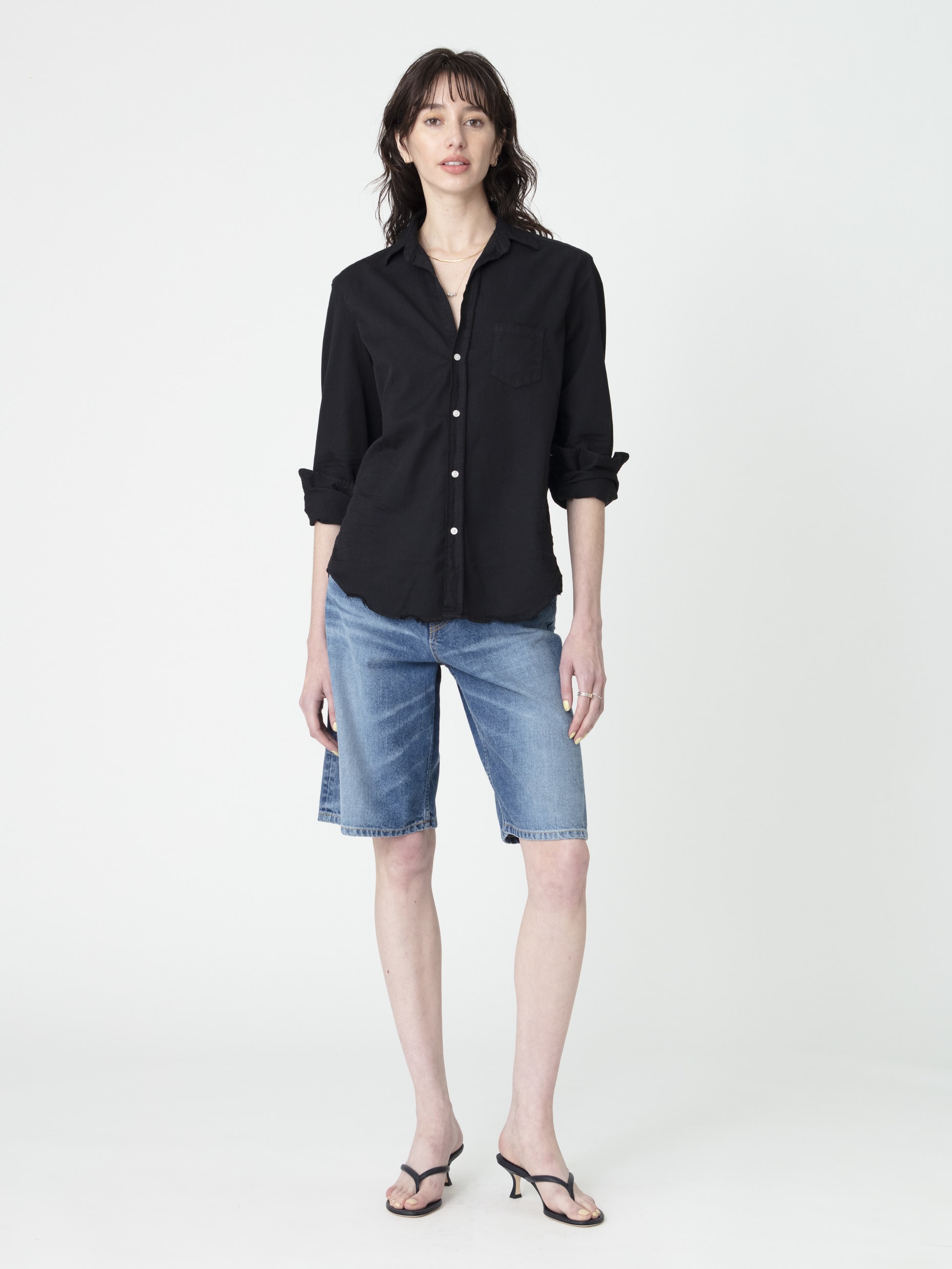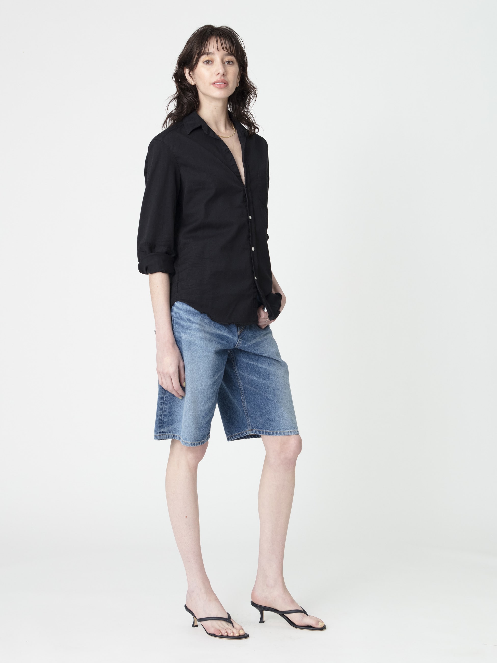 - 12オンスのオーガニックコットンデニムを使用した、ひざ下丈のハーフパンツは、ハイウエストで、ボーイッシュながら女性らしいシルエットを演出します。ヴィンテージのプリントTシャツや、洗いざらしのシャツを羽織った、メンズライクなスタイリングも素敵です。穿くごとに馴染んでいく経年変化もお楽しみいただけます。