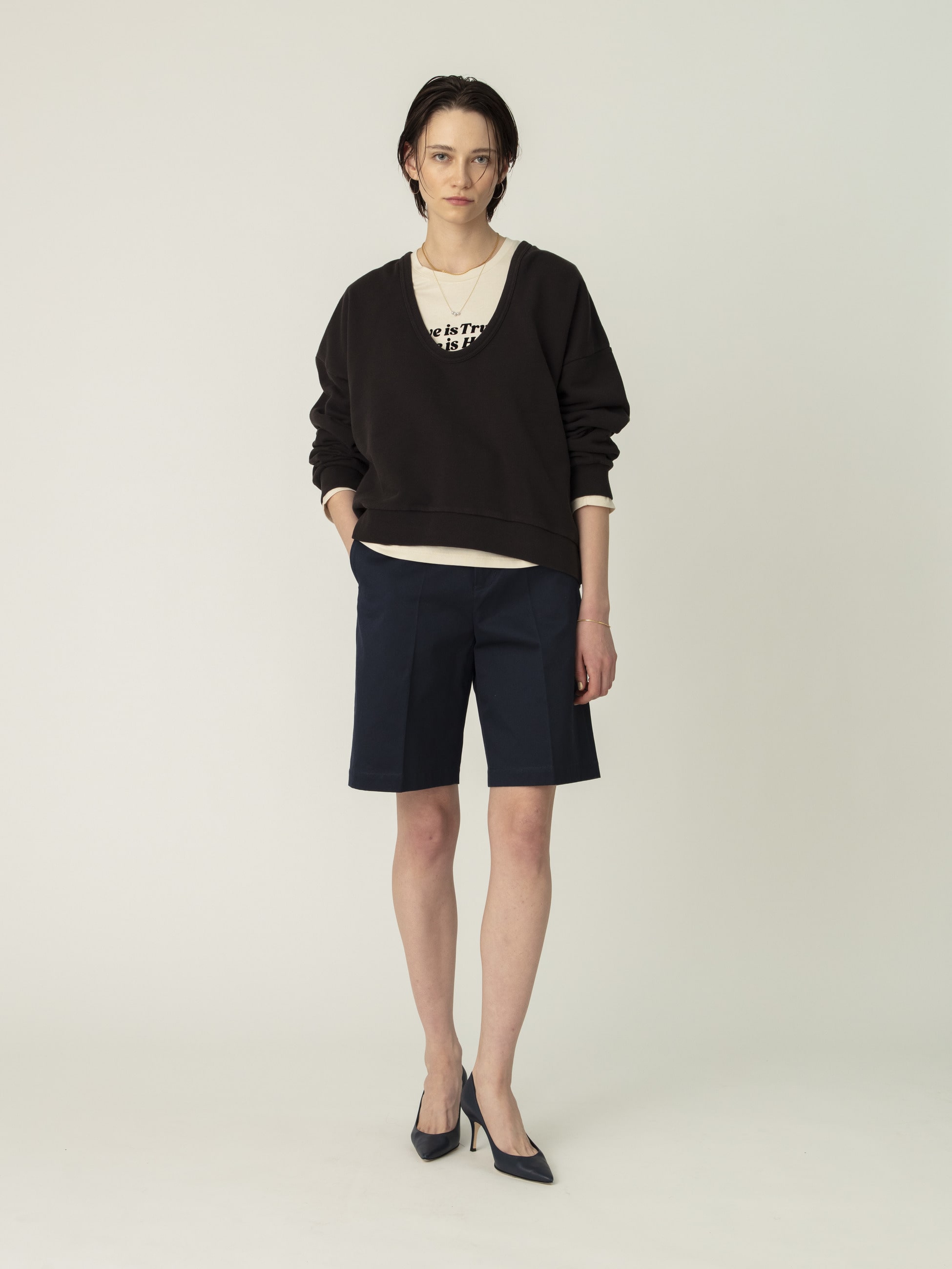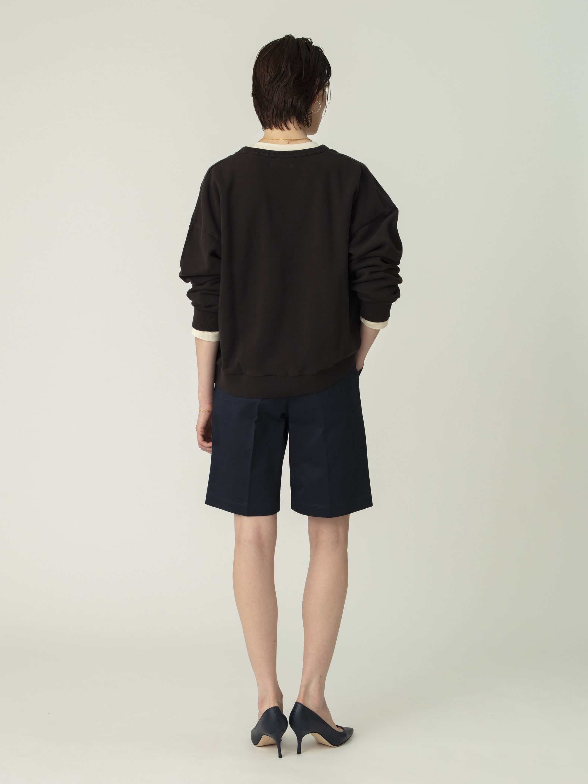 マニッシュなチノ生地のショーツは、ワンウォッシュ加工を施し、プレスをし直すことでこなれ感のある雰囲気に仕上げています。膝丈でカジュアルになりすぎず、ラフさを軽減した大人っぽいスタイリングを演出します。シーズンレスで着用いただけ、肌寒いシーズンはカラータイツやソックスとのレイヤードスタイルもおすすめです。
