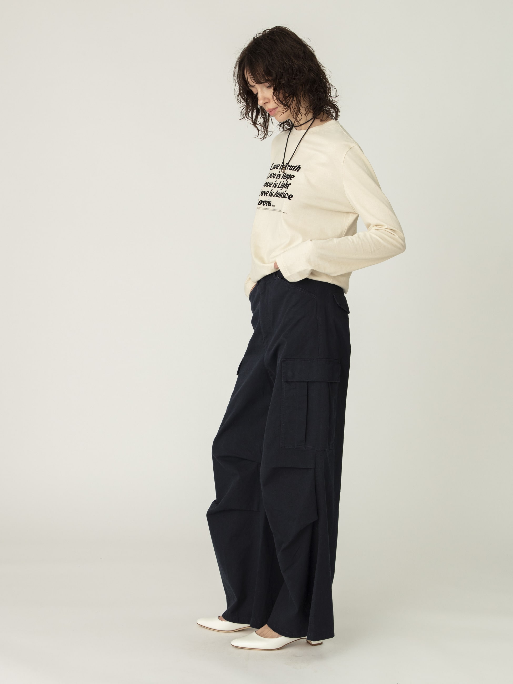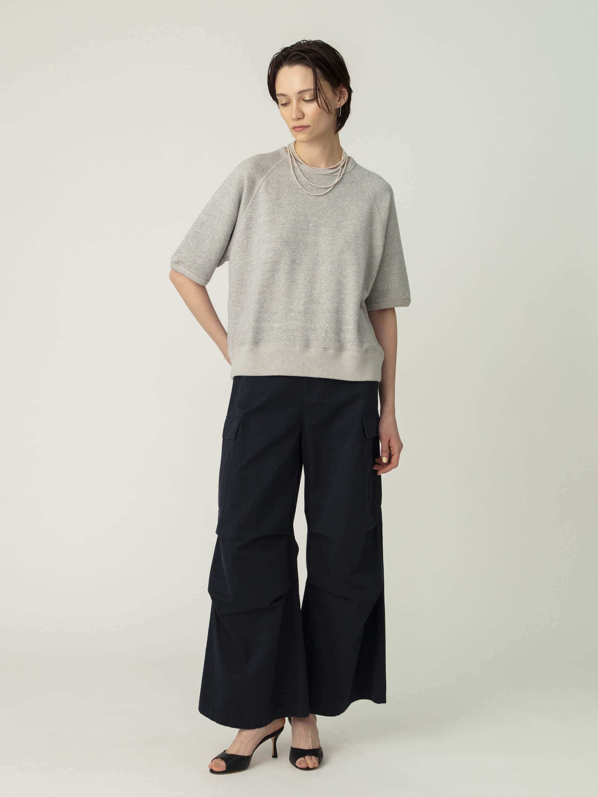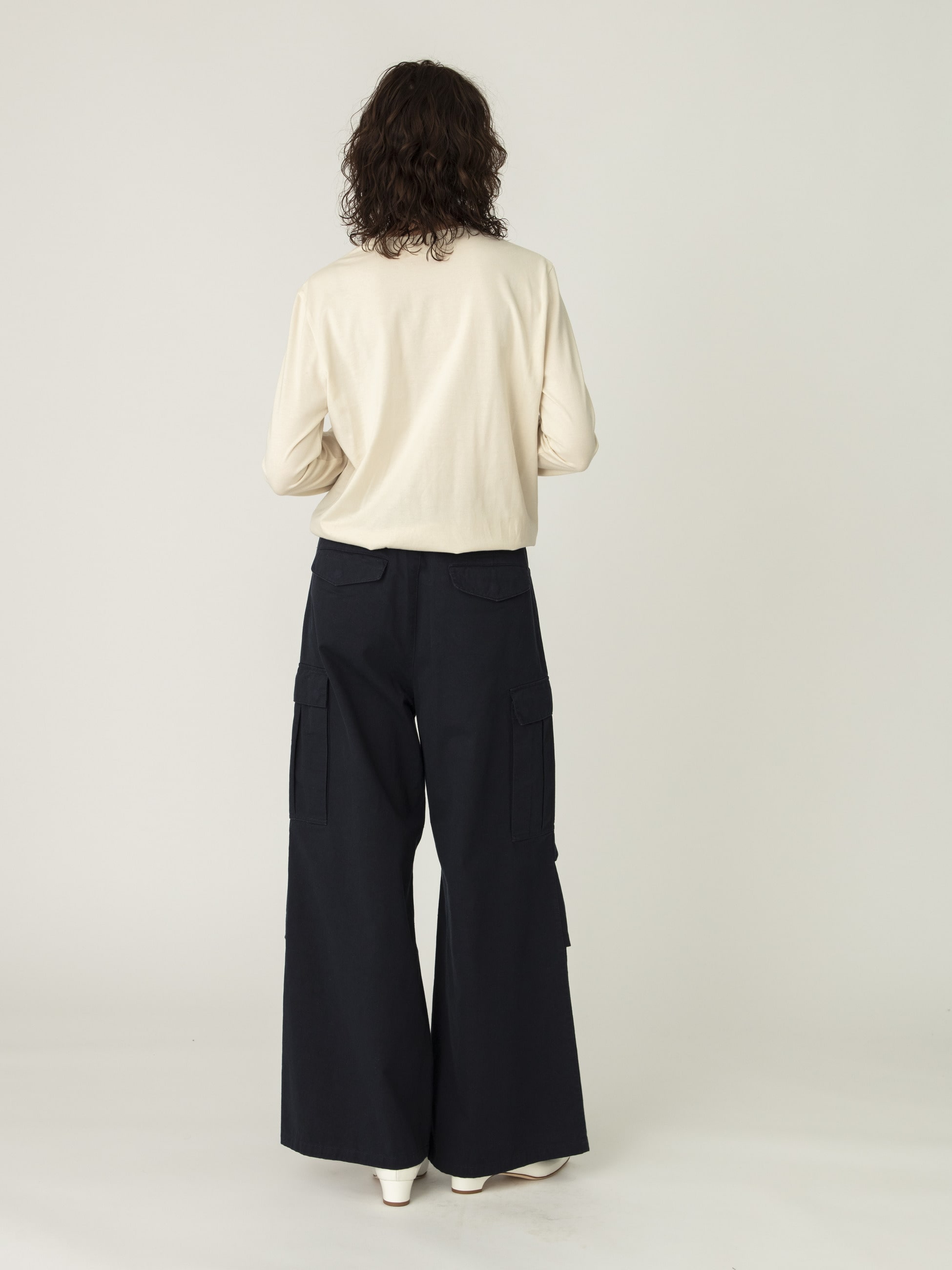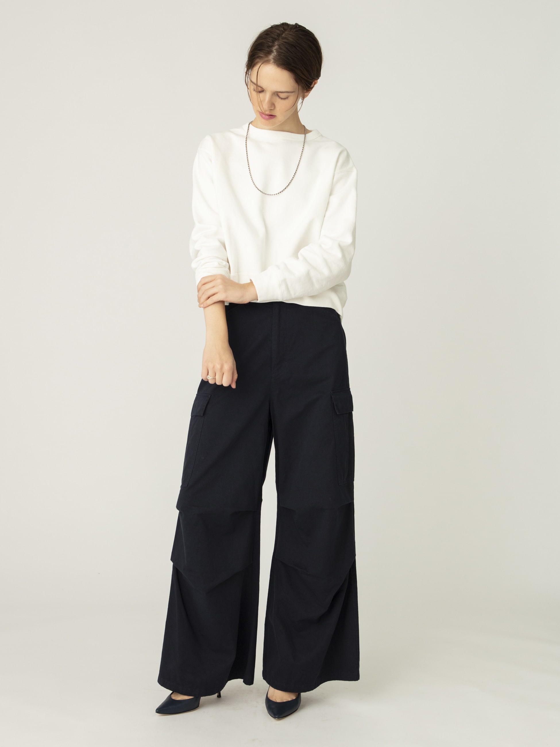 しっかりとした厚みのあるコットン素材を使用したワイドなミリタリーパンツは、合わせるトップスを選ばず、ロングシーズンで活躍します。たっぷりとボリュームのあるシルエットに、あえて華奢なジュエリーを合わせたスタイリングも素敵です。同素材を使用したキモノコートもございます。