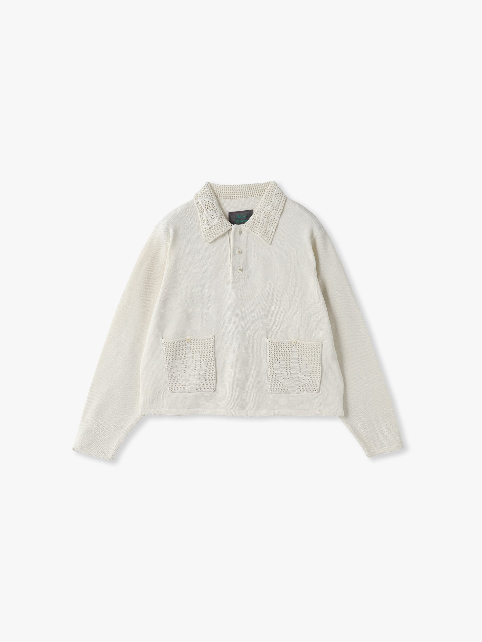 - 優しい肌触りのコットン糸を使用したポロトップは、衿とポケットに手編みディテールをあしらっています。右衿にはピースマーク、左衿にはさりげなく"HOPE"のメッセージ、ポケットにはサボテンの一種であるカーネギア・ギガンテアの模様を配し、ハンドメイドの温かみと遊び心を楽しめる逸品です。同シリーズのイージーパンツとのセットアップもおすすめです。