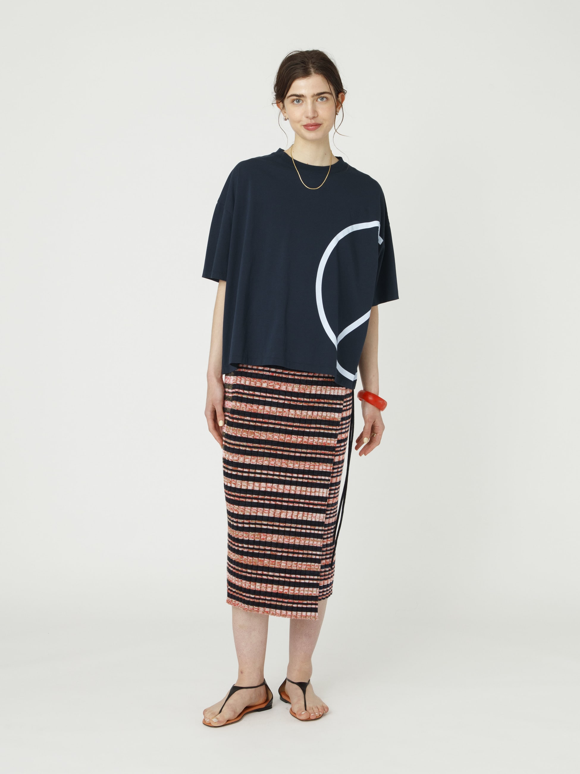 オーガニックコットンを使用したプリントTシャツは、目の詰まった上品な風合いの生地で仕立て、着るごとに増していく風合いの変化もお楽しみいただけます。左身頃にはピースマークのプリントを大胆にあしらい、「世界がもっと優しくあたたかくありますように」と願いを込めてデザインしています。