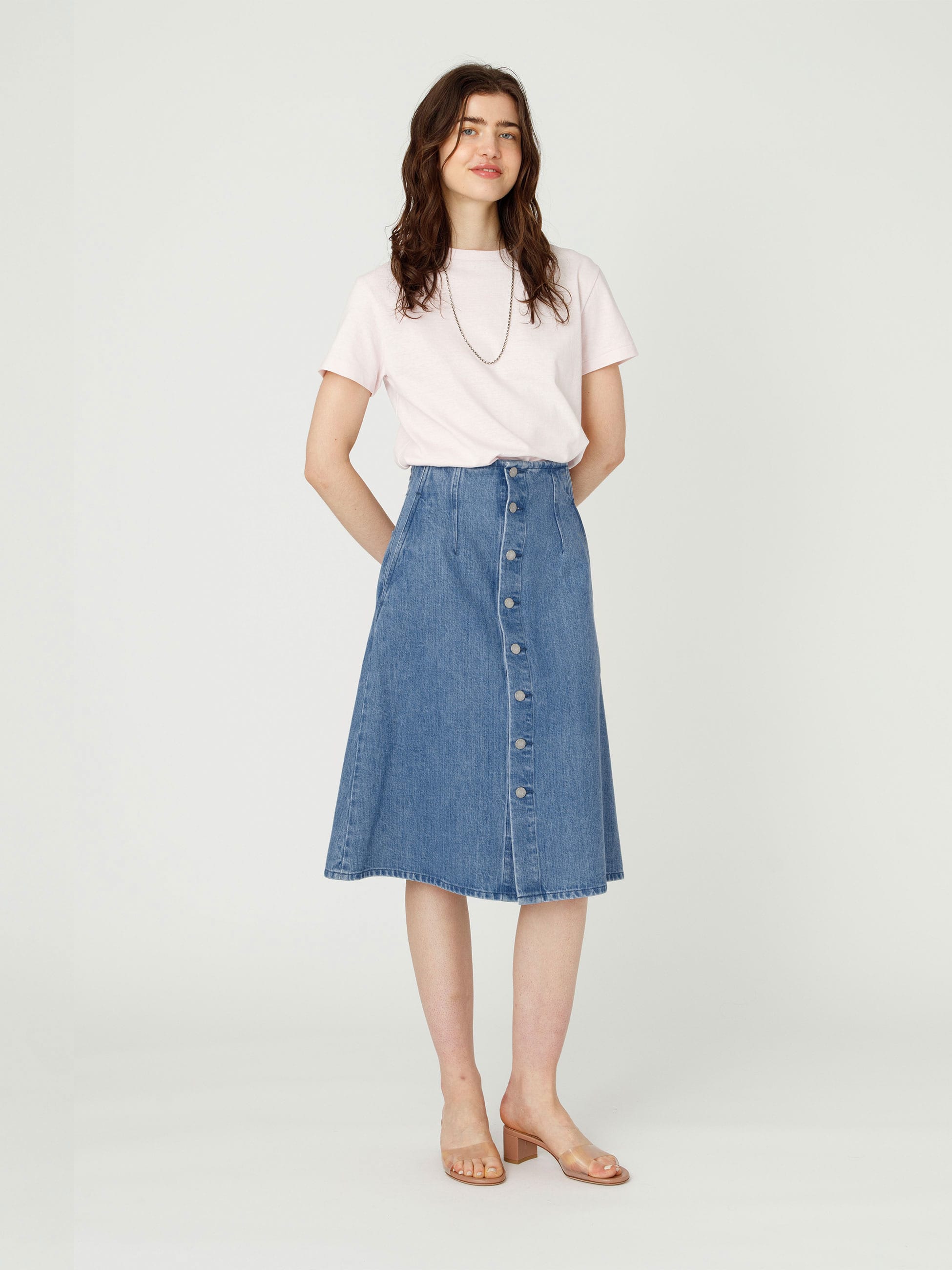 オーガニックコットンの落ち綿を使用したドライな風合いのTシャツは、メンズライクなボックスシルエットで、短めに仕立てた袖丈が、腕のシルエットを女性らしく演出します。あえて洗いざらしにしている生地は、着るごとに増していく風合いの変化も楽しんでいただきたい一枚です。