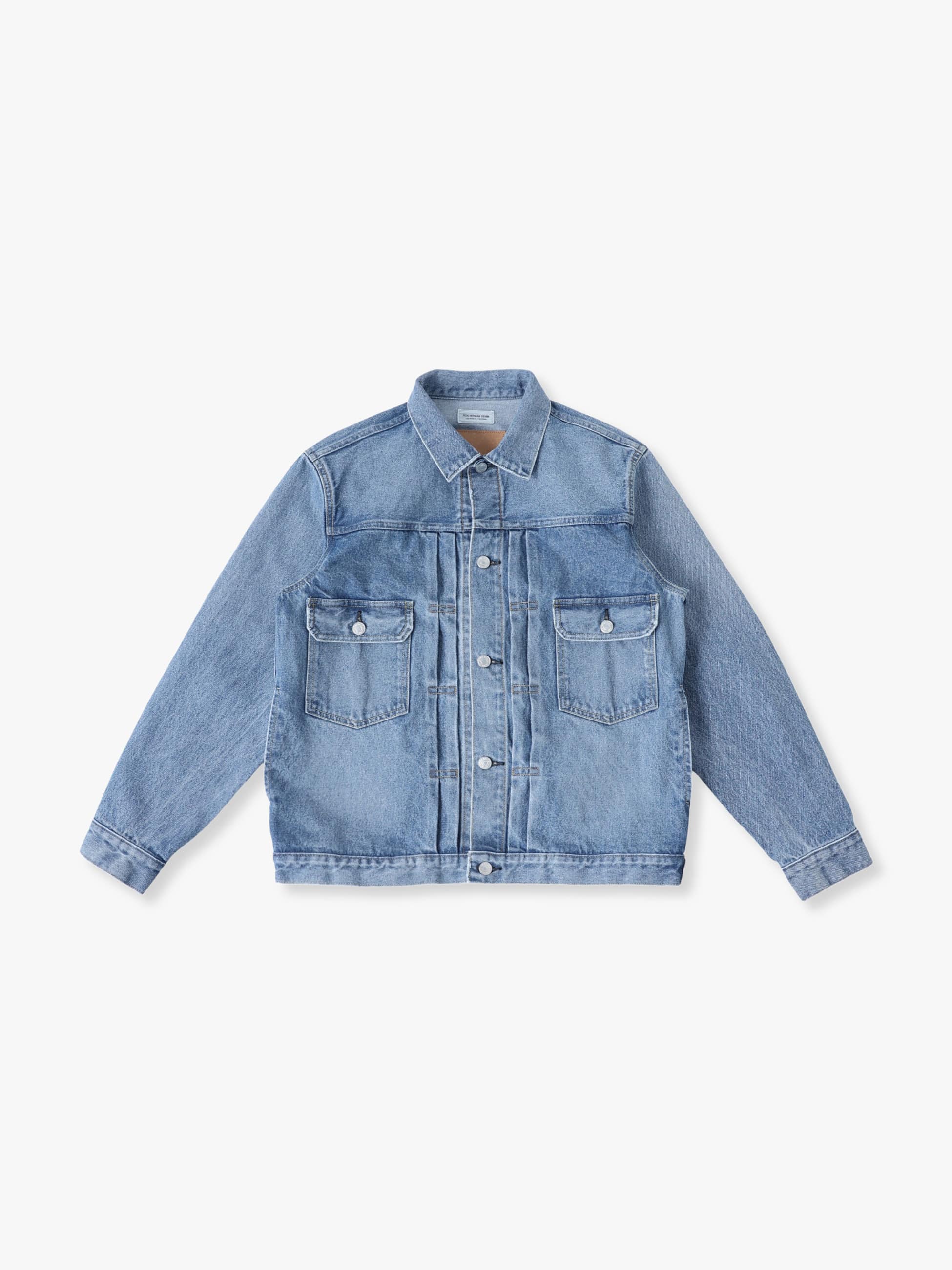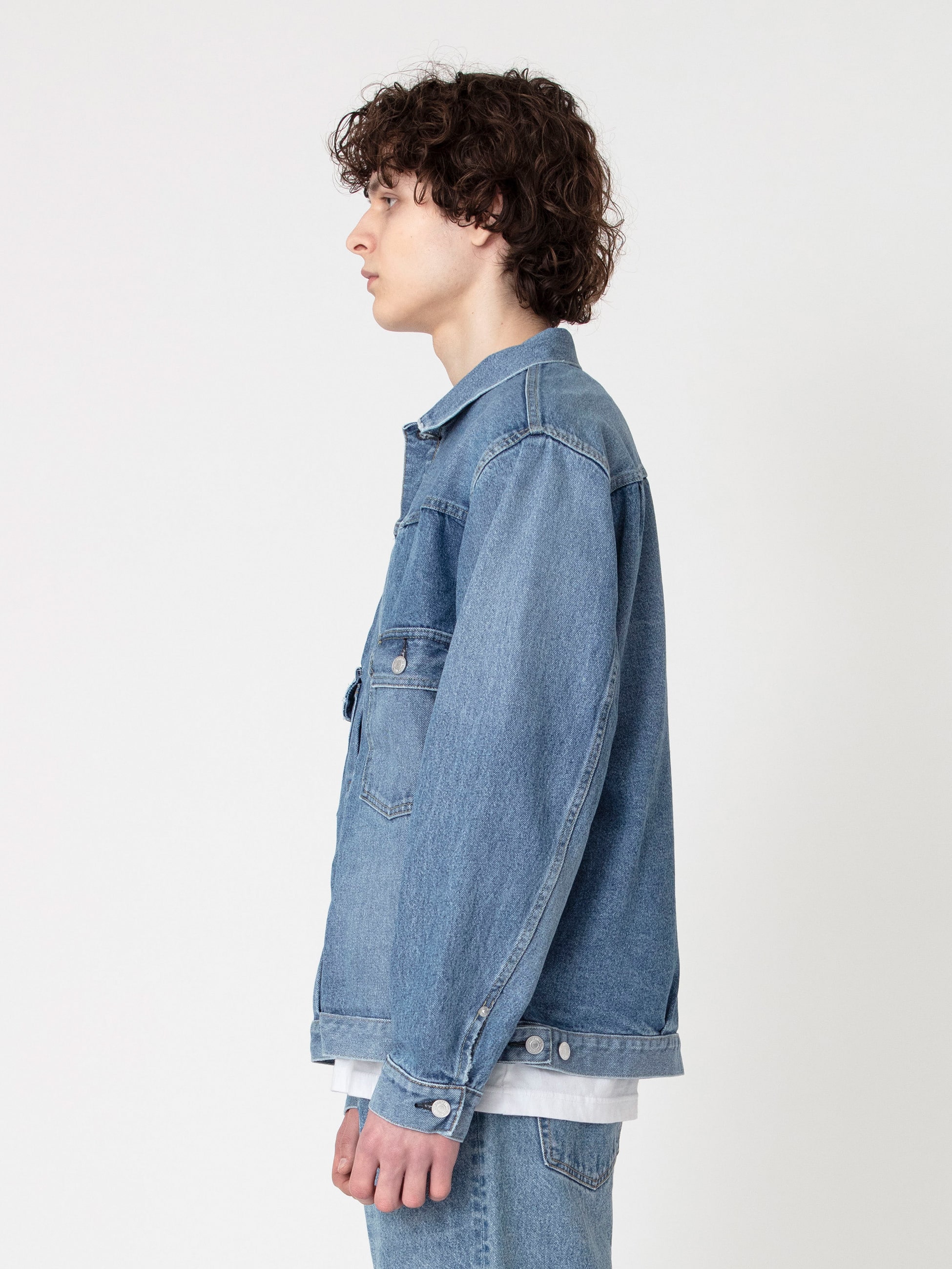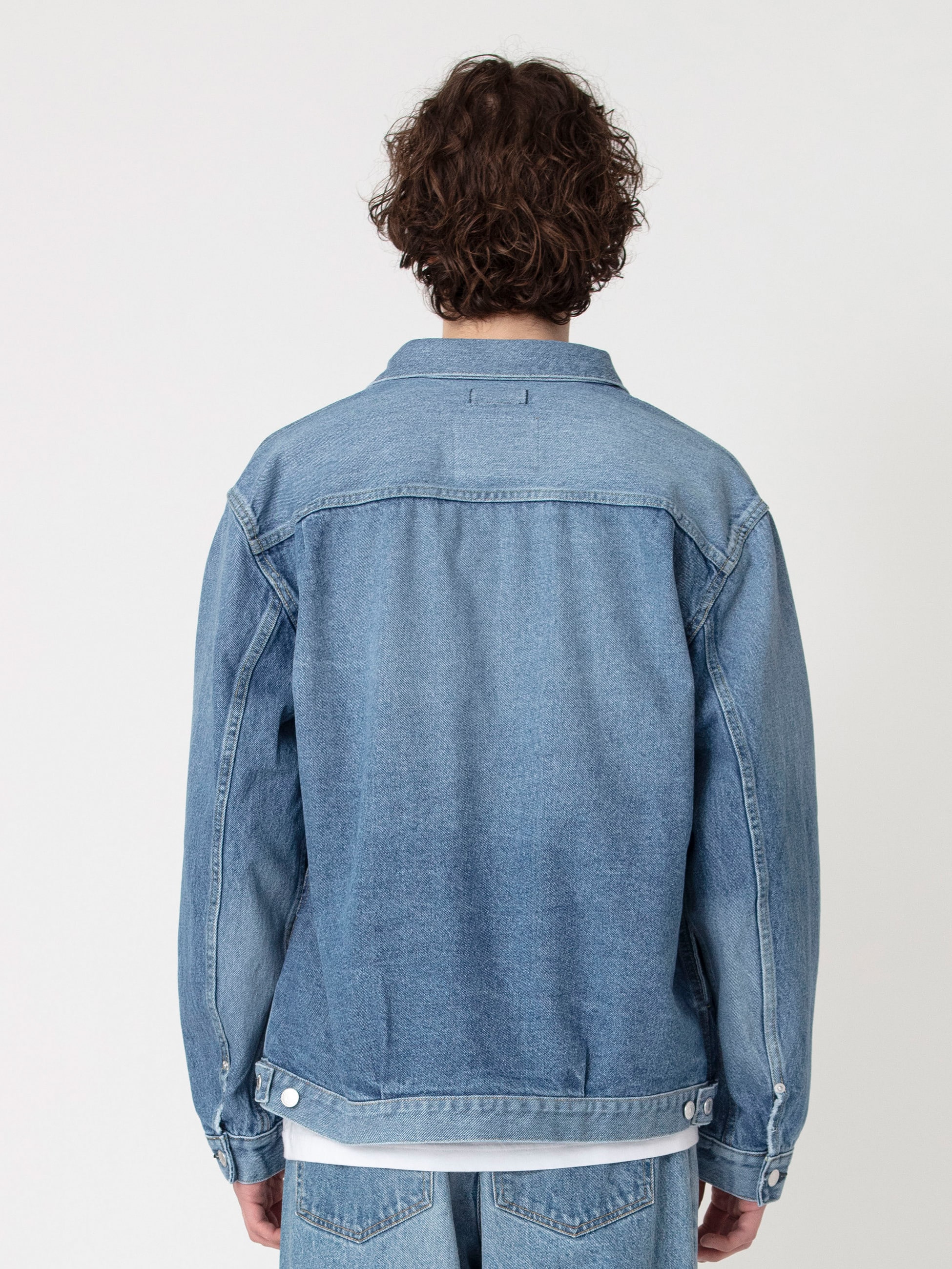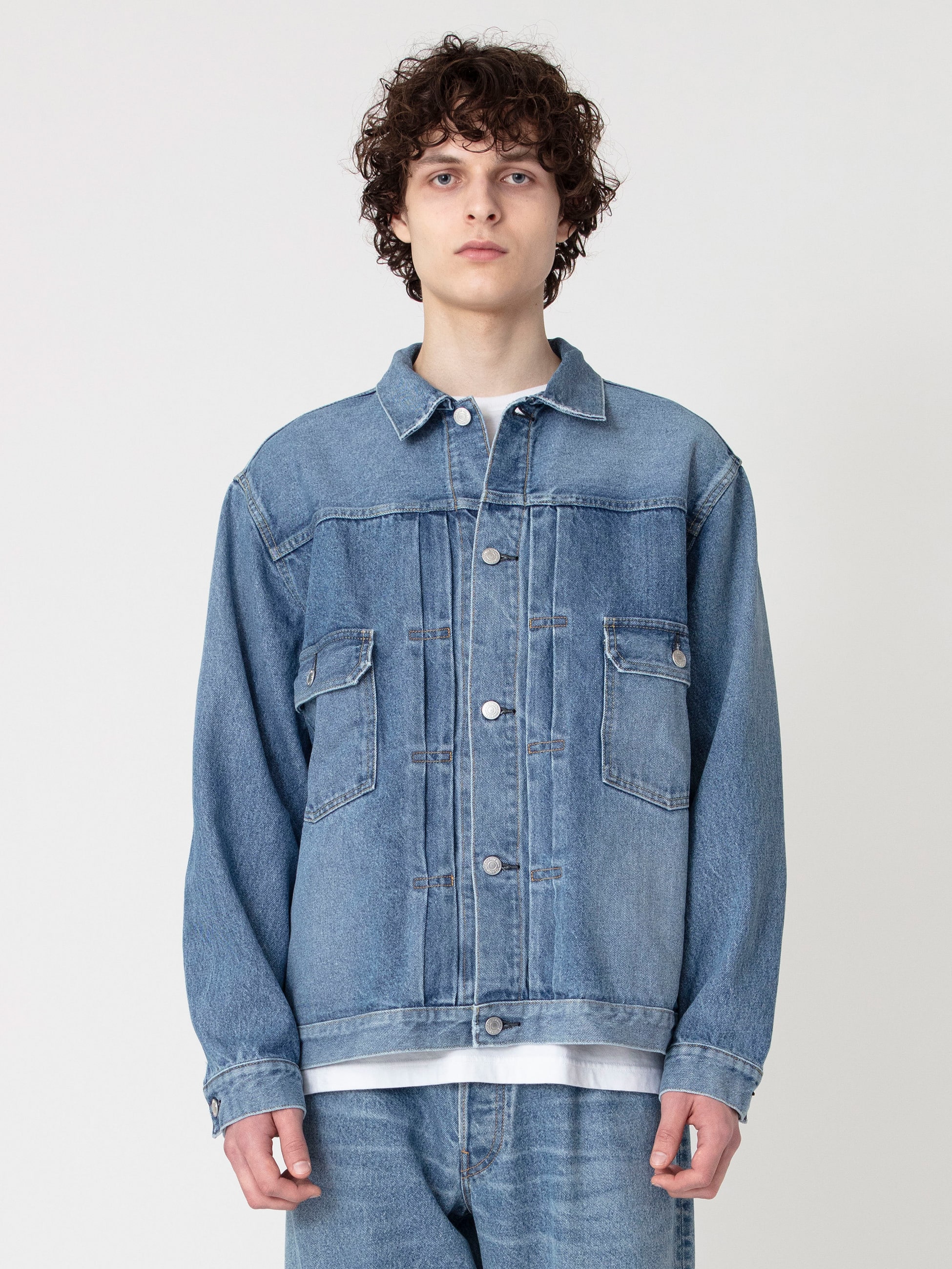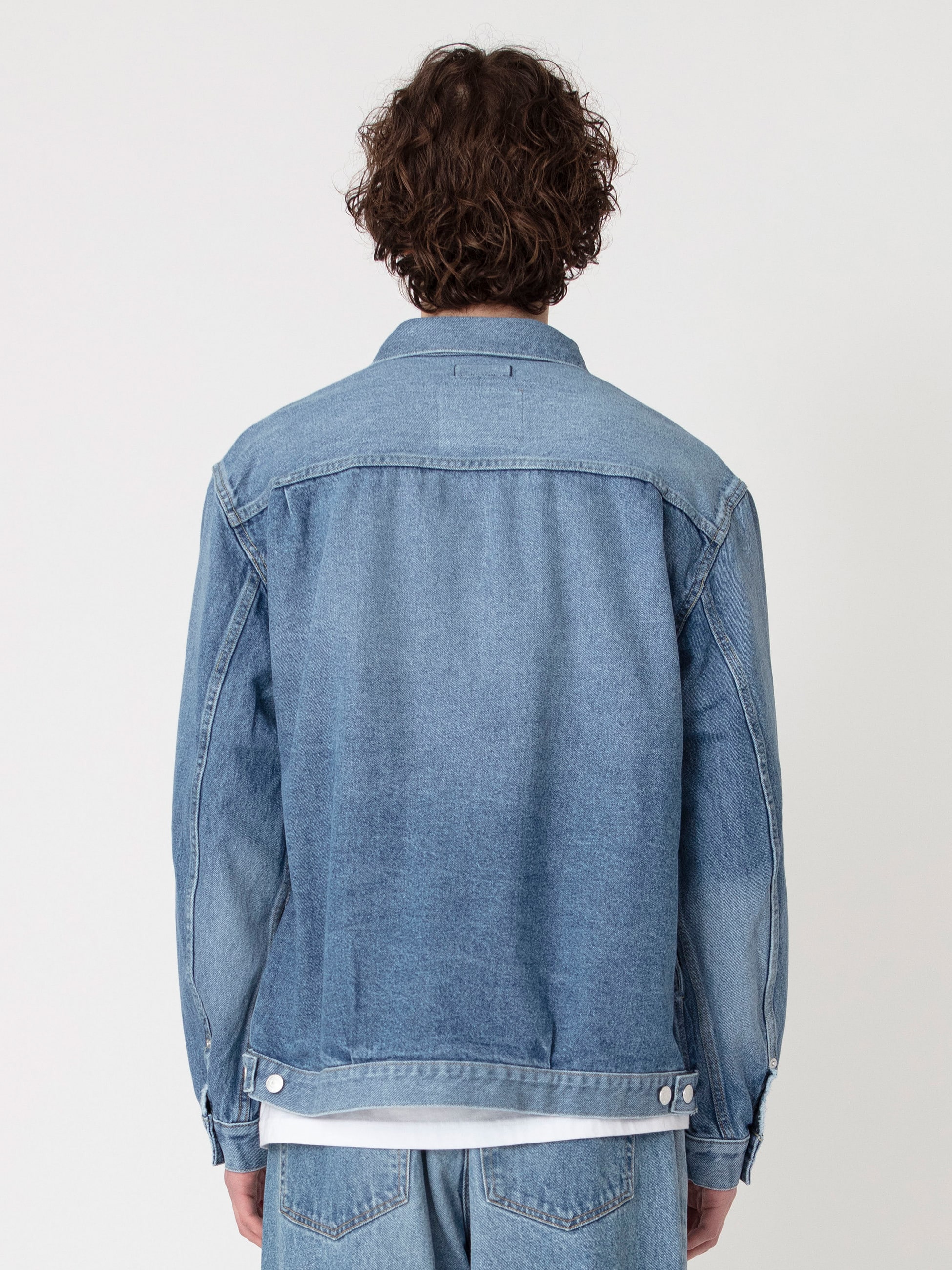 - オリジナルで製作されたデニム生地を使用した、2ndタイプをベースにしたデニムジャケット。国際的な認証プログラムであるGRS認証を受けたリサイクルコットン100%の素材を経糸と緯糸に採用した、サステナビリティに特化したつくりが特徴です。また、適度なウォッシュ加工とレーザー加工によってアタリとヒゲを表現した排水を抑えたつくりや、ラベルに使用したリサイクルレザーと付属品にもリサイクル素材を配した細部までこだわったつくりです。さらに、ピュアインディゴによるカラーリングや、ヴィンテージのような表情も魅力のひとつ。程よくすっきりとしたレギュラーフィットは、様々なコーディネートに合わせやすく、汎用性の高い一着です。