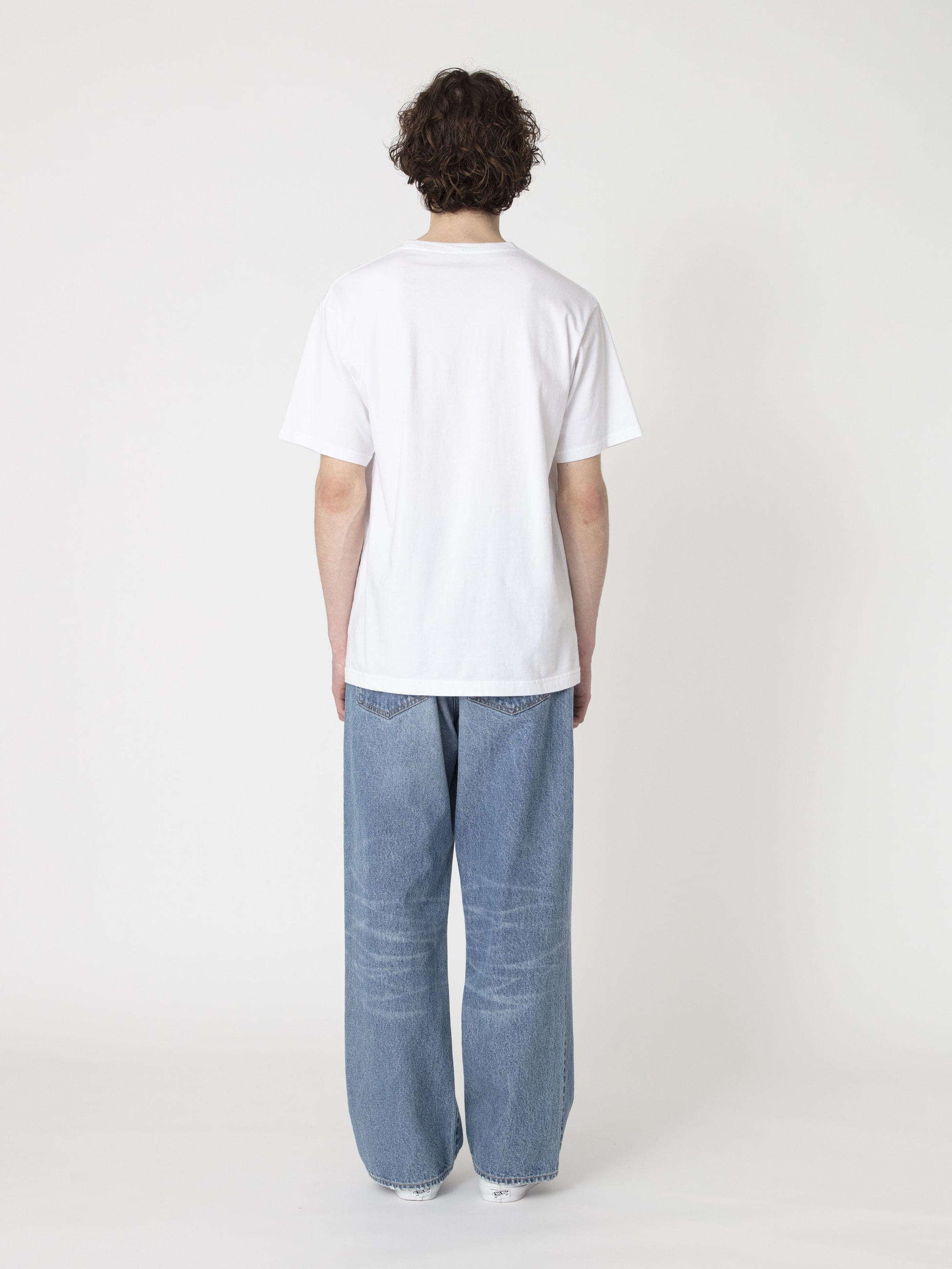 - オリジナルで製作されたデニム生地を使用したワイドフィットのデニムパンツ。国際的な認証プログラムであるGRS認証を受けたリサイクルコットン100%の素材を経糸と緯糸に採用した、サステナビリティに特化したつくりが特徴です。また、適度なウォッシュ加工とレーザー加工によってアタリとヒゲを表現した排水を抑えたつくりや、ラベルに使用したリサイクルレザーと付属品にもリサイクル素材を配した細部までこだわったつくりです。さらに、ピュアインディゴによるカラーリングや、ヴィンテージのような表情も魅力のひとつ。ゆったりとした快適な穿き心地のワイドフィットは、シンプルなコーディネートに取り入れやすく、汎用性の高い一着です。